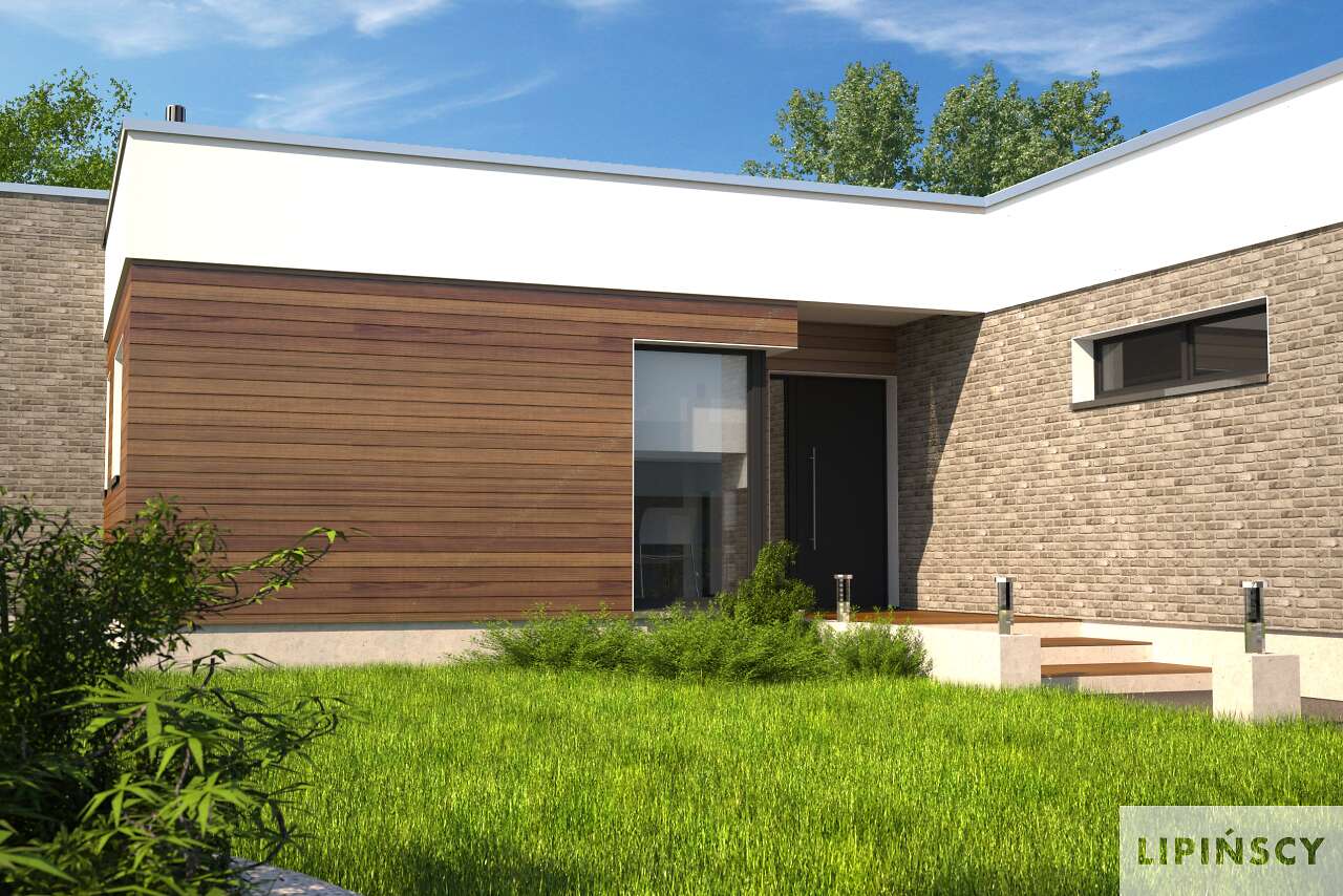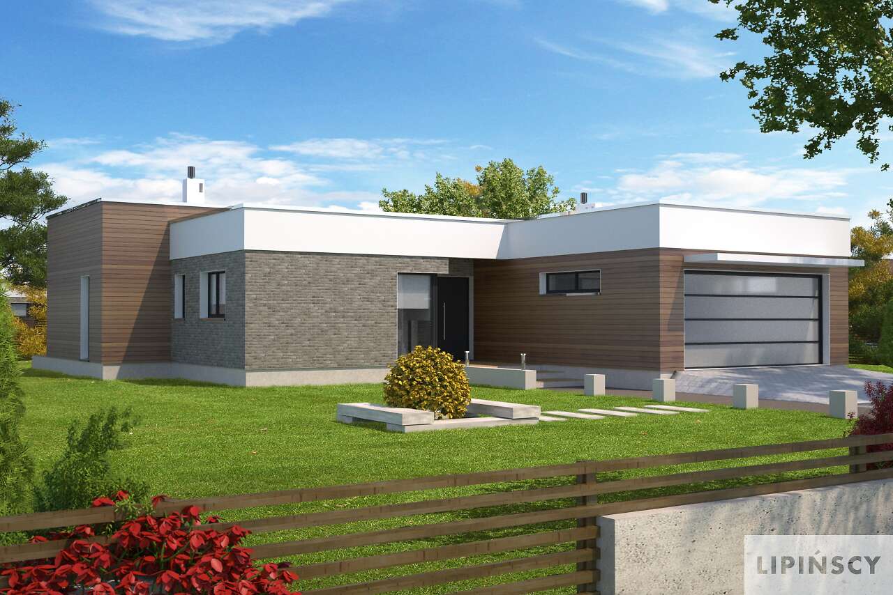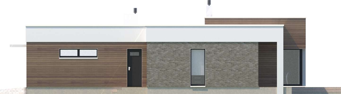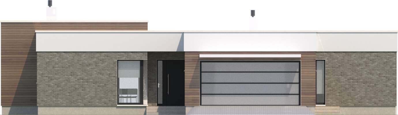 Wygodny, parterowy dom energooszczędny, o prostej, nowoczesnej bryle. Wnętrze kryje funkcjonalną kuchnię z miejscem na stół, obok kuchni zlokalizowano spiżarnię. Zaprojektowano także trzy sypialnie, w tym jedna z własną łazienką i garderobą oraz jedną wspólną, wygodną łazienkę, z wydzielonym miejscem na pralkę. Z przodu domu znajduje się garaż na dwa stanowiska, z pomieszczeniem gospodarczym oraz kotłownią. Dzięki takiej lokalizacji garażu, dom można wybudować na węższej działce, niż gdyby garaż dostawiono przy elewacji bocznej budynku.