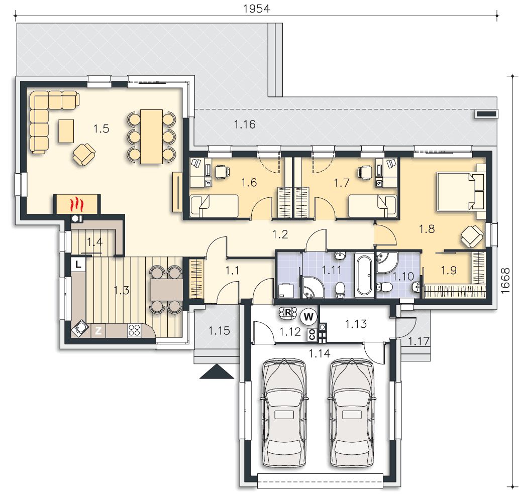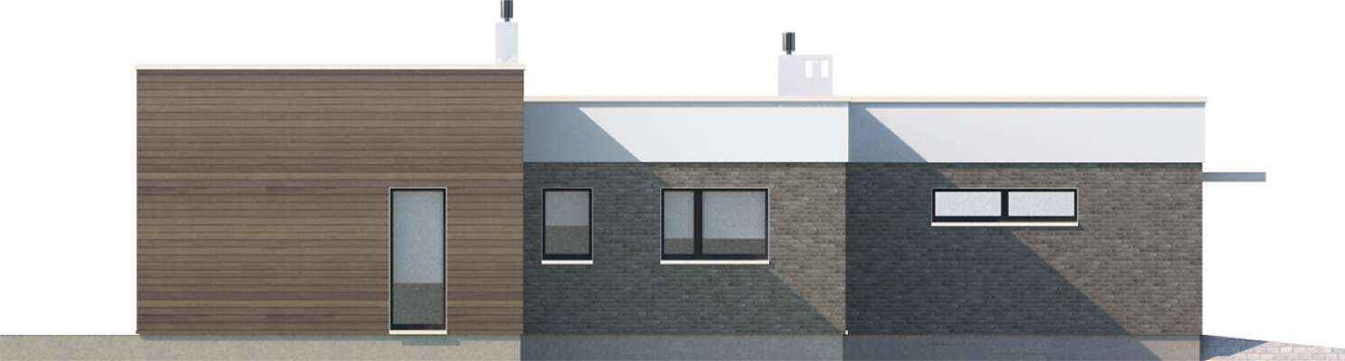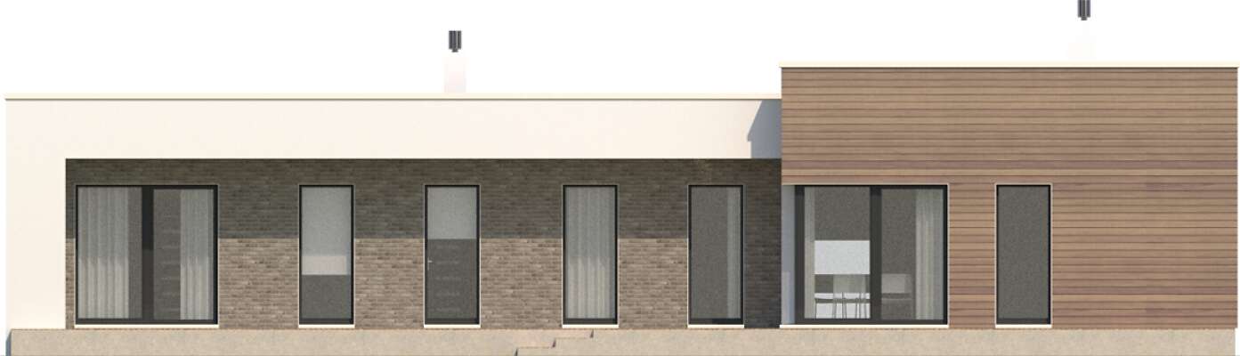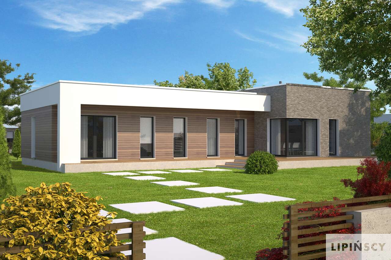 Wygodny, parterowy dom energooszczędny, o prostej, nowoczesnej bryle. Wnętrze kryje funkcjonalną kuchnię z miejscem na stół, obok kuchni zlokalizowano spiżarnię. Zaprojektowano także trzy sypialnie, w tym jedna z własną łazienką i garderobą oraz jedną wspólną, wygodną łazienkę, z wydzielonym miejscem na pralkę. Z przodu domu znajduje się garaż na dwa stanowiska, z pomieszczeniem gospodarczym oraz kotłownią. Dzięki takiej lokalizacji garażu, dom można wybudować na węższej działce, niż gdyby garaż dostawiono przy elewacji bocznej budynku.