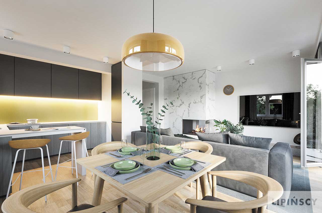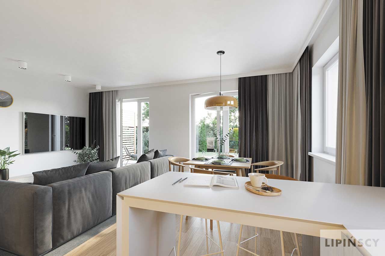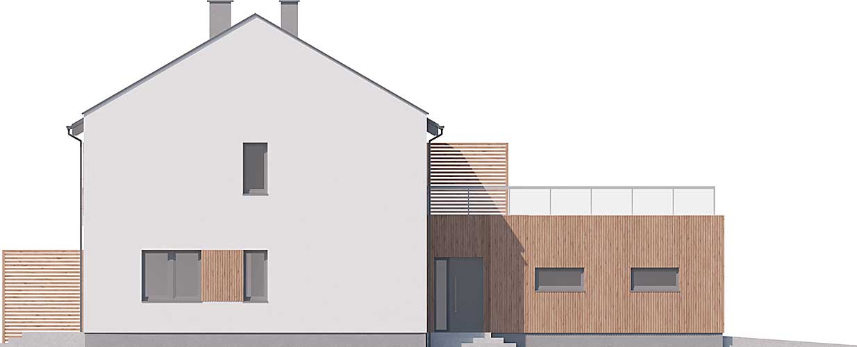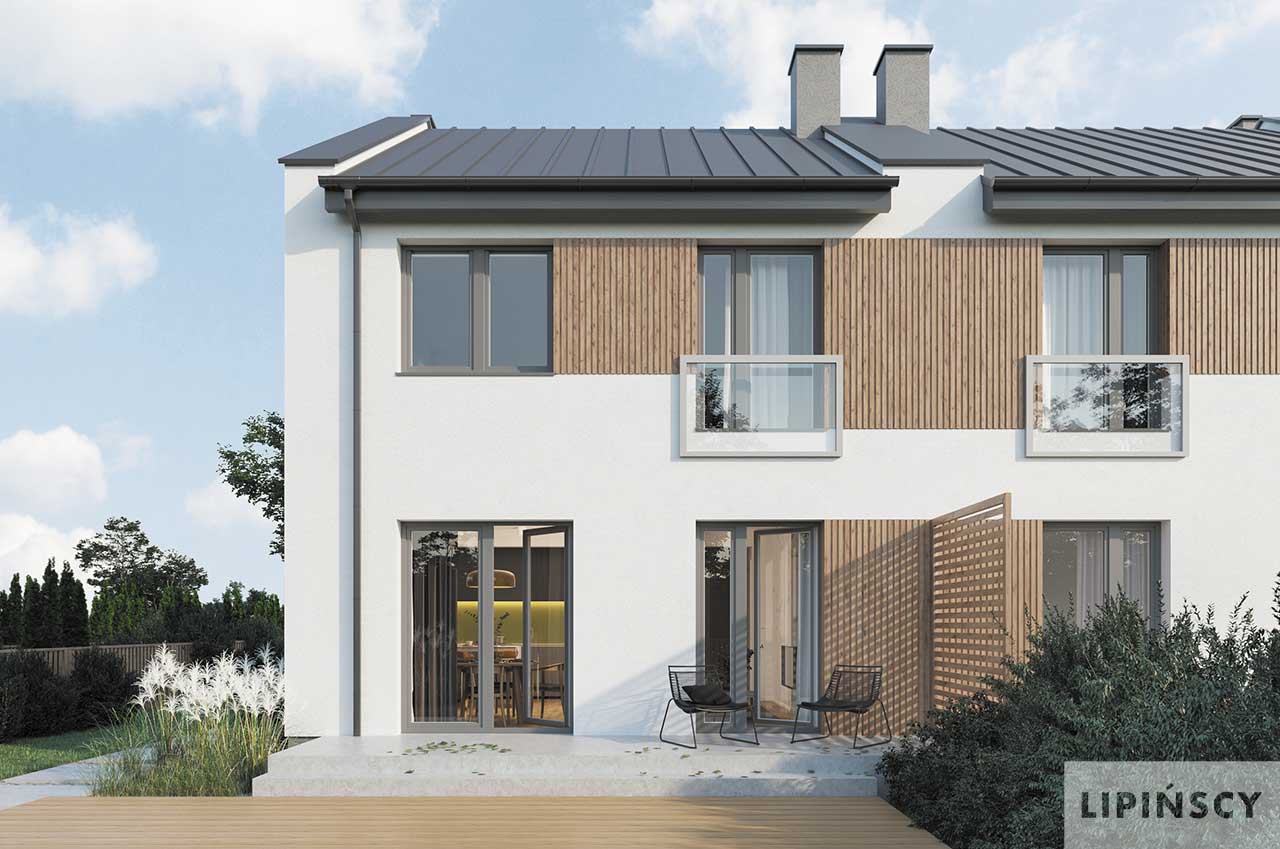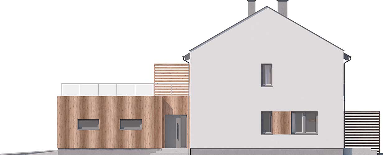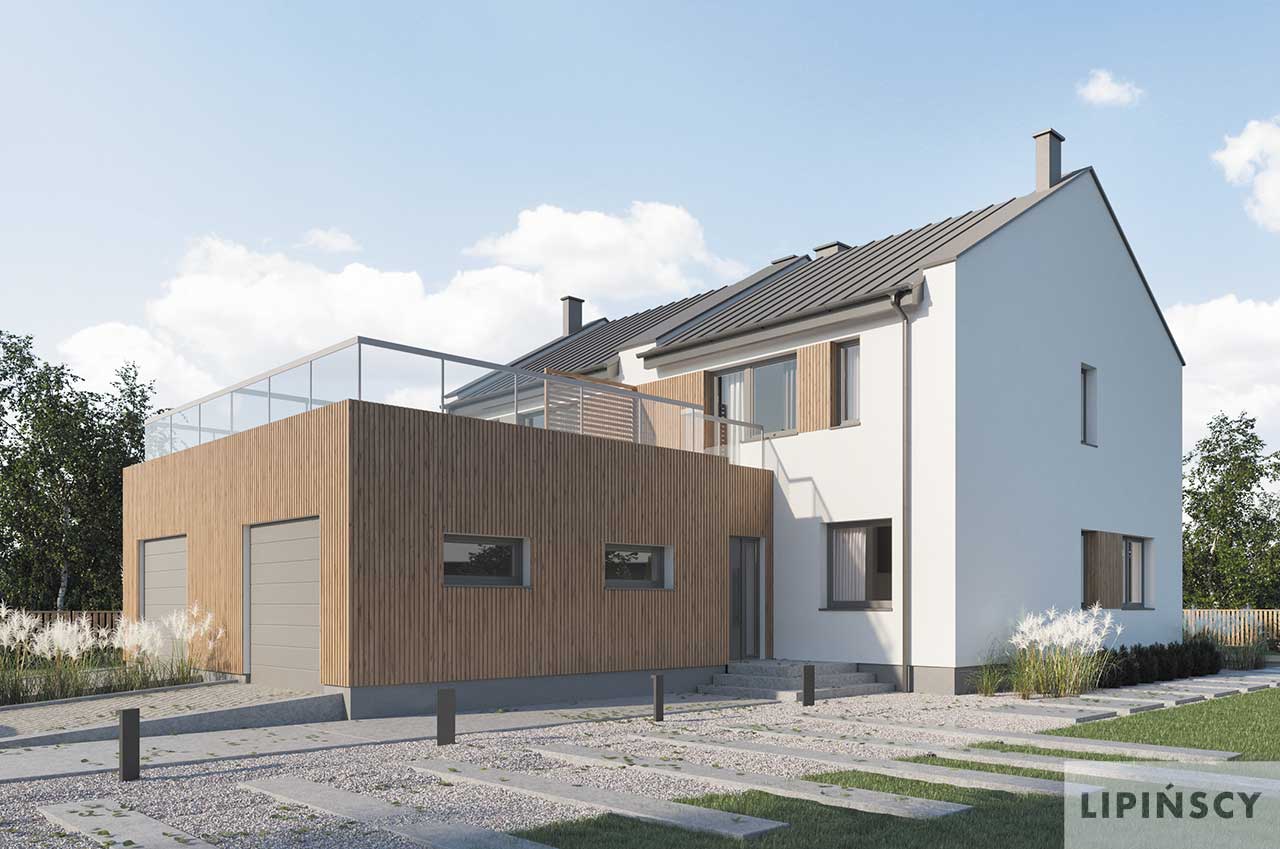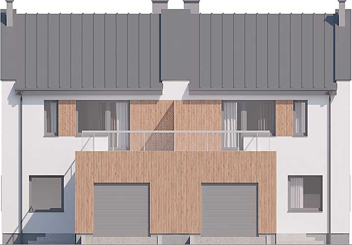 Projekt domu Norwich II to nowoczesny dom dwukondygnacyjny w zabudowie bliźniaczej z dwuspadowym dachem. Wysunięty do przodu garaż umożliwi usytuowanie domu na wąskiej działce. Wejście do domu jest osłonięte i wygodnie schowane pod dachem, i łączy się w wiatrołapie z wejściem do garażu. Wnętrze domu jest przestronne i oferuje ponad 30-sto metrową przestrzeń dzienną, dodatkowy pokój na parterze oraz 3 sypialnie, w tym jedną z garderobą i łazienkę na poddaszu. W projekcie przewidziano ogrzewanie kotłem na gaz. Możliwa jest zmiana ogrzewania na pompę ciepła.