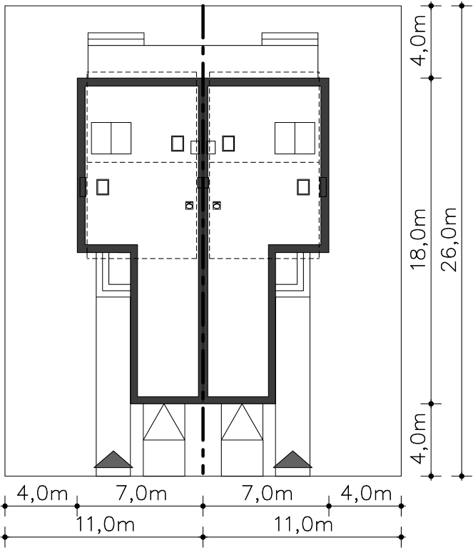 Grafika przedstawia minimalne wymiary działki. Aby sprawdzić, czy dom może być realizowany na konkretnej działce należy uzyskać Wypis i Wyrys z Miejscowego Planu Zagospodarowania Przestrzennego lub jeśli na danym terenie nie ma planu – Decyzję o warunkach zabudowy. Wszystkie projekty wymagają adaptacji do warunków miejscowych przez projektanta lokalnego.