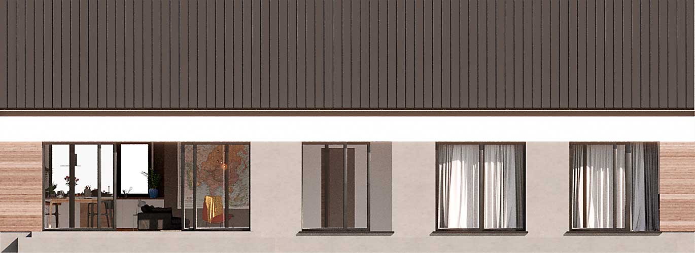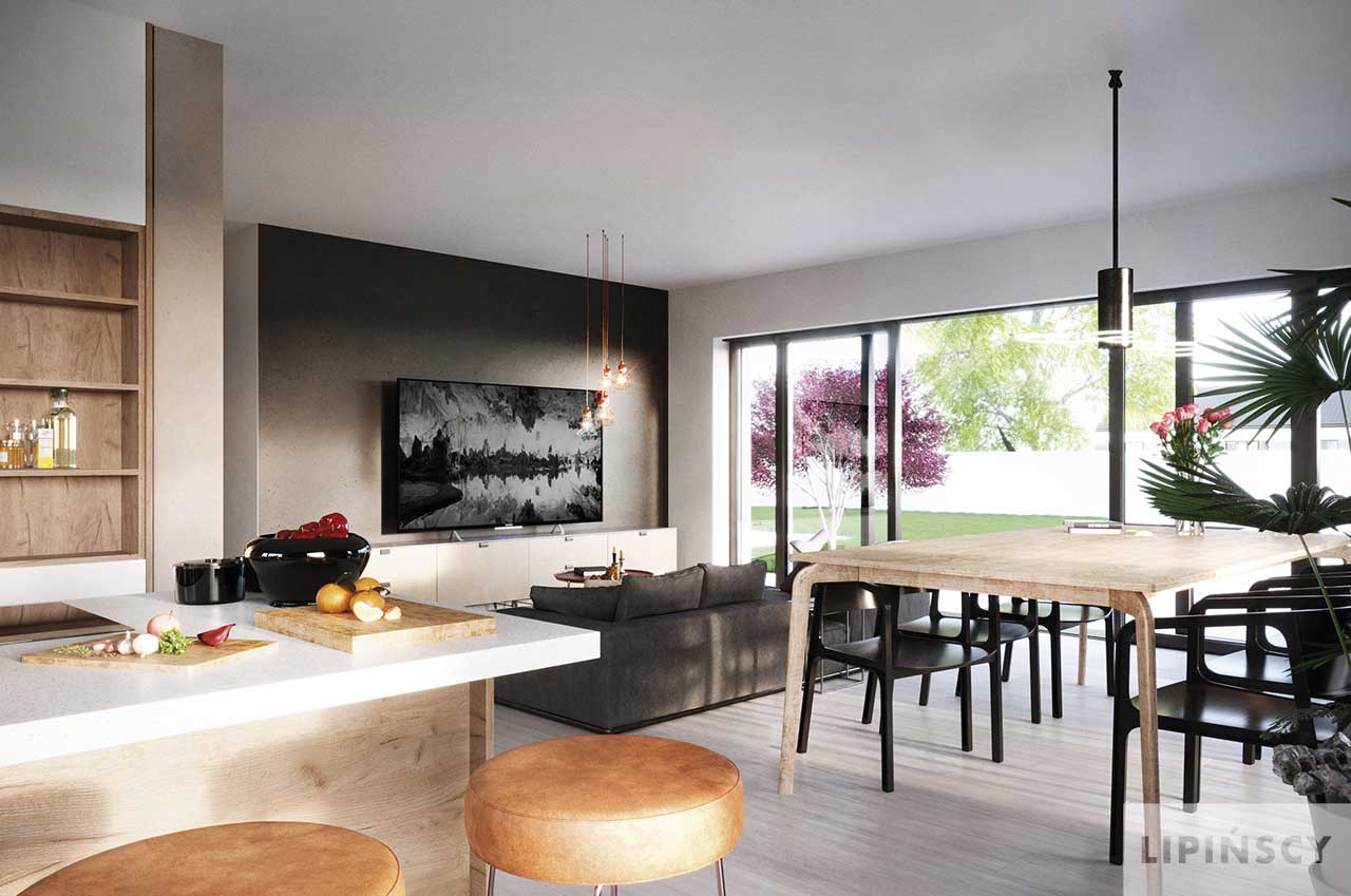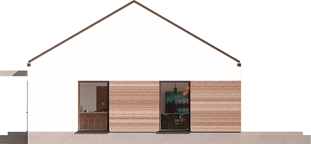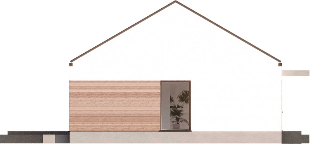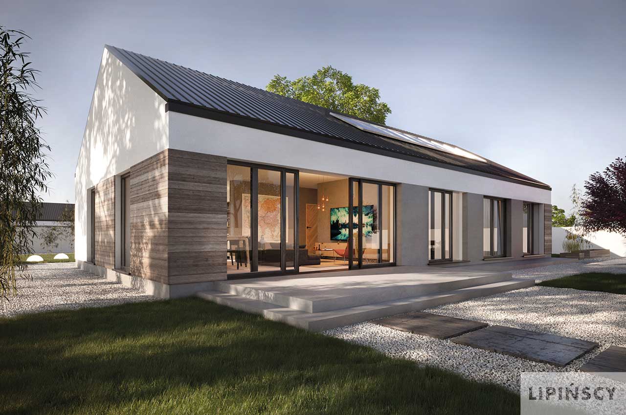 Projekt nowoczesnego parterowego domu w stylu stodoły, który będzie niedrogi w realizacji, a zapewni wygodne mieszkanie rodzinie 2+2. Duże okna tarasowe zlokalizowane od strony południowej zapewnią maksymalną ilość światła słonecznego i spore zyski energetyczne w zimie oraz bezpośredni dostęp wszystkich pokoi do ogrodu. Otwarta strefa dzienna sprzyja spotkaniom rodzinnym i towarzyskim. Część prywatna mieści trzy sypialnie w tym Master Bedroom i wspólną łazienkę. Funkcję domu uzupełniają: pralnia i pomieszczenie gospodarcze. W projekcie przewidziano ogrzewanie pompą ciepła.