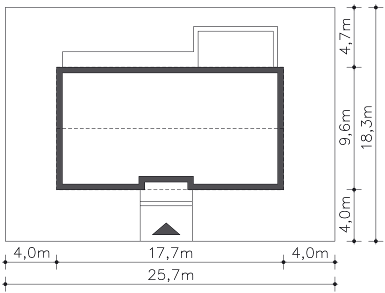Grafika przedstawia minimalne wymiary działki. Aby sprawdzić, czy dom może być realizowany na konkretnej działce należy uzyskać Wypis i Wyrys z Miejscowego Planu Zagospodarowania Przestrzennego lub jeśli na danym terenie nie ma planu – Decyzję o warunkach zabudowy. Wszystkie projekty wymagają adaptacji do warunków miejscowych przez projektanta lokalnego.