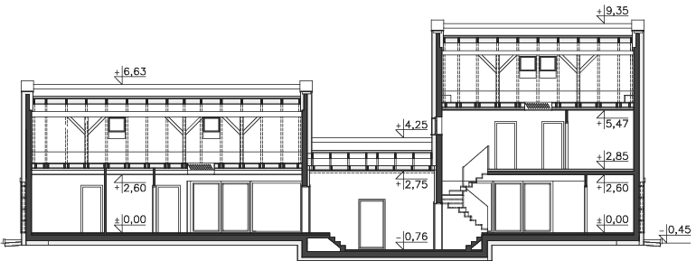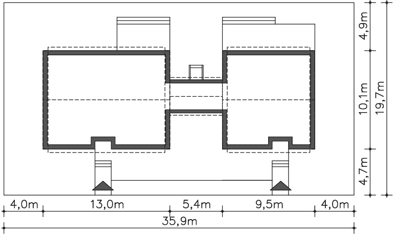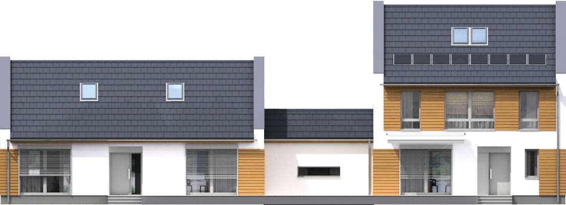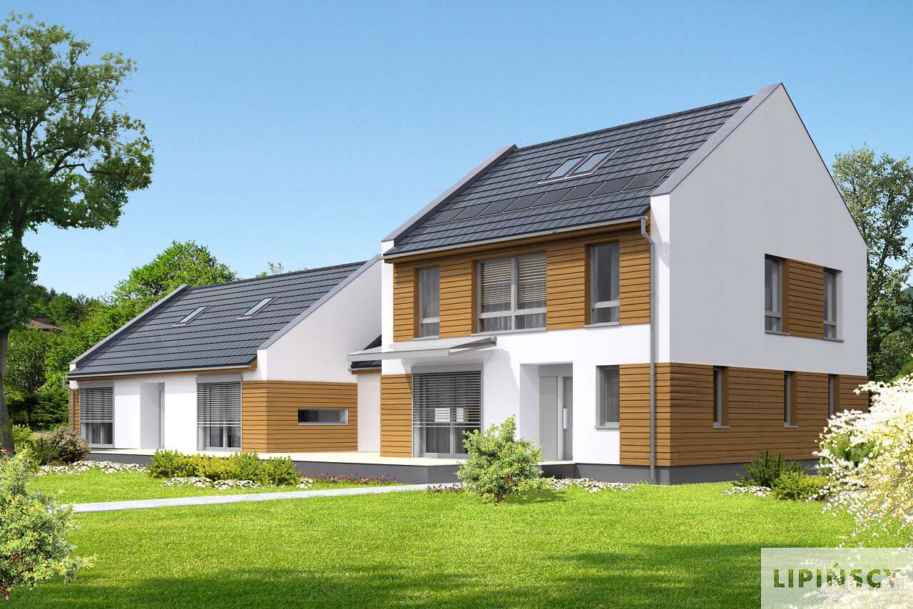 Projekt dwulokalowego domu energooszczędnego, który można zlokalizować na jednej działce, a jednocześnie zachować prywatność. Dom składa się z dwóch części, połączonych praktycznym łącznikiem. Pierwsza część to mniejsza część parterowa, idealna dla seniorów, druga zaś – dom z użytkowym poddaszem, z przeznaczeniem dla większej rodziny. Całość jest spójna pod względem architektonicznym i stylistycznym.