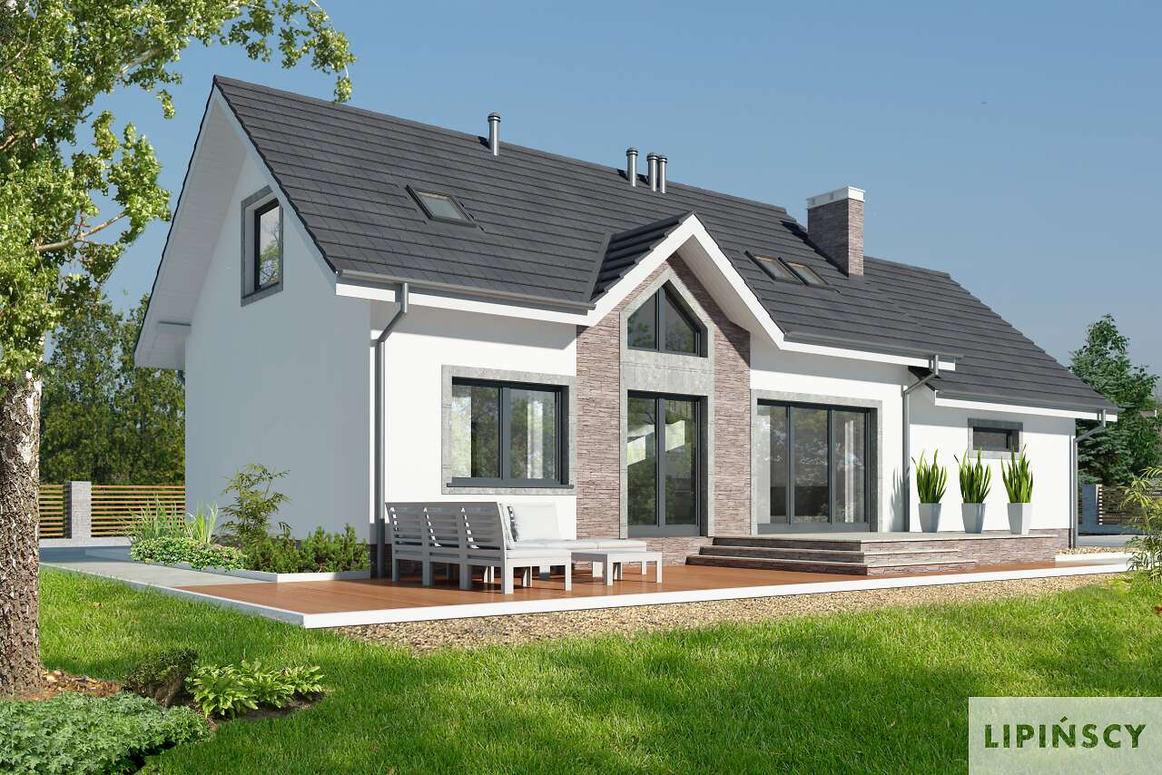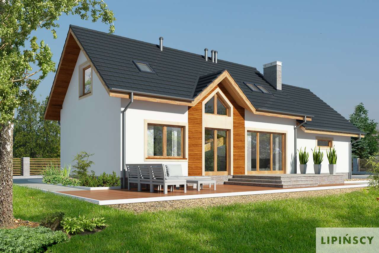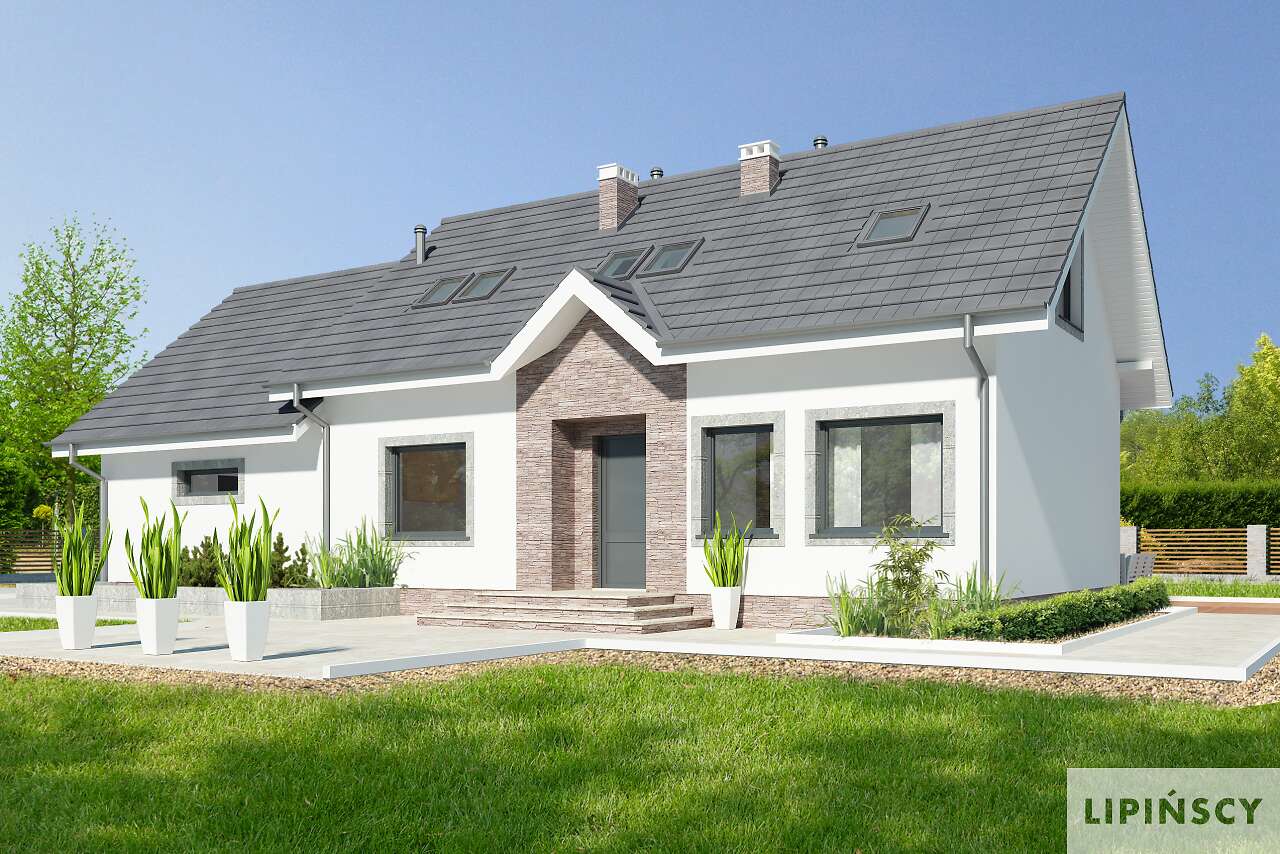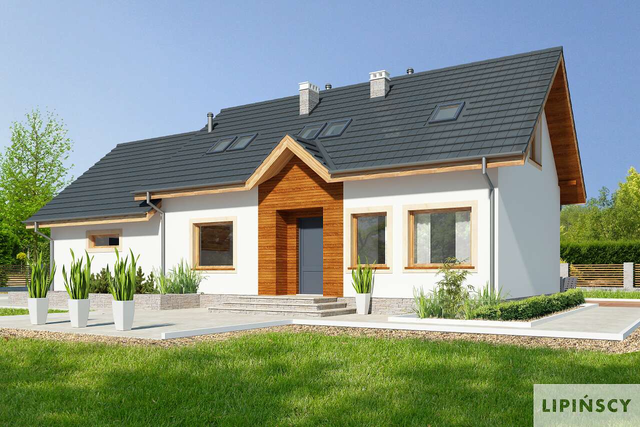 Wygodny dom z użytkowym poddaszem, w którym wjazd do garażu usytuowano od strony bocznej elewacji. Taki układ pozwala na wybudowanie domu na niezbyt głębokiej działce. Do dyspozycji mieszkańców jest wygodna, pół zamknięta kuchnia, salon z kominkiem i wydzielonym miejscem na duży stół, dwie dodatkowe sypialnie i łazienka Na poddaszu znajdują się trzy dodatkowe pokoje, w tym jedna duża sypialnia, dwie mniejsze oraz przydatne pomieszczenie gospodarcze. Prosta bryła i konstrukcja sprawiają, że dom jest nieskomplikowany w budowie, a przy tym wygodny w użytkowaniu.
