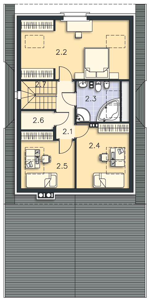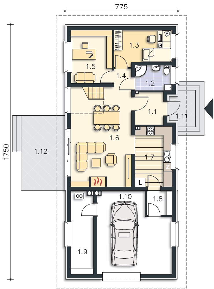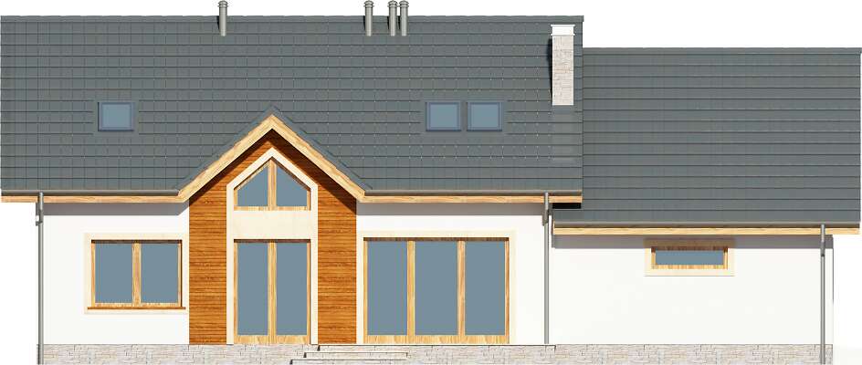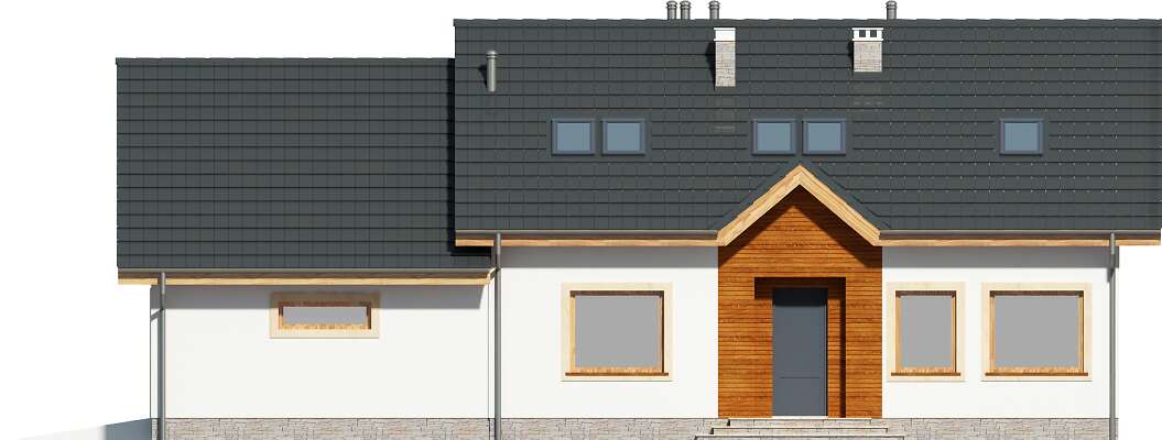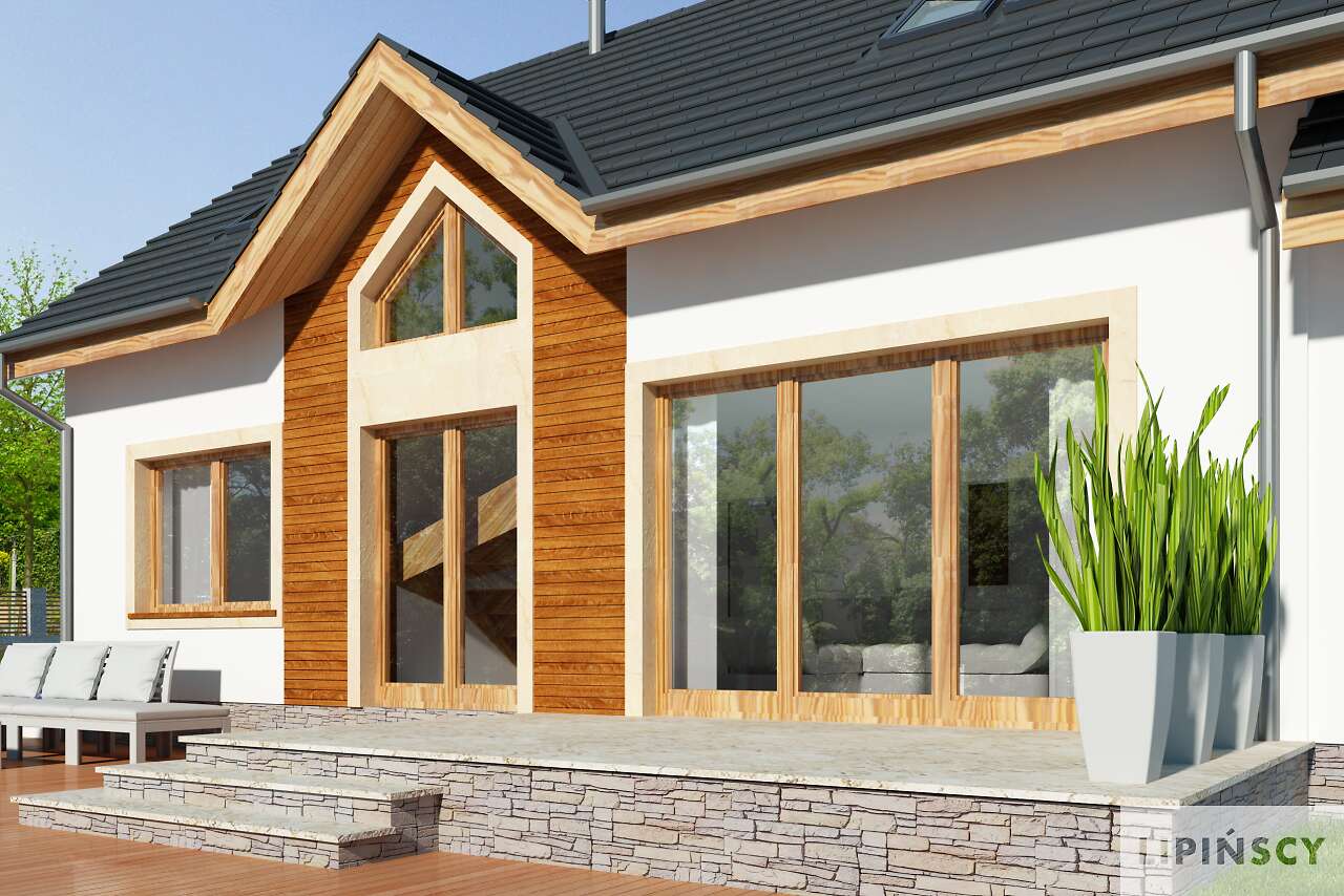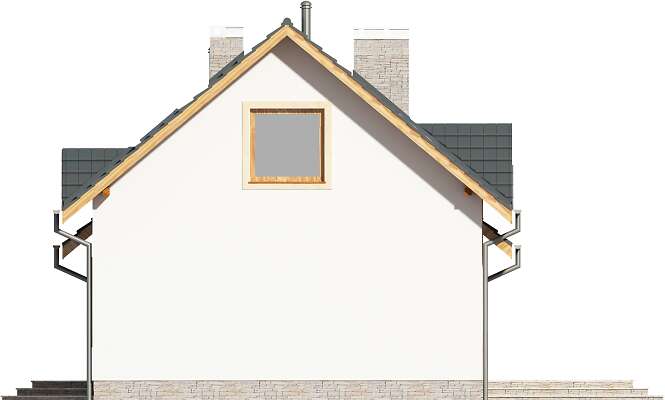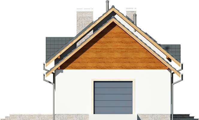Wygodny dom z użytkowym poddaszem, w którym wjazd do garażu usytuowano od strony bocznej elewacji. Taki układ pozwala na wybudowanie domu na niezbyt głębokiej działce. Do dyspozycji mieszkańców jest wygodna, pół zamknięta kuchnia, salon z kominkiem i wydzielonym miejscem na duży stół, dwie dodatkowe sypialnie i łazienka Na poddaszu znajdują się trzy dodatkowe pokoje, w tym jedna duża sypialnia, dwie mniejsze oraz przydatne pomieszczenie gospodarcze. Prosta bryła i konstrukcja sprawiają, że dom jest nieskomplikowany w budowie, a przy tym wygodny w użytkowaniu.