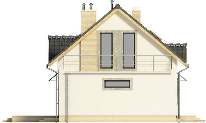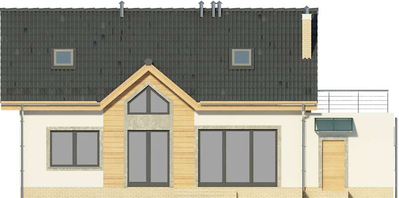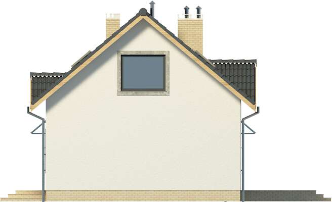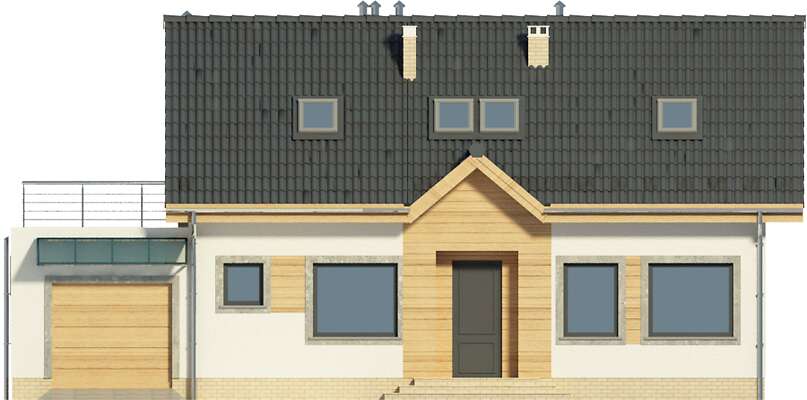 Intrygujący i ekonomiczny dom wolnostojący. Na parterze rozplanowano zarówno strefę wypoczynku jak i sypialnie, dzięki czemu poddasze może być ewentualnie zagospodarowane w późniejszym etapie. W pokoju dziennym jest kominek i duże przeszklenia tarasu. Otwarta kuchnia ma wygodne pomieszczenie gospodarcze i bezpośrednie przejście do garażu. Sypialnie na parterze są w bliskości łazienki, co zapewnia wymaganą intymność. Przestronne poddasze to dodatkowe trzy sypialnie oraz ładna łazienka i taras.