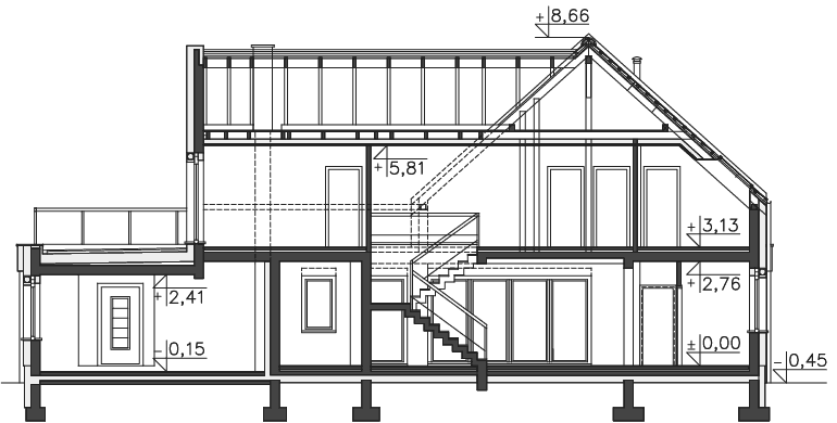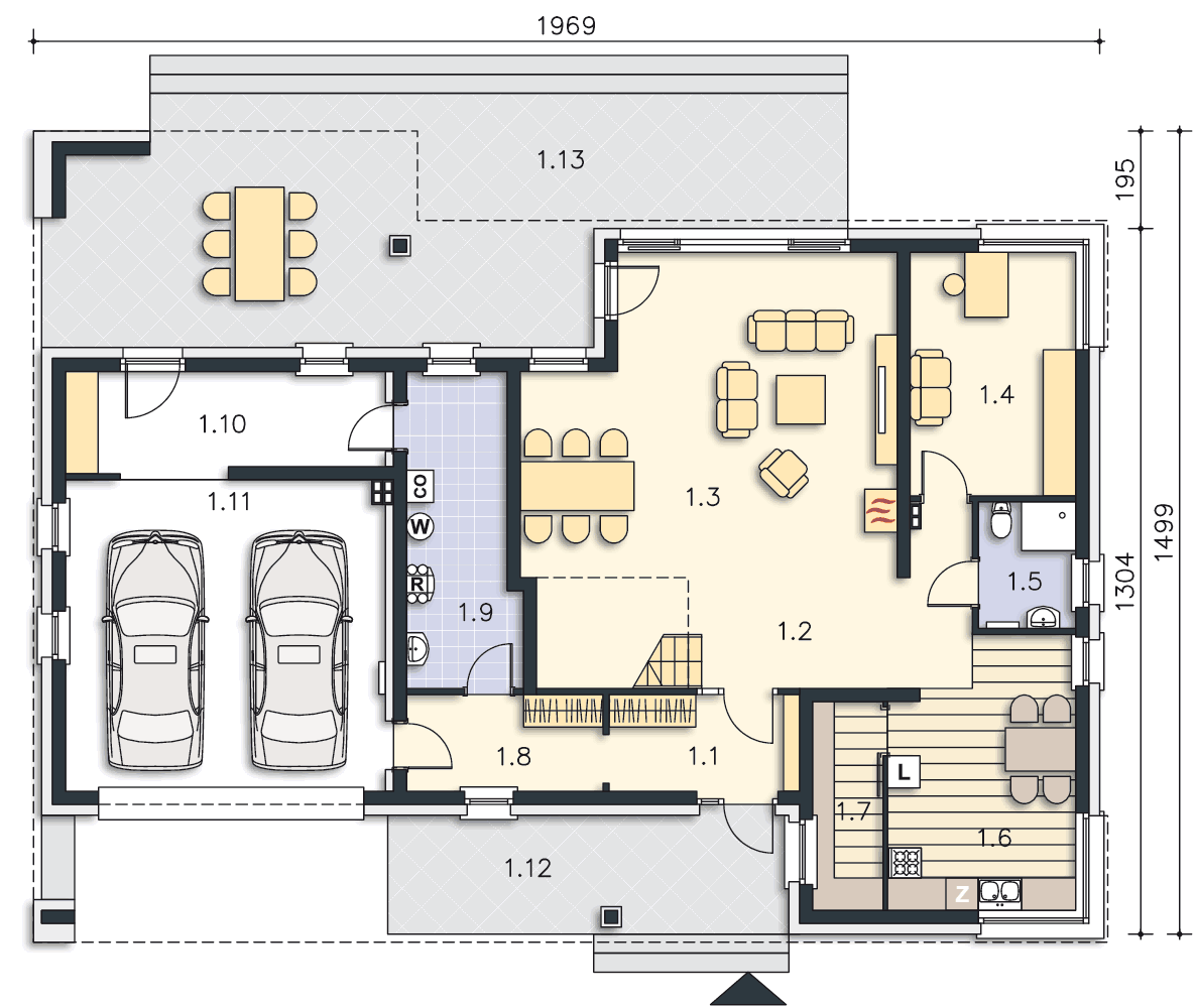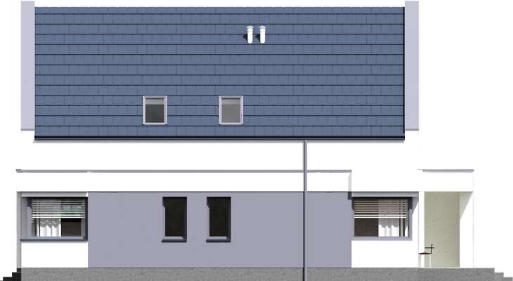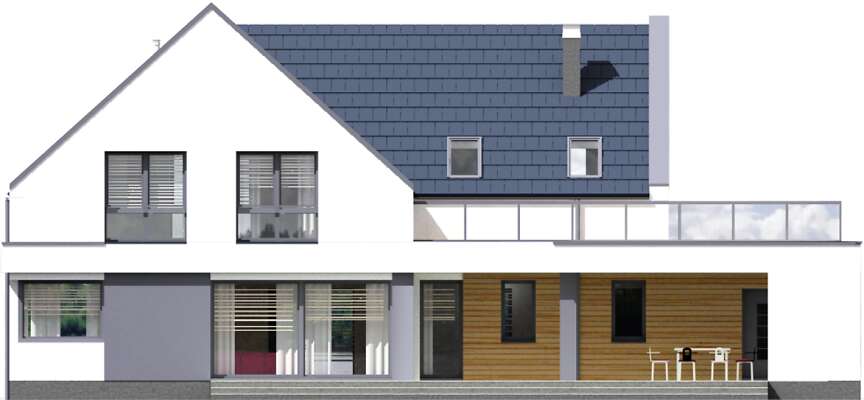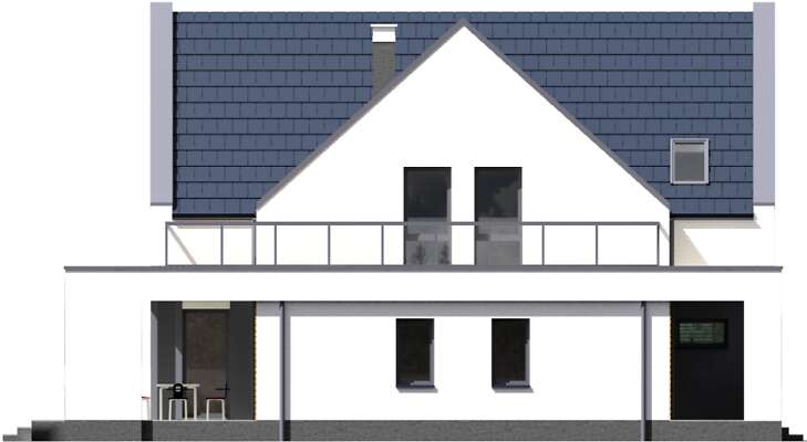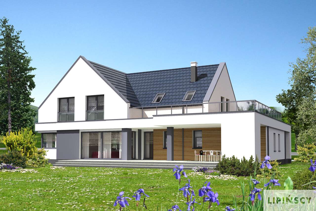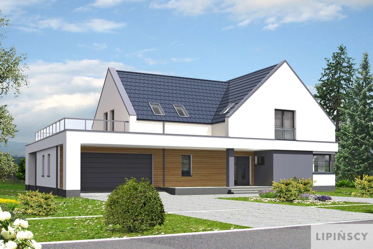 Imponująca przestrzeń i prosta bryła tego domu zachwyci na pewno entuzjastów praktycznych rozwiązań. Dom energooszczędny o nowoczesnym wyglądzie i funkcjonalnym wnętrzu idealny dla 4-5-osobowej rodziny. Na parterze do dyspozycji mieszkańców jest słoneczny salon z jadalnią, zamknięta kuchnia z niezbędną spiżarnią, gabinet oraz łazienka. Część gospodarczą stanowi dwustanowiskowy garaż, duża kotłownia i pomieszczenie techniczne. Na poddaszu mamy trzy wygodne sypialnie - każda z własną garderobą oraz dużą łazienkę, pralnię i dodatkowy pokój mogący pełnić funkcję czwartej sypialni, pokoju gościnnego lub gabinetu. Niewątpliwym atutem tego projektu jest ogromny taras, z którego rozpościera się widok na okolicę.