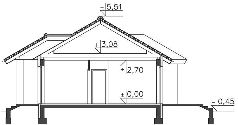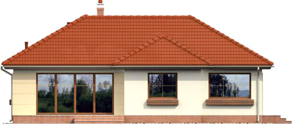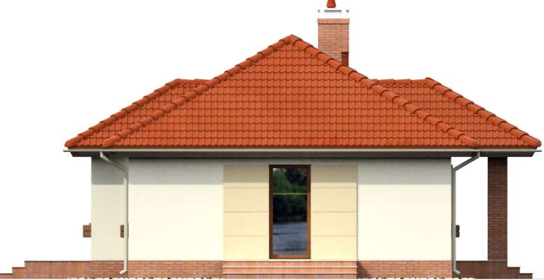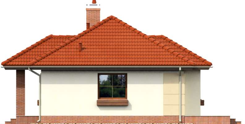 Ciekawa propozycja funkcjonalnego, niewielkiego domu parterowego. Zwarta, prosta bryła przekryta została czterospadowym dachem. Jasna elewacja, z delikatnymi akcentami piaskowego brązu nadaje bryle lekkości. Sercem domu jest salon z dużymi, przeszklonymi drzwiami wyjściowymi na taras i otwarta na niego kuchnia. To głównie w tym obszarze koncentruje się życie rodzinne. Przy kuchni przewidziano pomieszczenie gospodarcze z kotłem grzewczym. Do dyspozycji mieszkańców są także trzy sypialnie i wygodna łazienka. Takie rozplanowanie przestrzeni, z wyraźnym podziałem na strefę dzienną i nocną, czyni ten dom bardzo wygodnym w użytkowaniu.