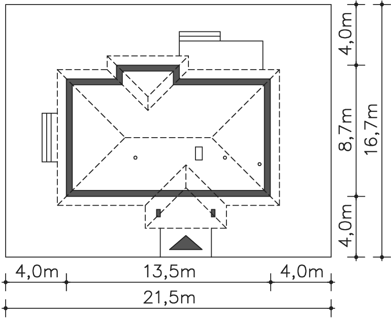 Grafika przedstawia minimalne wymiary działki. Aby sprawdzić, czy dom może być realizowany na konkretnej działce należy uzyskać Wypis i Wyrys z Miejscowego Planu Zagospodarowania Przestrzennego lub jeśli na danym terenie nie ma planu – Decyzję o warunkach zabudowy. Wszystkie projekty wymagają adaptacji do warunków miejscowych przez projektanta lokalnego.