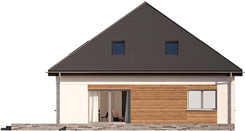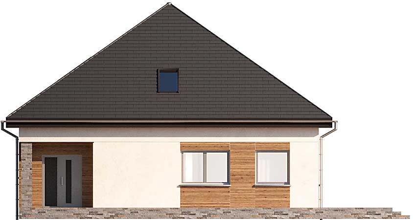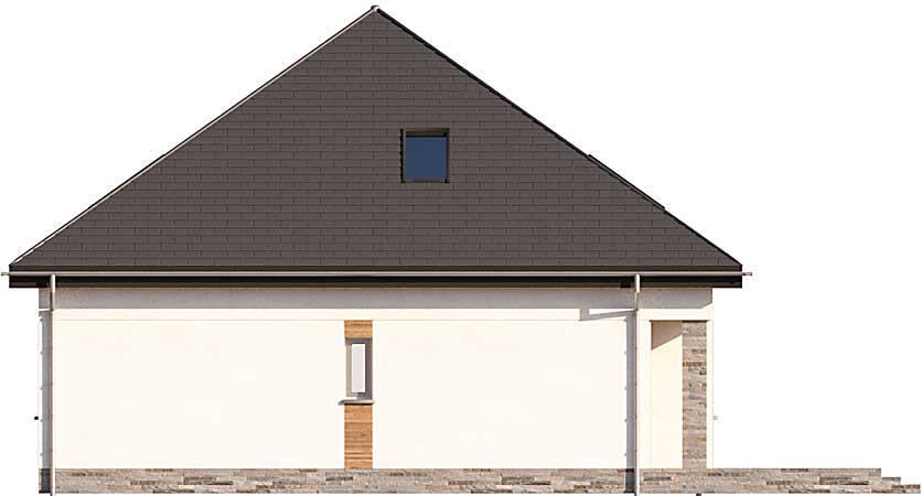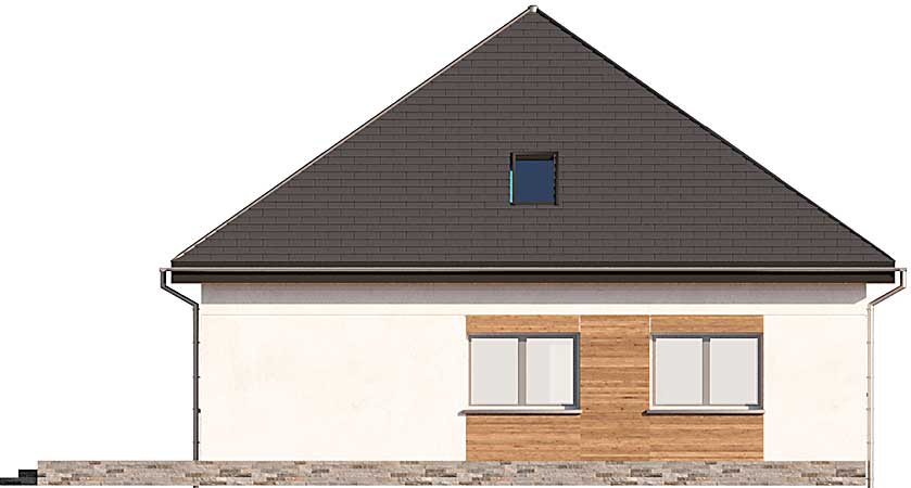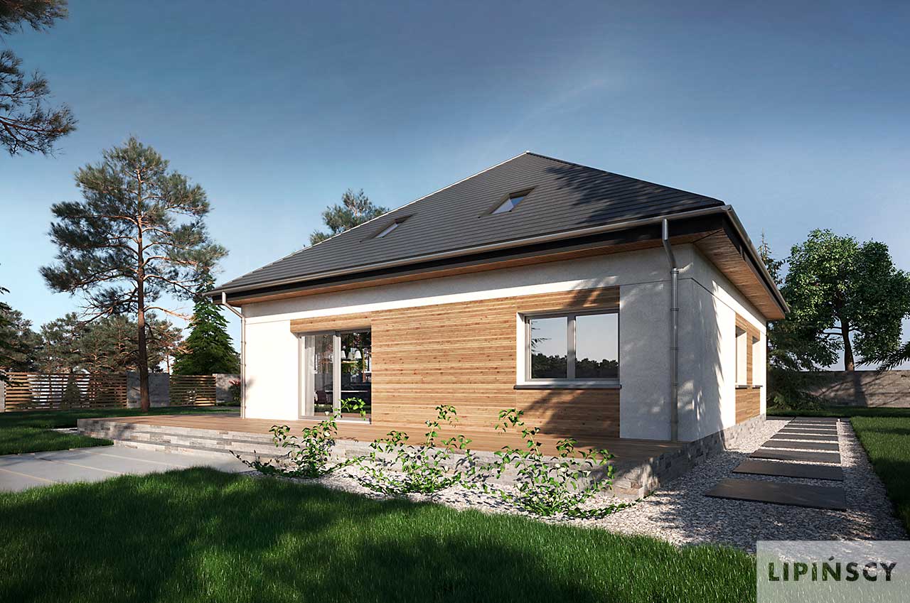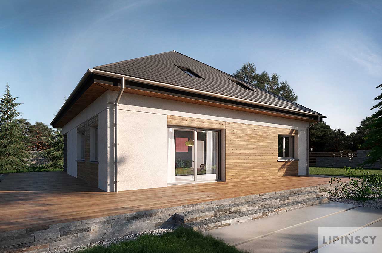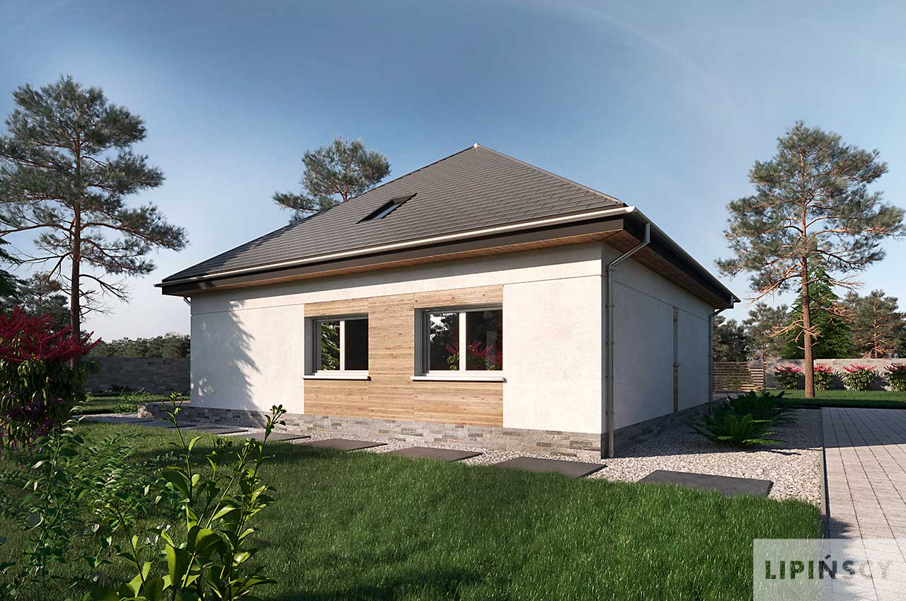 Energooszczędny projekt domu z poddaszem Oradea został zaprojektowany na planie kwadratu i przekryty czterospadowym dachem. Układ budynku rozplanowano wokół centralnie umieszczonej klatki schodowej z otwartą strefą dzienną z kominkiem i trzema pokojami na parterze. Dwa z nich wydzielono jako sypialnie przy łazience, a do jednego jest wejście bezpośrednio z salonu, dlatego może służyć jako gabinet lub okazjonalnie jako pokój gościnny. Duże pomieszczenie gospodarcze między kuchnią a wejściem kryje energooszczędne instalacje: pompę ciepła ze zbiornikiem na wodę oraz rekuperator. Tuz przy wejściu znajduje się jeszcze wc. Góra to strefa prywatna gospodarzy, która przyjęła formę ogromnego Master Bedroom z sypialnią, obszerną garderobą oraz komfortową łazienką.
