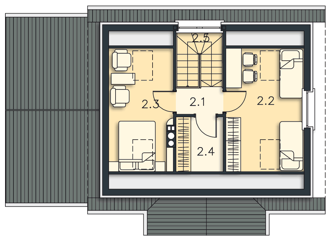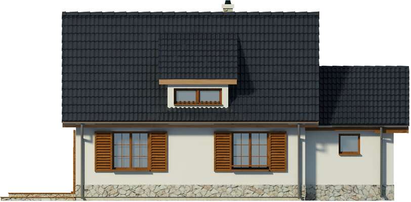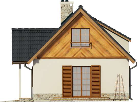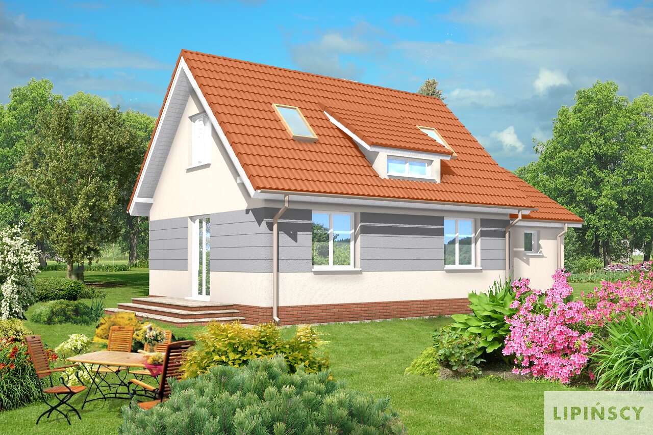 Wdzięczny, mały, ale bardzo funkcjonalny domek z garażem dla niedużej rodziny. Na niewielkiej powierzchni mieszczą się cztery pokoje, kuchnia, łazienka i garaż. Z zadaszonego ganku przechodzi się do wiatrołapu, przy którym jest łazienka z kotłem c.o. Pokój dzienny stanowi przestrzeń integrującą życie rodziny. Jest tu miejsce na kominek, kącik wypoczynkowy, stół jadalniany i wydzieloną część kuchenną. Obok znajduje się jedna sypialnia. Drewniane schody prowadzą na poddasze, gdzie są dwie sypialnie i garderoba. Sypialnie są wystarczająco wygodne i ustawne, a garderoba bardzo praktyczna.