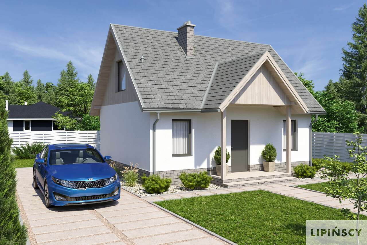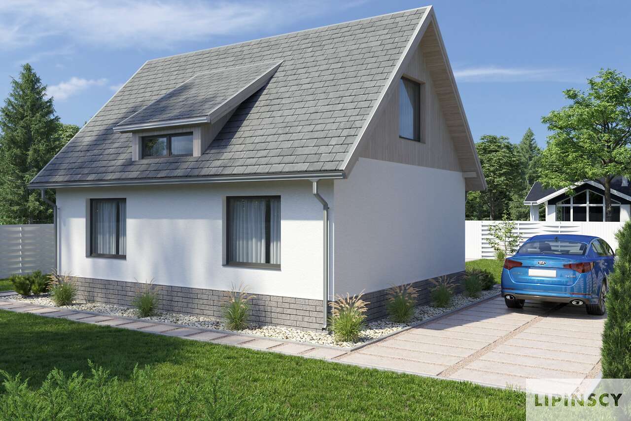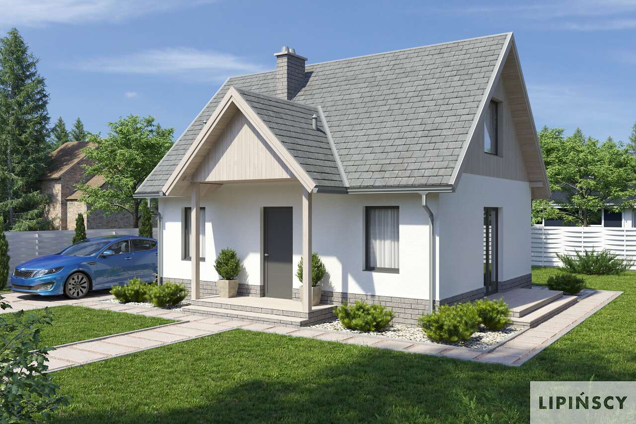 Wdzięczny, mały domek dla niedużej rodziny. Na niewielkiej powierzchni zgrabnie zakomponowano cztery pokoje kuchnię, łazienkę i pomieszczenie gospodarcze. Z zadaszonego ganku przechodzi się do wiatrołapu, przy którym jest łazienka z kotłem c. o. Pokój dzienny stanowi przestrzeń integrującą życie rodziny. Jest tu miejsce na kominek, kącik wypoczynkowy, stół jadalniany i wydzieloną część kuchenną. Obok znajduje się jedna sypialnia. Drewniane schody prowadzą na poddasze, gdzie są dwie sypialnie i garderoba. Sypialnie są wystarczająco wygodne i ustawne, a garderoba bardzo praktyczna.