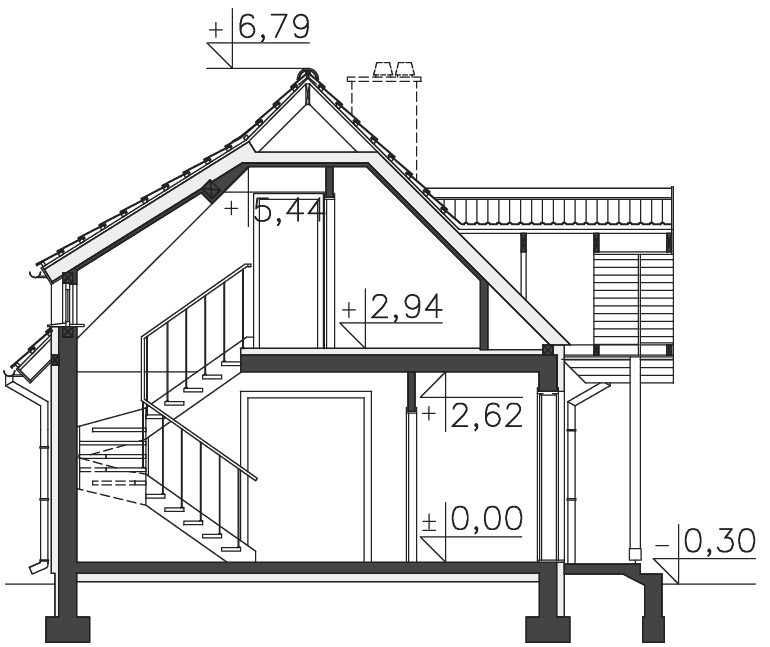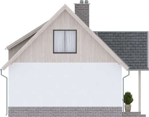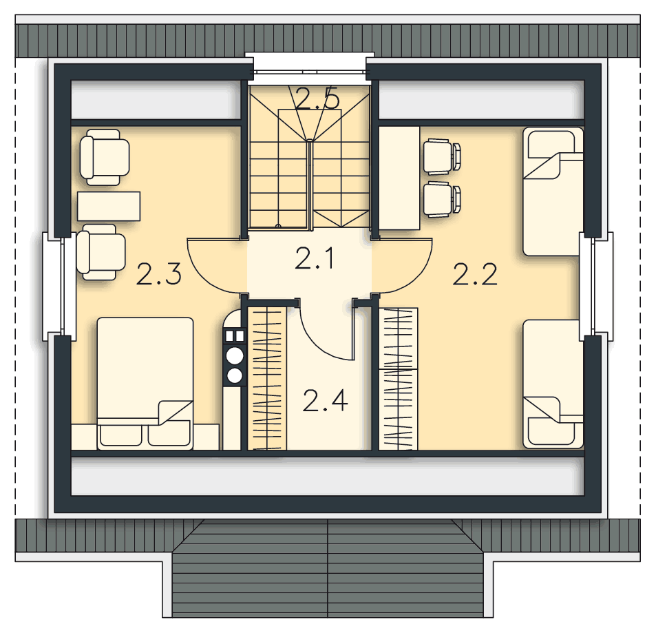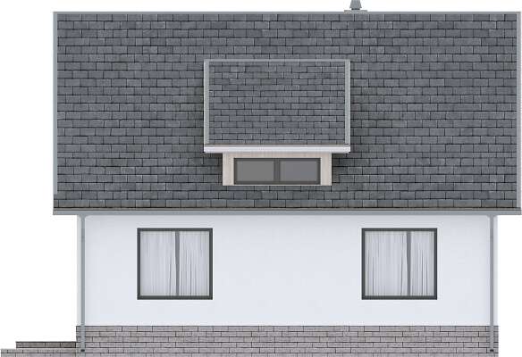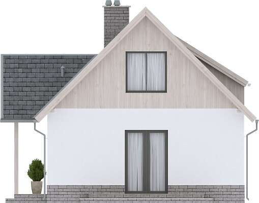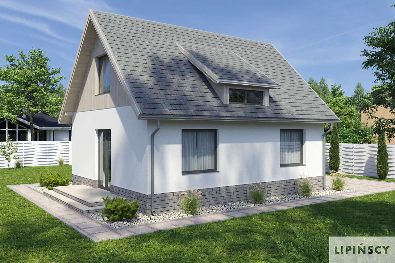 Wdzięczny, mały domek dla niedużej rodziny. Na niewielkiej powierzchni zgrabnie zakomponowano cztery pokoje kuchnię, łazienkę i pomieszczenie gospodarcze. Z zadaszonego ganku przechodzi się do wiatrołapu, przy którym jest łazienka z kotłem c. o. Pokój dzienny stanowi przestrzeń integrującą życie rodziny. Jest tu miejsce na kominek, kącik wypoczynkowy, stół jadalniany i wydzieloną część kuchenną. Obok znajduje się jedna sypialnia. Drewniane schody prowadzą na poddasze, gdzie są dwie sypialnie i garderoba. Sypialnie są wystarczająco wygodne i ustawne, a garderoba bardzo praktyczna.