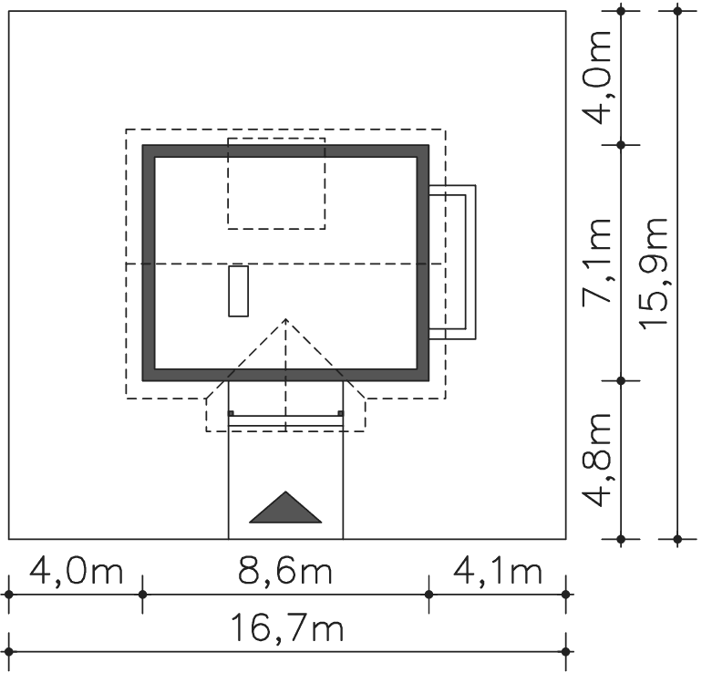 Grafika przedstawia minimalne wymiary działki. Aby sprawdzić, czy dom może być realizowany na konkretnej działce należy uzyskać Wypis i Wyrys z Miejscowego Planu Zagospodarowania Przestrzennego lub jeśli na danym terenie nie ma planu – Decyzję o warunkach zabudowy. Wszystkie projekty wymagają adaptacji do warunków miejscowych przez projektanta lokalnego.