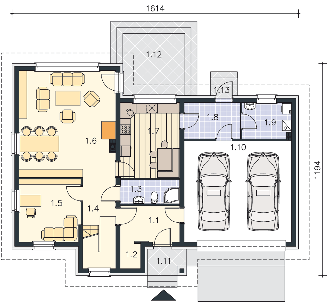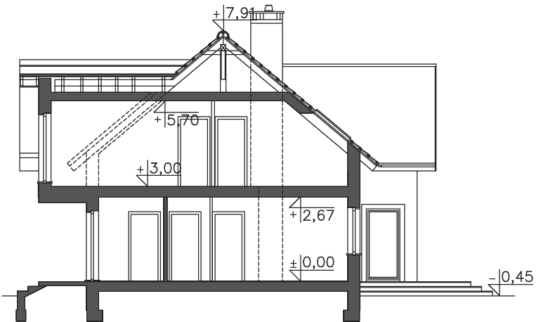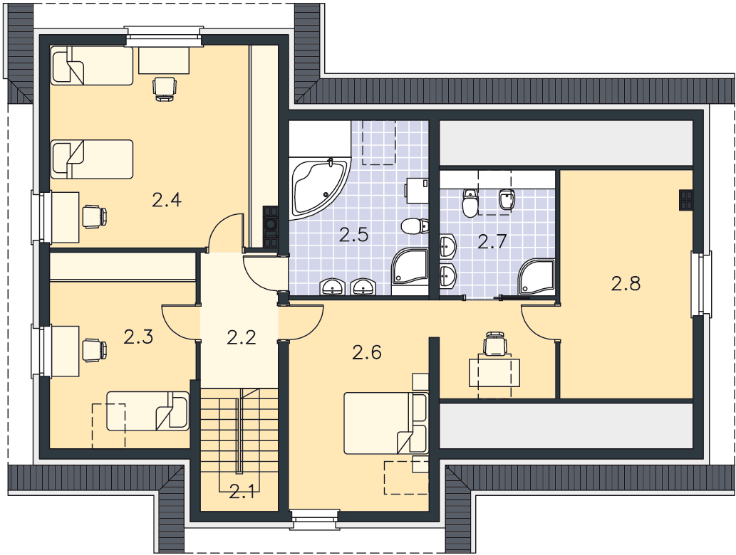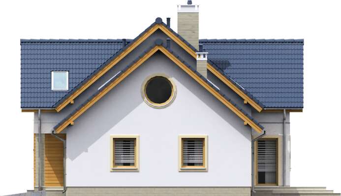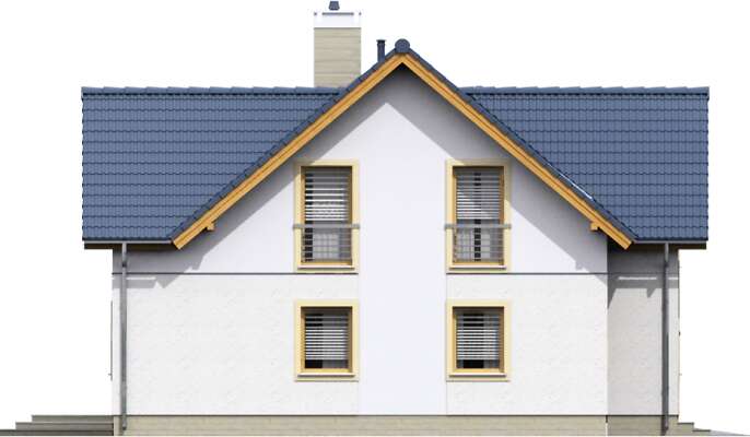 Harmonijne zaprojektowany dom o tradycyjnej bryle i nowoczesnym detalu. Jego wartość podkreśla wygodnie rozplanowana część dzienna, rozbudowana przestrzeń gospodarcza (z podwójnym garażem, spiżarką i kotłownią oraz apartament na poddaszu z własną łazienką i dodatkowymi pomieszczeniami które mogą być zagospodarowane w różnorodny a idealny dla Państwa sposób. Może to być np. sypialnia rodziców z intymną łazienką, kącikiem komputerowym i siłownią albo małe mieszkanko dla wkraczających w dorosłe życie dzieci. Pozostałe dwie sypialnie są również wygodne i mają dobrze wyposażoną łazienkę.