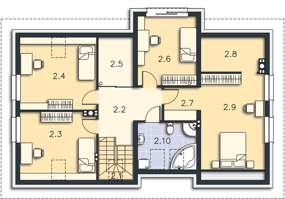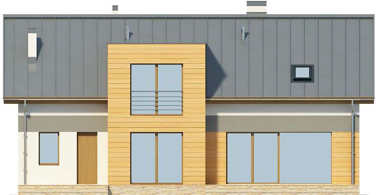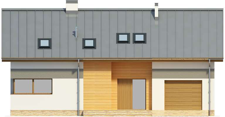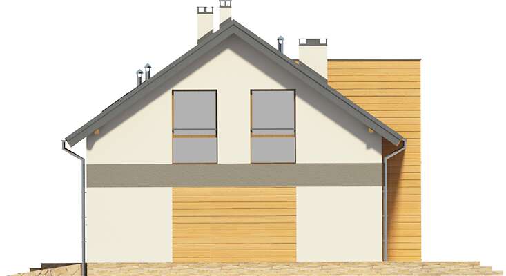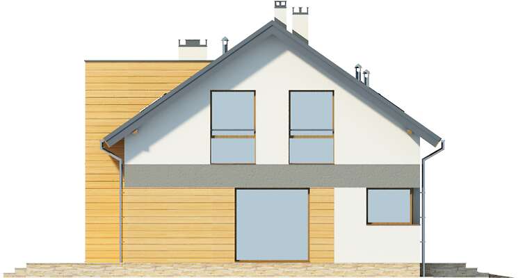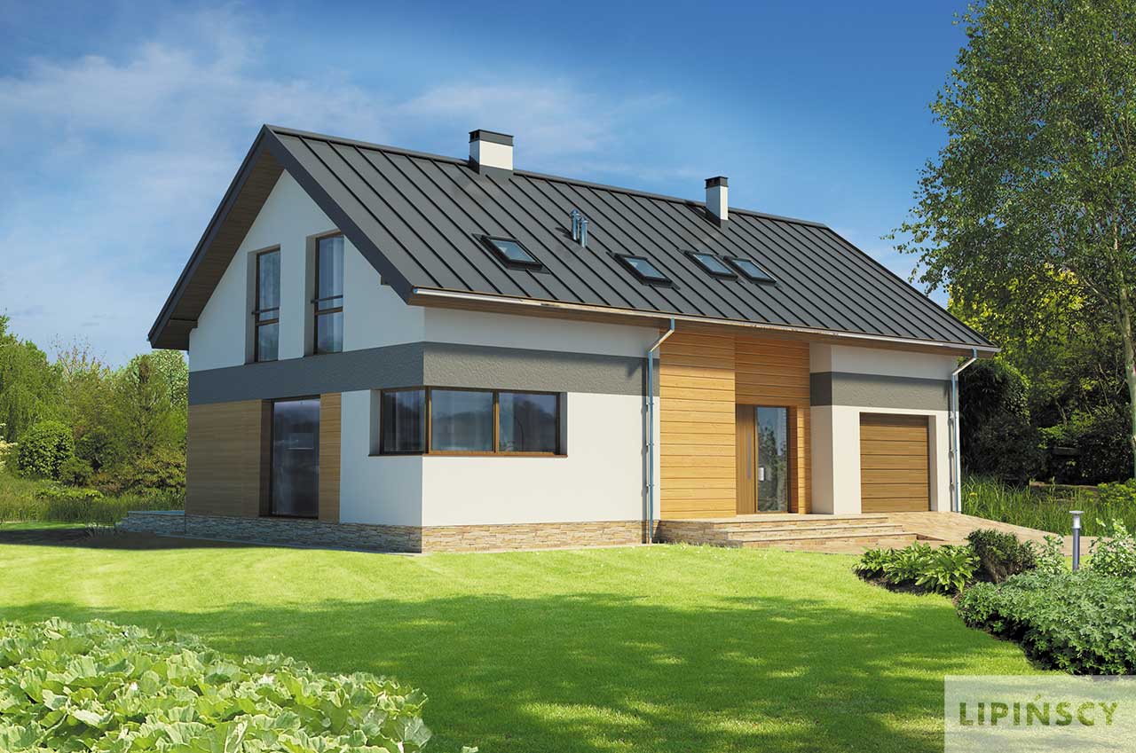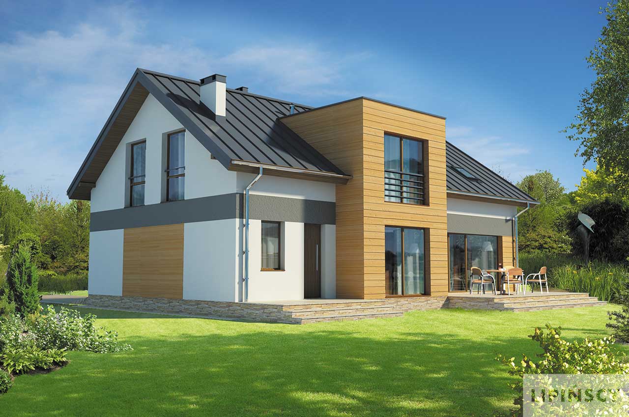 Domy z dachami dwuspadowymi mają w sobie elegancki urok prostoty. Jeśli jeszcze zastosuje się odpowiednie materiały wykończeniowe, z prostego domu robi się nowoczesny dom na miarę XXI wieku. Wnętrza tego domu są także rozwiązane bardzo pomysłowo i praktycznie. Schody zostały umieszczone nieco z boku, a jednocześnie w części dziennej domu, a przestrzeń pod nimi została praktycznie wykorzystana na spiżarnię. Do garażu można przejść bezpośrednio z wiatrołapu, co jest bardzo wygodne. Na poddaszu znajdują się aż cztery sypialnie, więc spokojnie może w nim zamieszkać rodzina wielodzietna, w razie potrzeby wykorzystując na sypialnię jeszcze dodatkowy pokój na parterze.