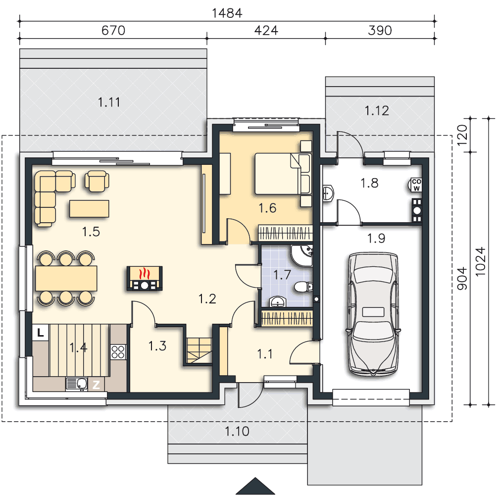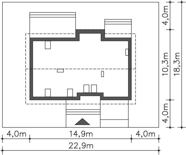 Grafika przedstawia minimalne wymiary działki. Aby sprawdzić, czy dom może być realizowany na konkretnej działce należy uzyskać Wypis i Wyrys z Miejscowego Planu Zagospodarowania Przestrzennego lub jeśli na danym terenie nie ma planu – Decyzję o warunkach zabudowy. Wszystkie projekty wymagają adaptacji do warunków miejscowych przez projektanta lokalnego.