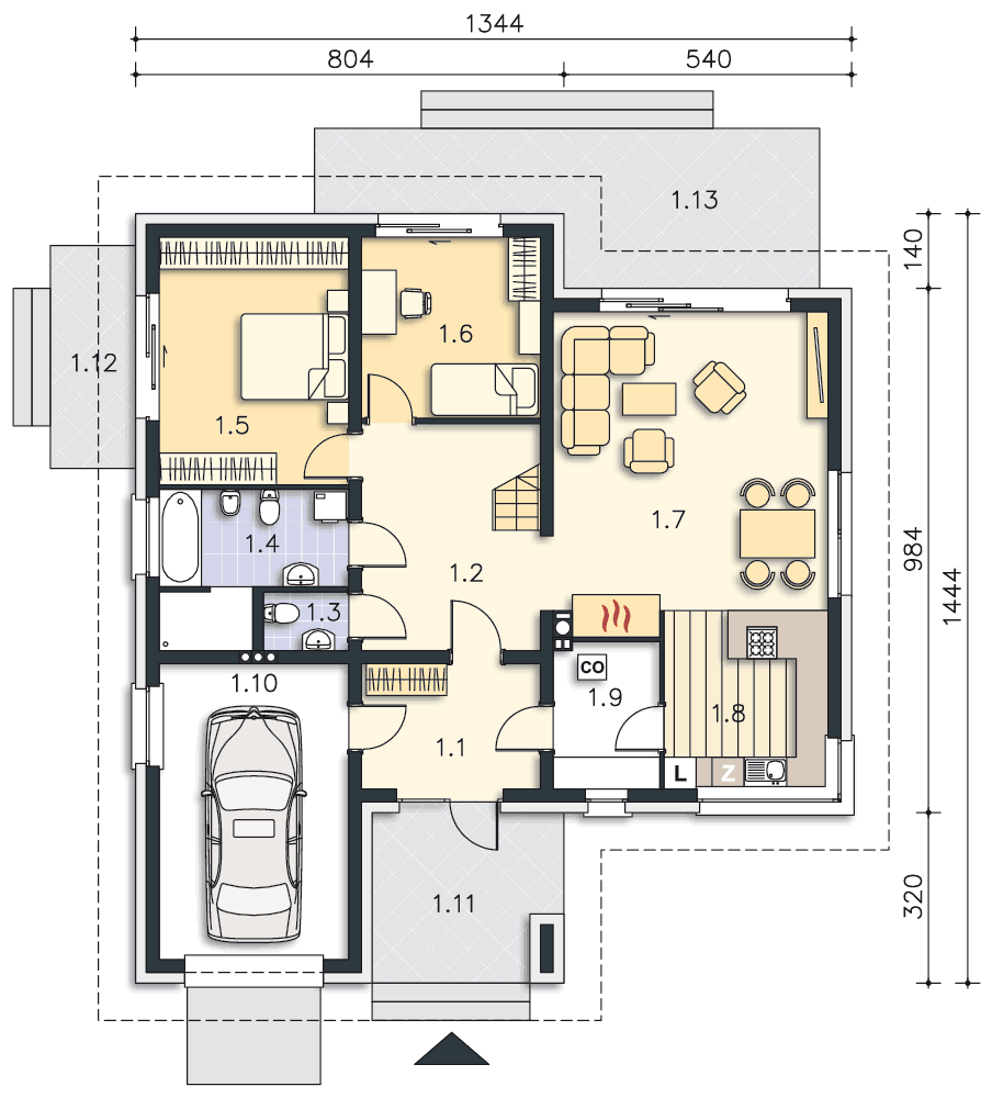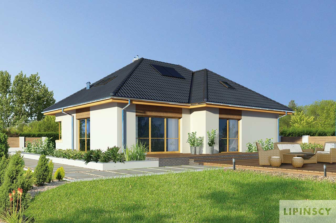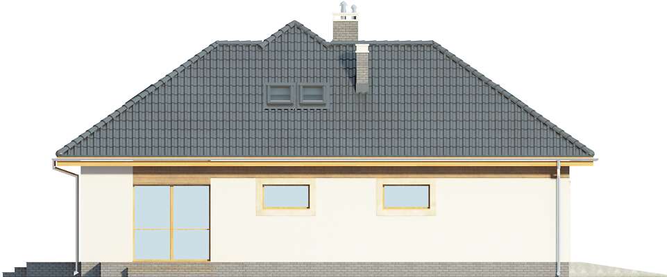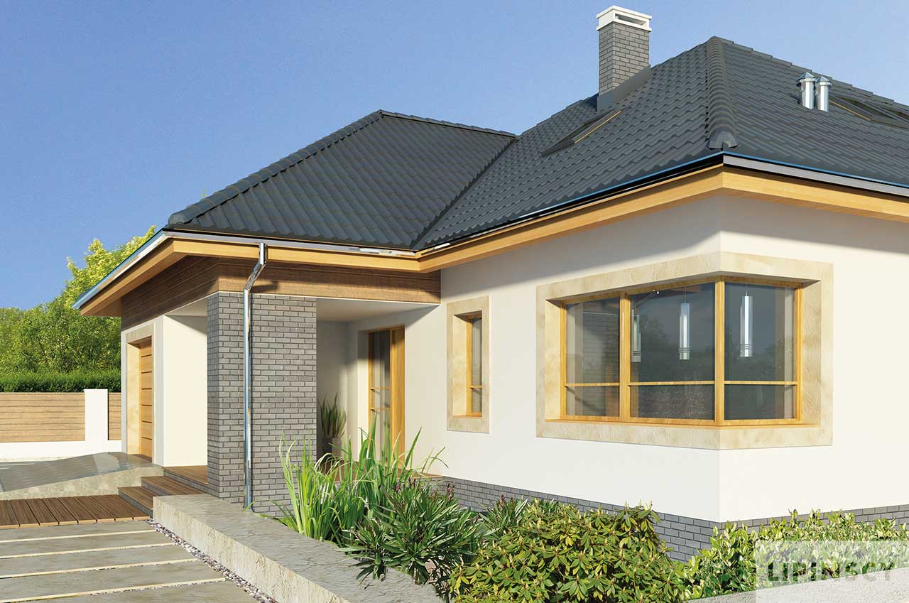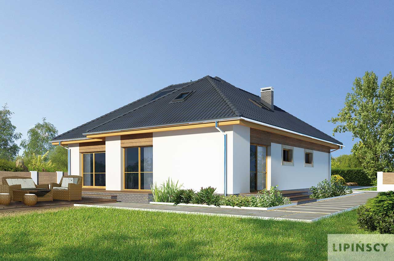 Nieduży, parterowy dom z dwuspadowym dachem, o zwartej, ładnej bryle i funkcjonalnym wnętrzu, który dzięki wysuniętemu do przodu garażowi na jedno auto, może zostać wybudowany na niezbyt szerokiej działce. Do dyspozycji mieszkańców jest salon z kominkiem, obok którego przewidziano półotwartą kuchnię i podręczną spiżarnię, a także dwie sypialnie, łazienkę, osobną toaletę i ustawny wiatrołap. Z uwagi na niewielki metraż, dom idealnie spełnia potrzeby niedużej rodziny lub pary seniorów. Ozdobą domu jest z pewnością ciekawie zaaranżowany taras od strony ogrodowej, idealny do spędzania czasu na świeżym powietrzu.