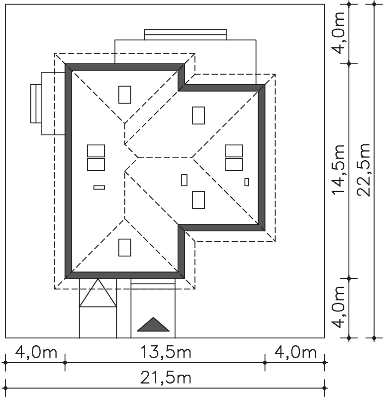 Grafika przedstawia minimalne wymiary działki. Aby sprawdzić, czy dom może być realizowany na konkretnej działce należy uzyskać Wypis i Wyrys z Miejscowego Planu Zagospodarowania Przestrzennego lub jeśli na danym terenie nie ma planu – Decyzję o warunkach zabudowy. Wszystkie projekty wymagają adaptacji do warunków miejscowych przez projektanta lokalnego.
