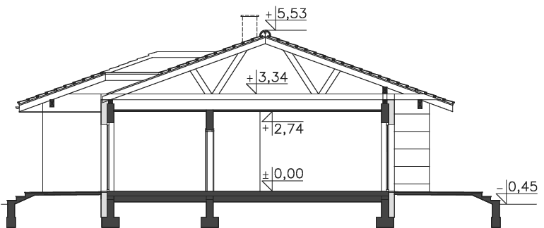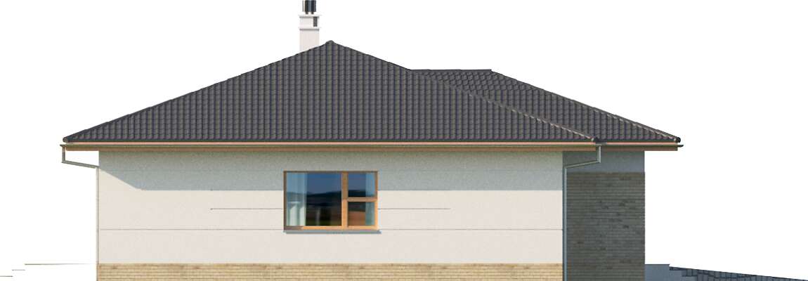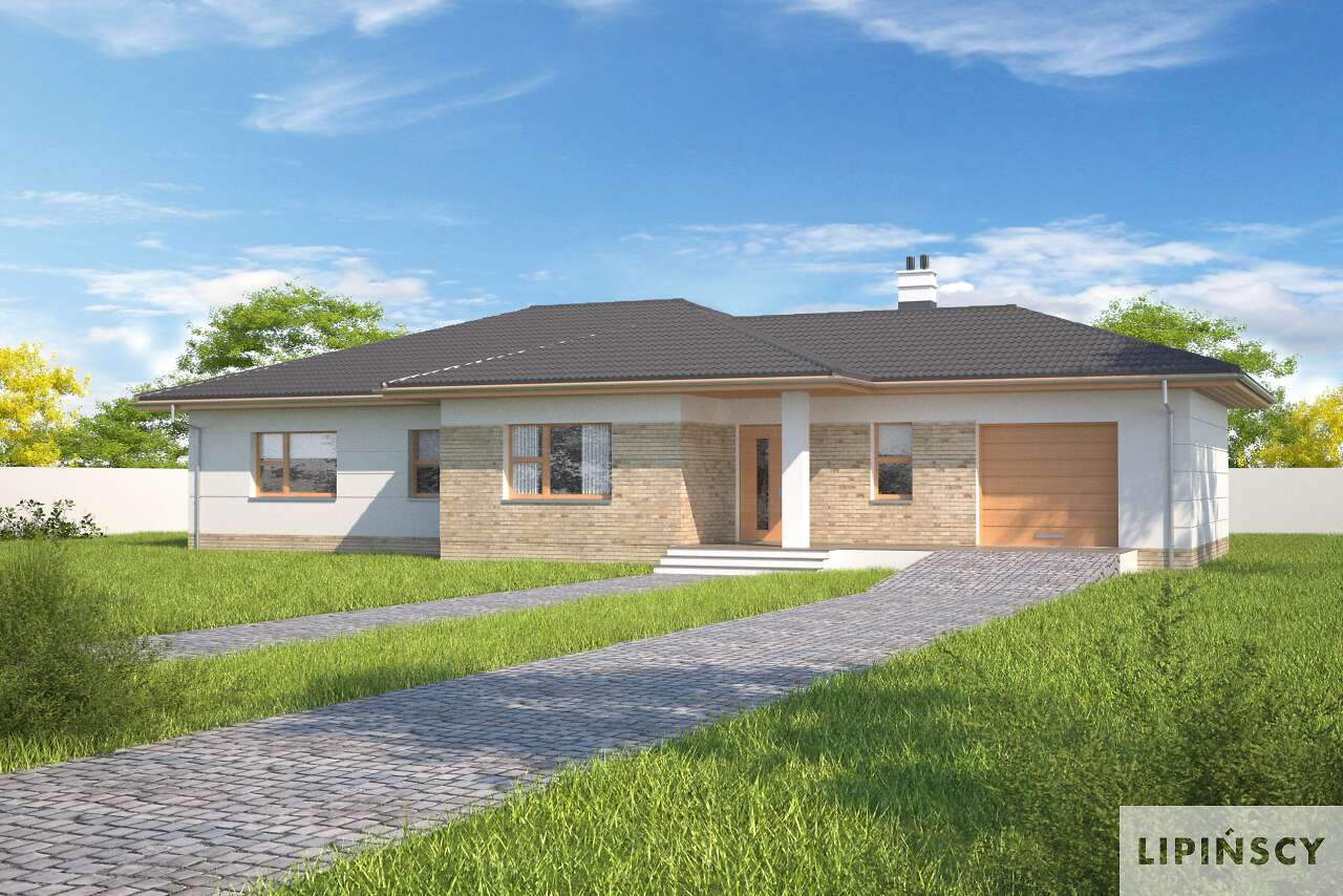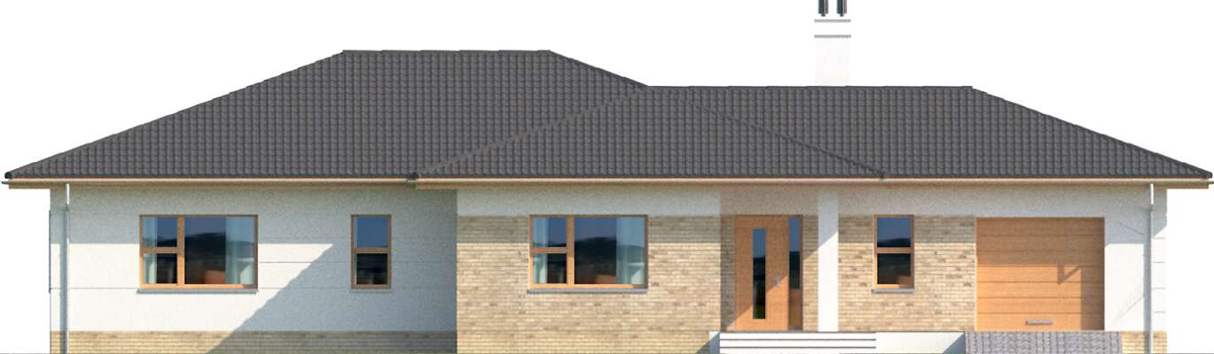 Rozłożysty dom parterowy zaprojektowany z myślą o dużej rodzinie, w którym znajduje się wygodna kuchnia z miejscem na jadalnie. Salon także jest przestronny, a dodatkowo prowadzi z niego przejście na częściowo zadaszony taras. W domu przewidziane są cztery sypialnie, wydzielone zacisznie z części dziennej. Część gospodarcza to szeroki garaż i kotłownia do których można przejść przez praktyczne pomieszczenie gospodarcze,składzik.