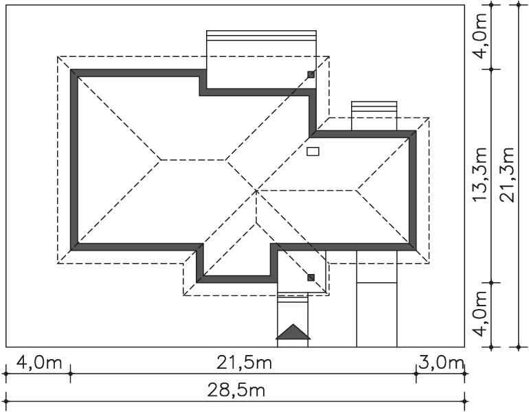 Grafika przedstawia minimalne wymiary działki. Aby sprawdzić, czy dom może być realizowany na konkretnej działce należy uzyskać Wypis i Wyrys z Miejscowego Planu Zagospodarowania Przestrzennego lub jeśli na danym terenie nie ma planu – Decyzję o warunkach zabudowy. Wszystkie projekty wymagają adaptacji do warunków miejscowych przez projektanta lokalnego.