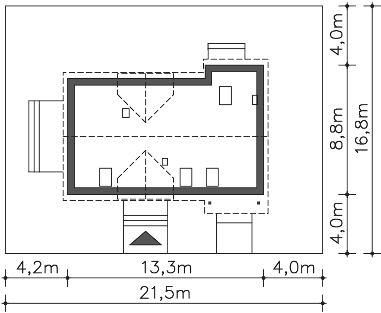 Grafika przedstawia minimalne wymiary działki. Aby sprawdzić, czy dom może być realizowany na konkretnej działce należy uzyskać Wypis i Wyrys z Miejscowego Planu Zagospodarowania Przestrzennego lub jeśli na danym terenie nie ma planu – Decyzję o warunkach zabudowy. Wszystkie projekty wymagają adaptacji do warunków miejscowych przez projektanta lokalnego.