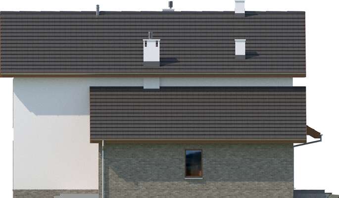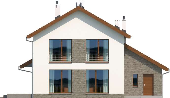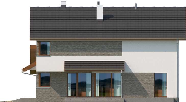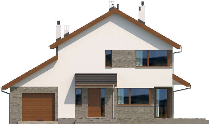 Duży, wygodny dom jednorodzinny, w którym dzięki pełnej kondygnacji piętra uzyskaliśmy przestronne sypialnie o powierzchniach prawie 20m². Jedna z nich dodatkowo posiada własną, odrębną łazienkę. Z drugiej z łazienek można przejść do małej, ale praktycznej pralni. Strefa dzienna to ponad 30m² salon, dodatkowy pokój, kuchnia wraz z pomieszczeniami pomocniczymi. Z domu można przejść bezpośrednio do garażu i kotłowni poprzez mały korytarzyk. Duże przeszklenia domu dodatkowo powiększają wrażenie przestronności.