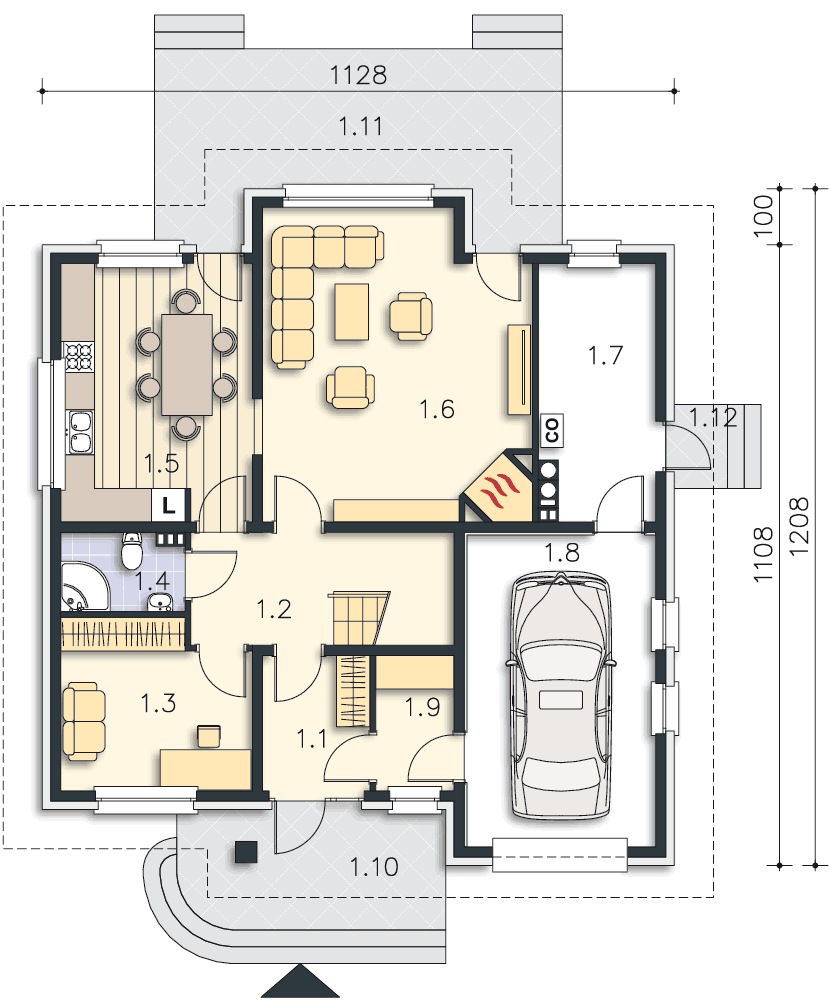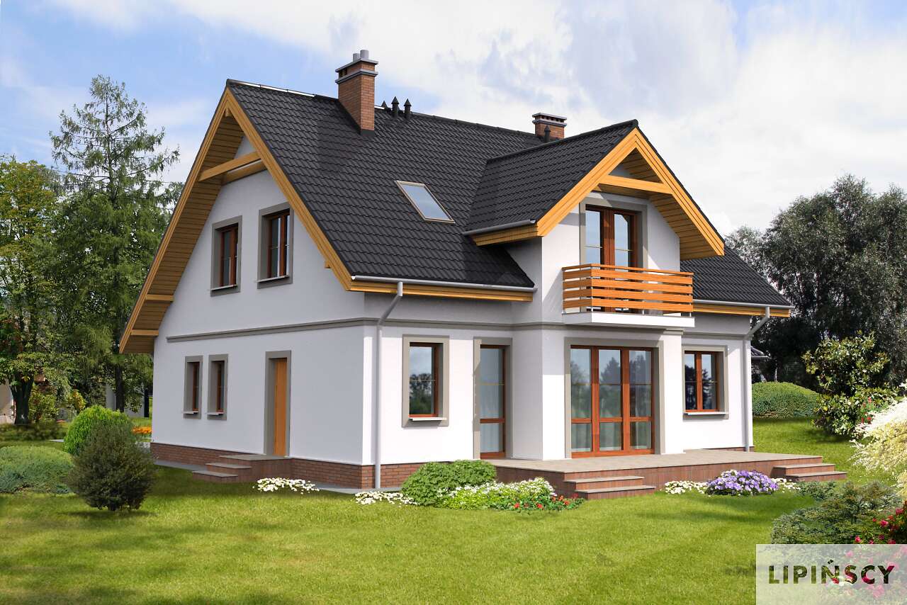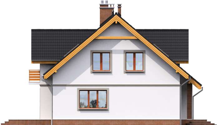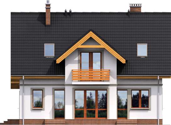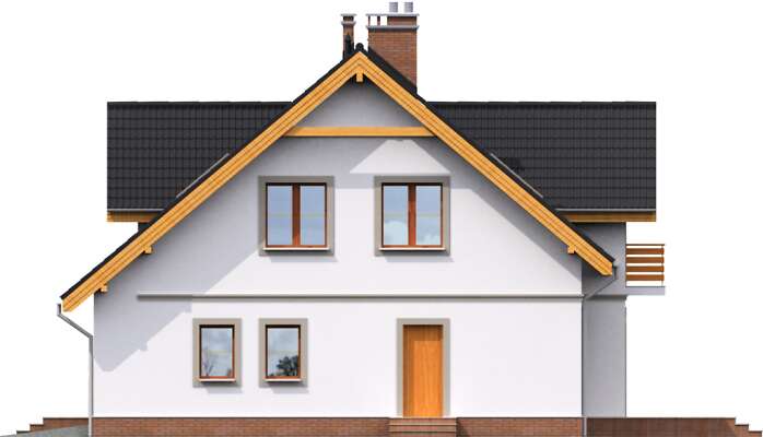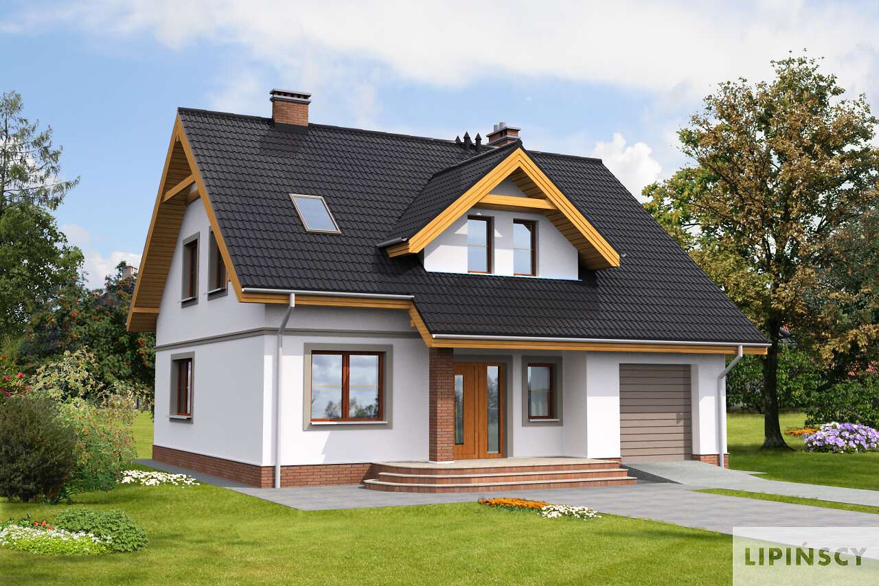 Interesujący dom z użytkowym poddaszem i jednostanowiskowym garażem wkomponowanym w bryłę budynku. Na parterze znajduje się obszerny salon z narożnym kominkiem, kuchnia, dodatkowy pokój, łazienka i pomieszczenie gospodarcze z przejściem do garażu. Za garażem zlokalizowano kotłownię z niezależnym wyjściem na zewnątrz, co znacznie ułatwia obsługę i konserwację kotła oraz daje możliwość zamontowania pieca na paliwo stałe. Poddasze to trzy pokoje, wygodna łazienka oraz doskonały azyl dla rodziców – duża sypialnia z własną, niezależną łazienką oraz pojemną garderobą. Uwagę zwracają duże przeszklenia, dzięki którym wnętrze domu jest doskonale doświetlone.
