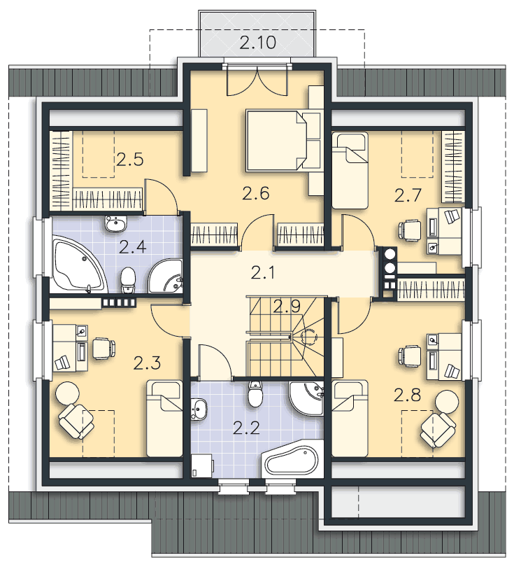 SkomentujNa piętrze zrezygnowaliśmy z "prywatnego" wejścia do łazienki, tzn. połączyliśmy pomieszczenia 2.4 i 2.5 w dużą łazienkę i do wszystkich pomieszczeń mamy wejście od korytarza. Jedyne minusy jakie zauważyliśmy to troszkę zbyt wąskie schody na piętro - ciężko się na nich minąć więc poręcz trzeba będzie zamontować z boku schodów, oraz dla pieca na groszek z podajnikiem trzeba kupić piec na specjalne zamówienie (bo czopuch nie może być z tyłu pieca). Przy ogrzewaniu gazem bez znaczenia. Jak na razie jesteśmy bardzo zadowoleni i kupilibyśmy ten projekt jeszcze raz.