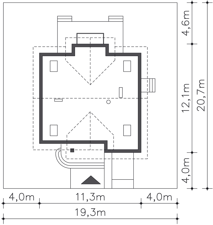 Grafika przedstawia minimalne wymiary działki. Aby sprawdzić, czy dom może być realizowany na konkretnej działce należy uzyskać Wypis i Wyrys z Miejscowego Planu Zagospodarowania Przestrzennego lub jeśli na danym terenie nie ma planu – Decyzję o warunkach zabudowy. Wszystkie projekty wymagają adaptacji do warunków miejscowych przez projektanta lokalnego.
