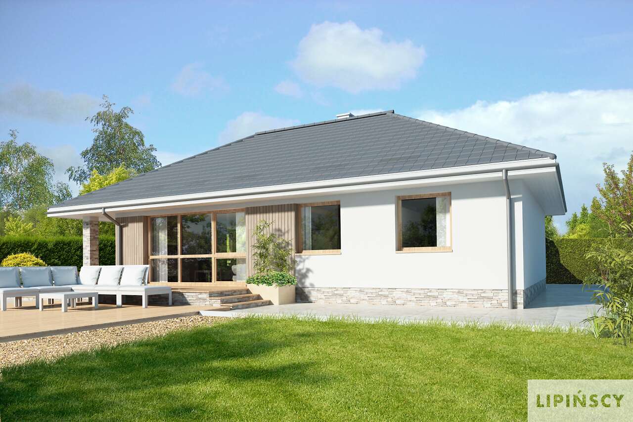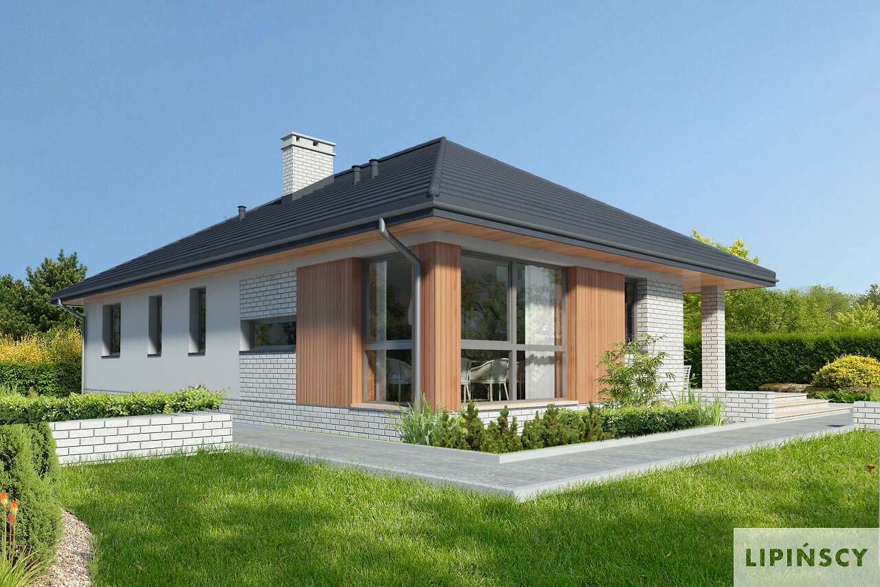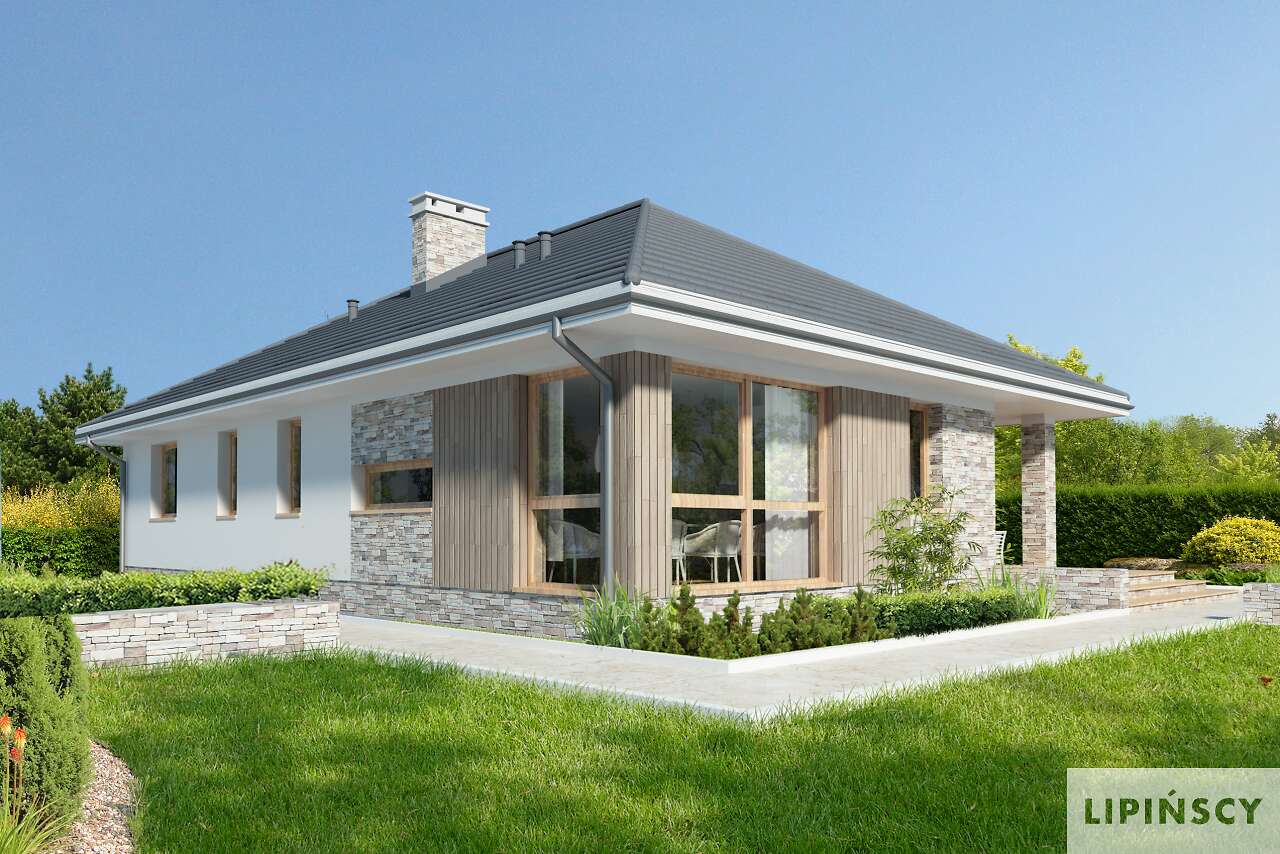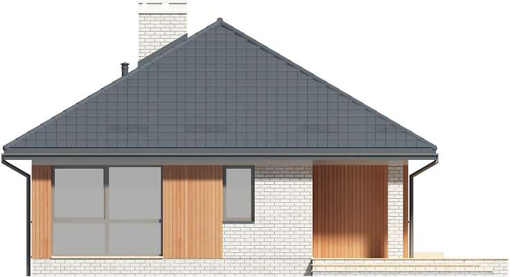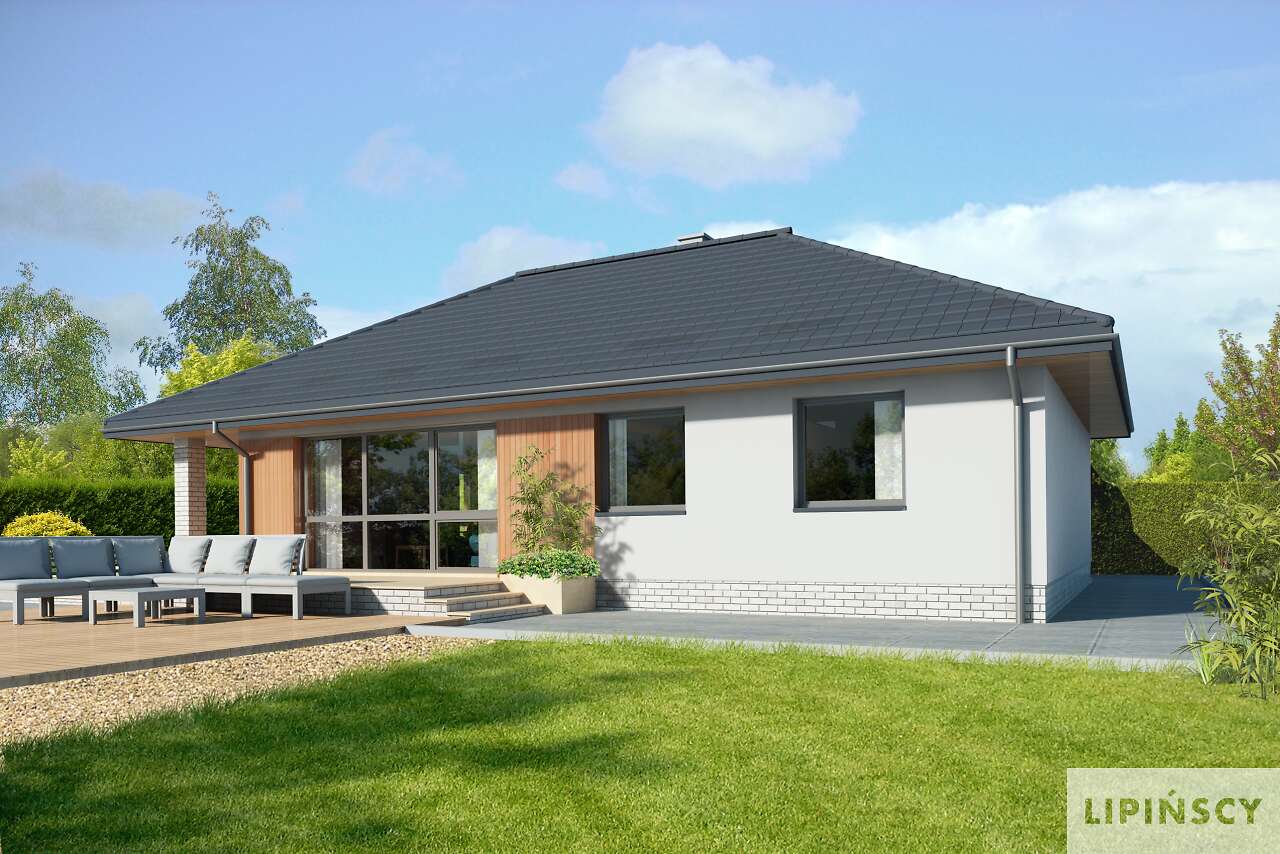 Niewielki dom parterowy z wejściem od strony szczytowej, co pozwala zlokalizować go na wąskiej działce. Do części dziennej należy duży salon, z wydzielonym miejscem do pracy. Obok salonu znajduje się kuchnia z wyspą i kącik z jadalnią. Przy kuchni jest kotłownia z gazowym kotłem grzewczym. Pomieszczenie to może również służyć jako spiżarnia lub pralnia. W części wspólnej zaplanowano również osobną toaletę. W części prywatnej znajdują się trzy sypialnie oraz wygodna, doświetlona oknem łazienka. Atutem domu jest prosta i elegancka bryła. Możliwa jest zmiana ogrzewania na pompę ciepła.