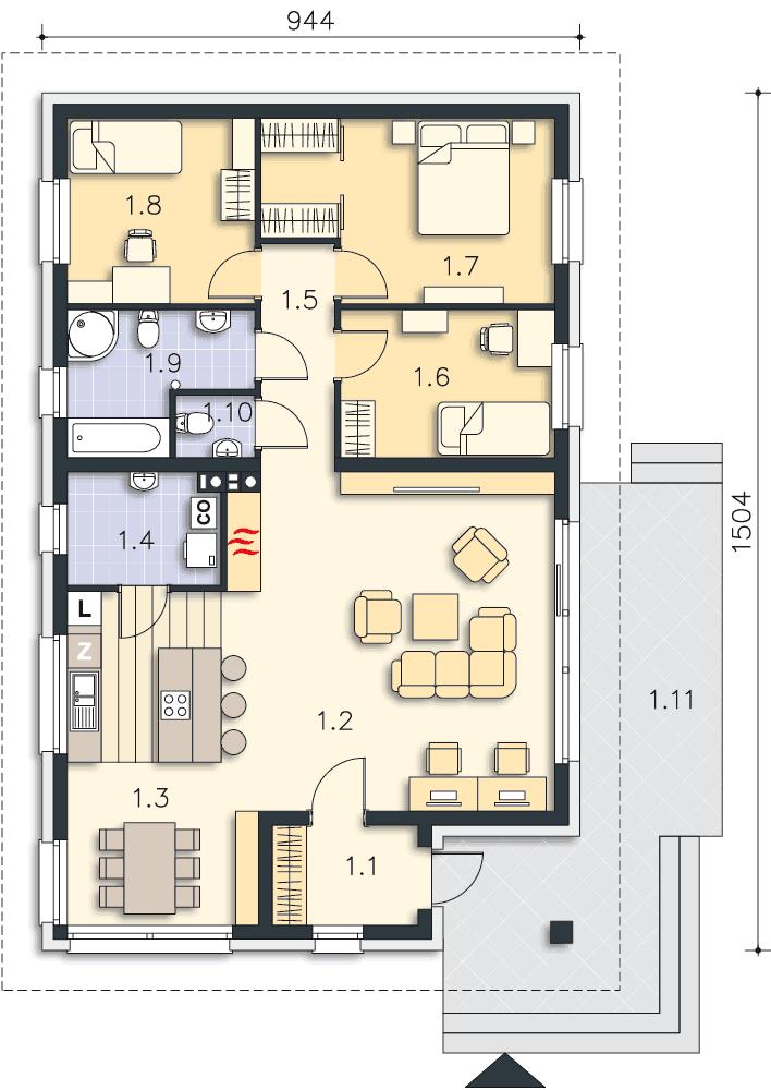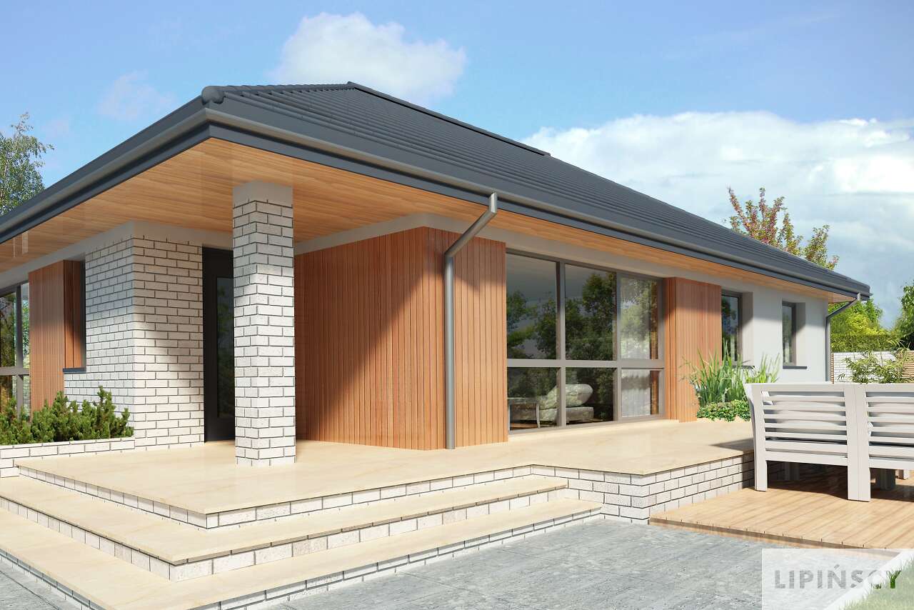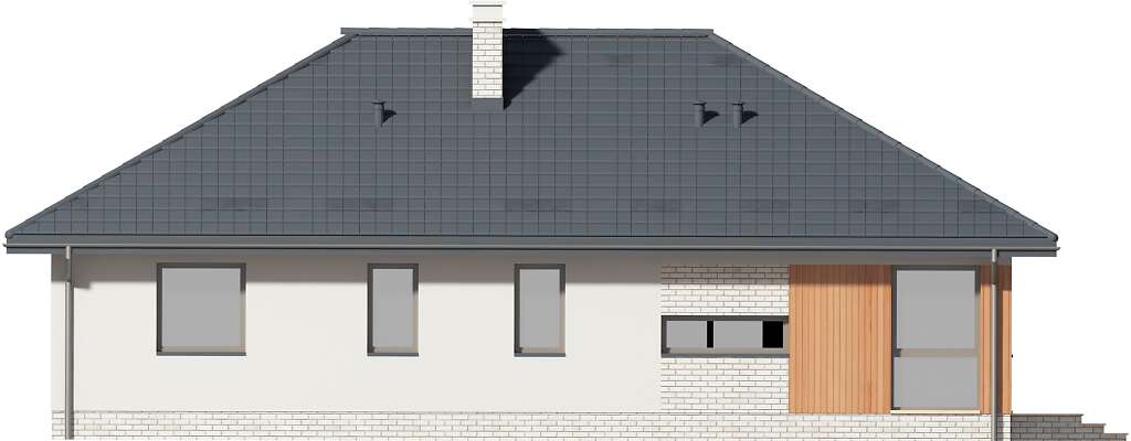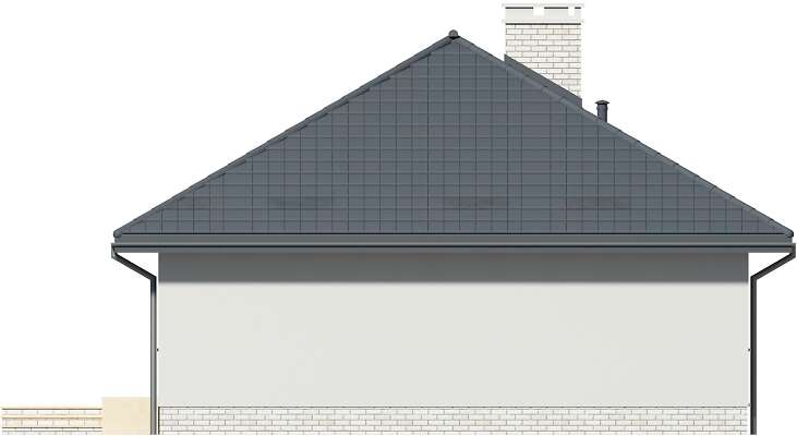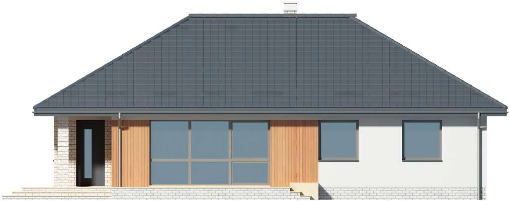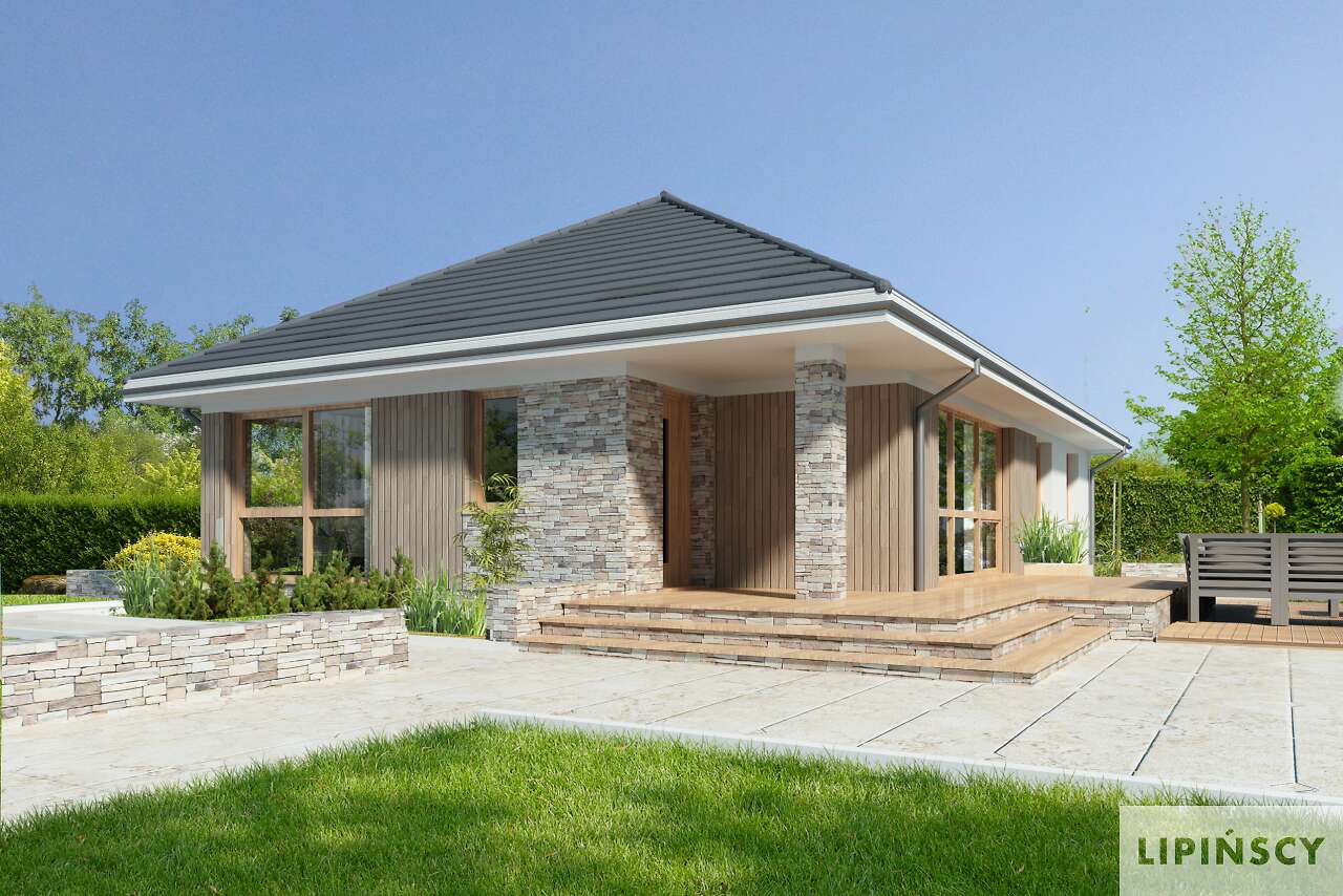 Niewielki dom parterowy z wejściem od strony szczytowej, co pozwala zlokalizować go na wąskiej działce. Do części dziennej należy duży salon, z wydzielonym miejscem do pracy. Obok salonu znajduje się kuchnia z wyspą i kącik z jadalnią. Przy kuchni jest kotłownia z gazowym kotłem grzewczym. Pomieszczenie to może również służyć jako spiżarnia lub pralnia. W części wspólnej zaplanowano również osobną toaletę. W części prywatnej znajdują się trzy sypialnie oraz wygodna, doświetlona oknem łazienka. Atutem domu jest prosta i elegancka bryła. Możliwa jest zmiana ogrzewania na pompę ciepła.