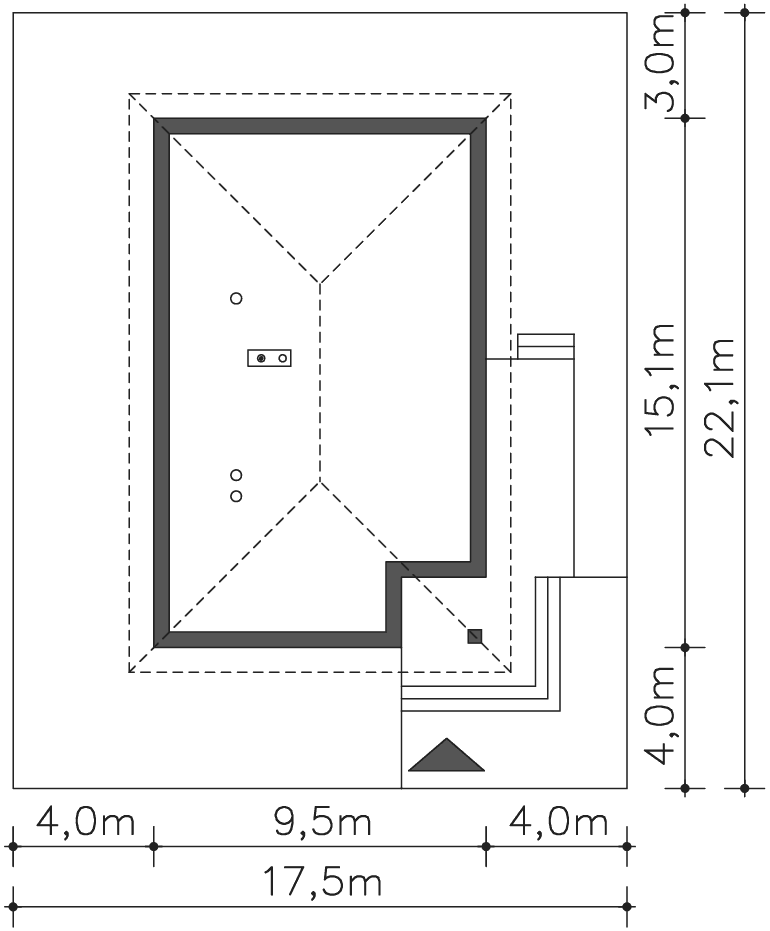 Grafika przedstawia minimalne wymiary działki. Aby sprawdzić, czy dom może być realizowany na konkretnej działce należy uzyskać Wypis i Wyrys z Miejscowego Planu Zagospodarowania Przestrzennego lub jeśli na danym terenie nie ma planu – Decyzję o warunkach zabudowy. Wszystkie projekty wymagają adaptacji do warunków miejscowych przez projektanta lokalnego.