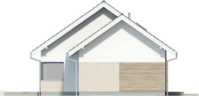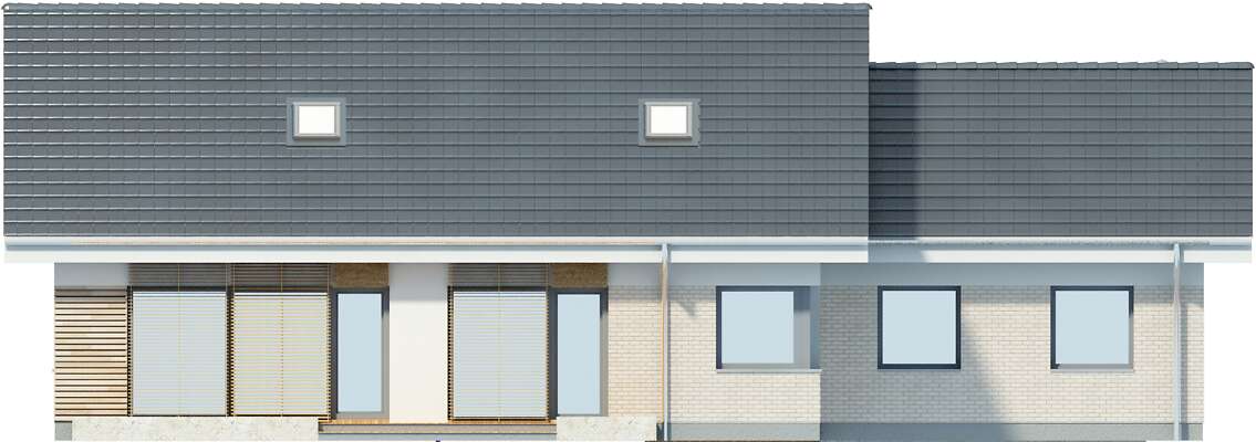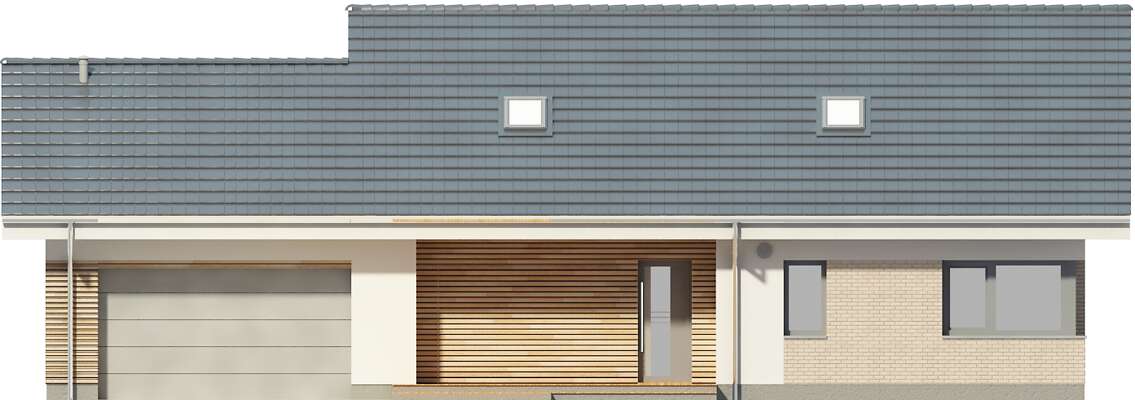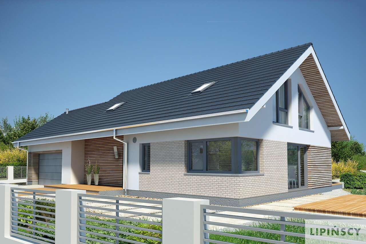 Nowoczesny, wygodny dom, zaprojektowany w standardzie pasywnym, który z pewnością zainteresuje inwestorów szukających komfortu w mieszkaniu i użytkowaniu. Nowoczesna, harmonijna bryła kryje funkcjonalny parter z dużym salonem, ustawną kuchnią ze spiżarnią, dodatkowym pokojem (gabinetem lub pokojem gościnnym), jasną łazienką. Na poddaszu znajdują się dwie obszerne sypialnie, dwie garderoby i komfortowa łazienka. Z bryłą budynku dobrze komponuje garaż, do którego można przejść z wnętrza domu. W projekcie przewidziano ogrzewanie pompą ciepła oraz rekuperację.