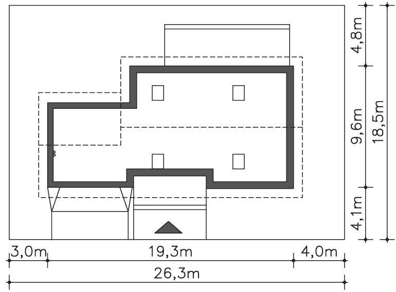 Grafika przedstawia minimalne wymiary działki. Aby sprawdzić, czy dom może być realizowany na konkretnej działce należy uzyskać Wypis i Wyrys z Miejscowego Planu Zagospodarowania Przestrzennego lub jeśli na danym terenie nie ma planu – Decyzję o warunkach zabudowy. Wszystkie projekty wymagają adaptacji do warunków miejscowych przez projektanta lokalnego.