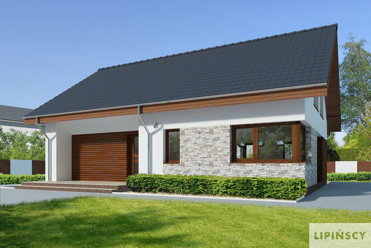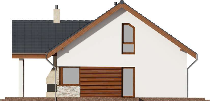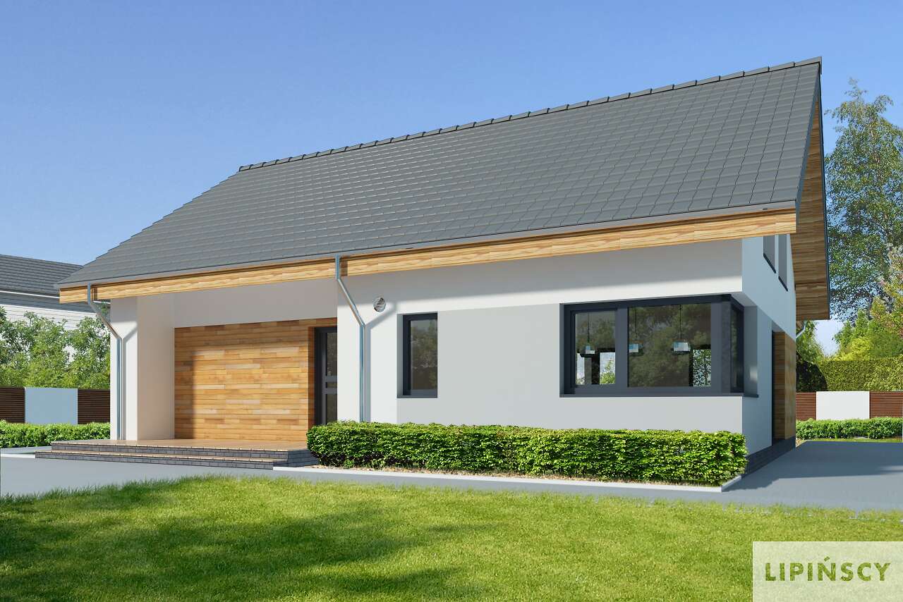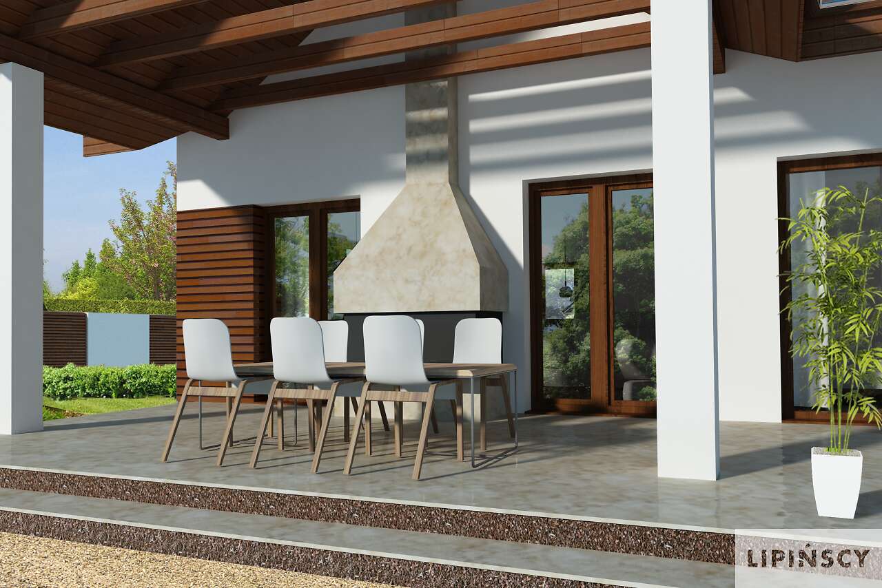 Parterowy dom pasywny, o zwartej bryle i przemyślanym układzie funkcjonalnym. Serce domu stanowi duży pokój dzienny, z wyjściem na taras, którego ozdobą jest kominek zewnętrzny. Os strony frontowej znajduje się kuchnia wraz z przylegającym do niej pomieszczeniem technicznym. Do dyspozycji mieszkańców jest także dodatkowy pokój oraz wygodna, duża łazienka. Poddasze to strefa prywatna, z dwiema sypialniami, garderobami i komfortową łazienka, w której – oprócz prysznica, zmieściła się także narożna wanna. Projekt ten z pewnością spodoba się osobom szukającym domu gdzie ekonomiczną eksploatację i wygodę mieszkańców połączono z proporcjonalną i harmonijną bryłą. Do projektu domu można dokupić pasujący stylistycznie projekt garażu G42 o powierzchni ponad 40m².