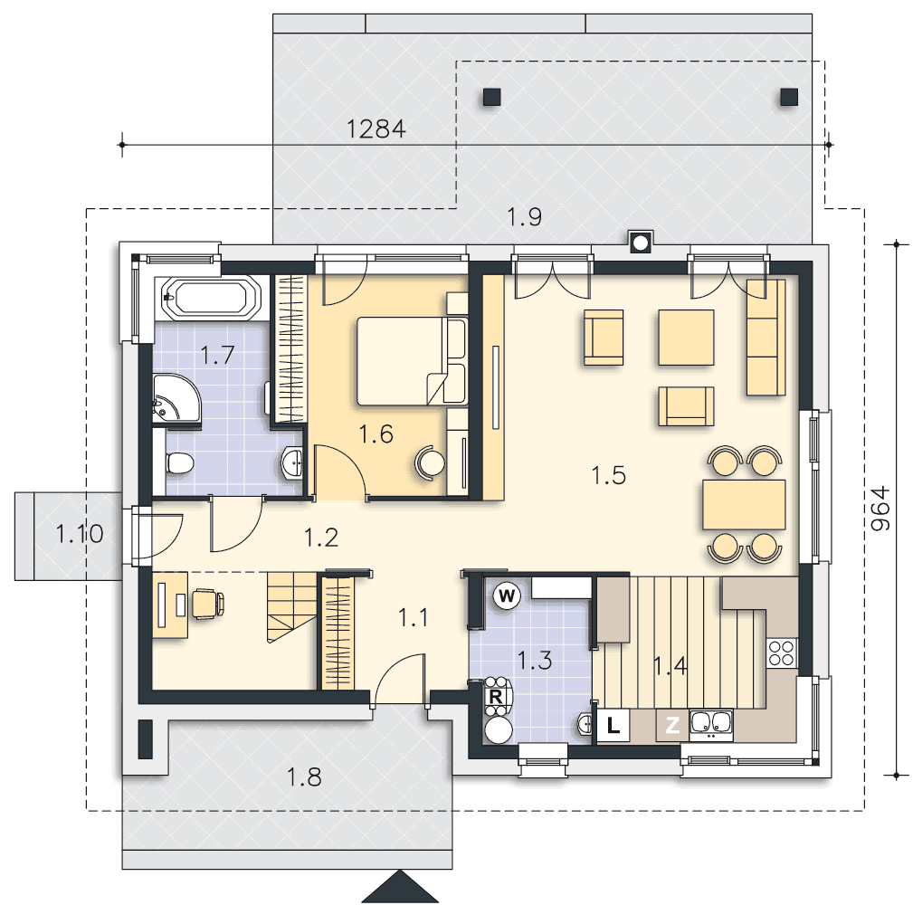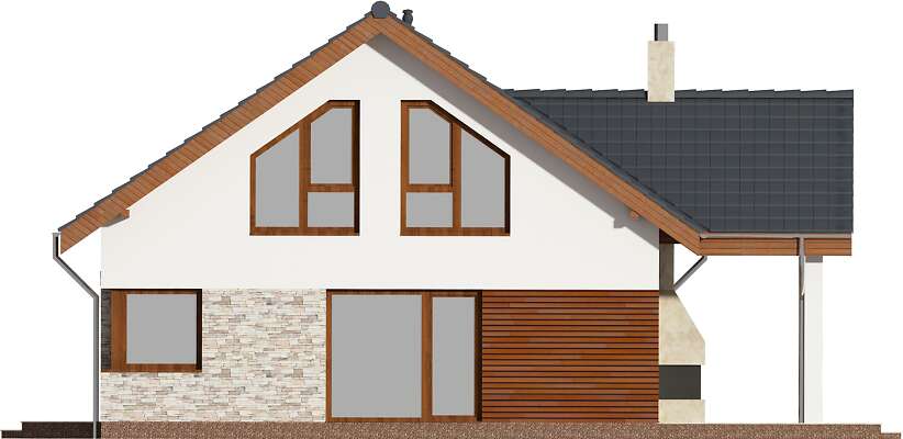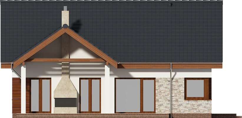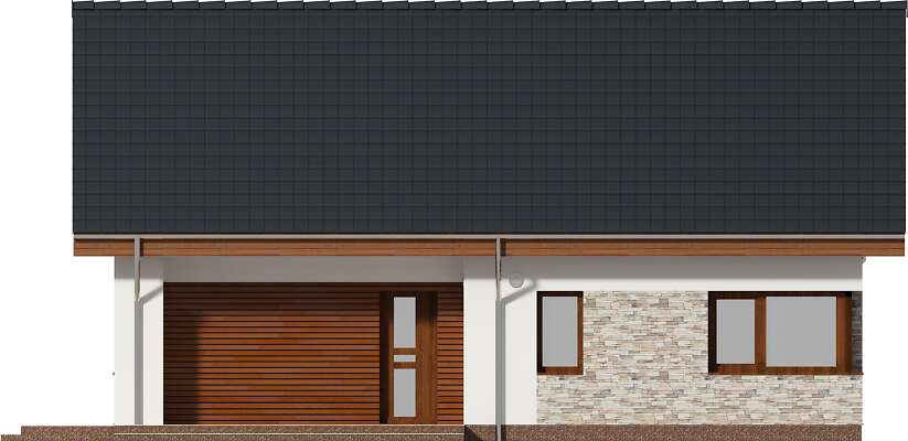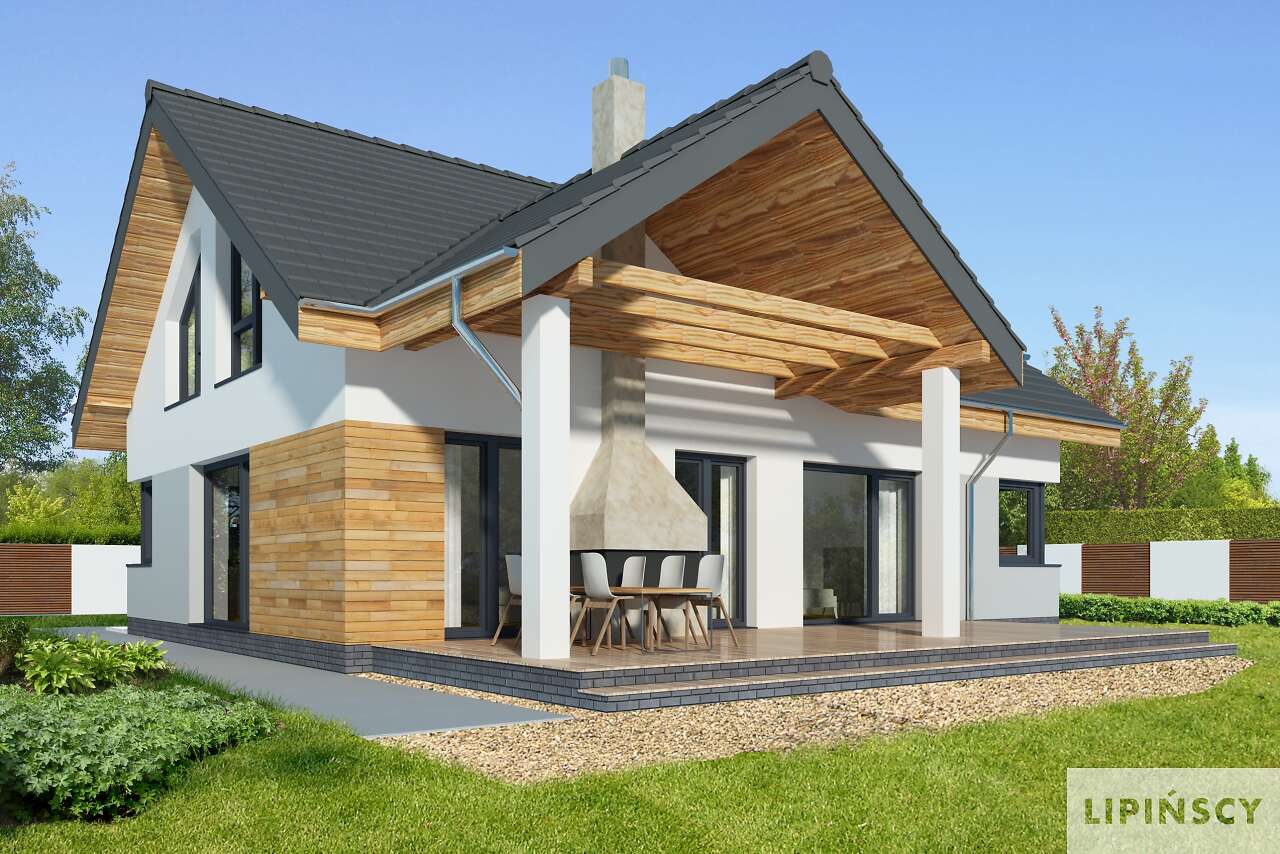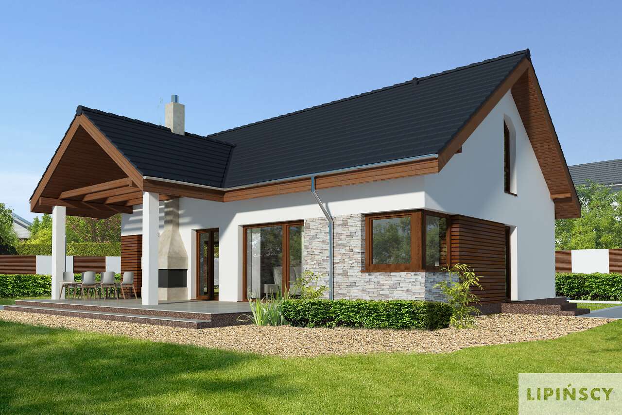 Parterowy dom pasywny, o zwartej bryle i przemyślanym układzie funkcjonalnym. Serce domu stanowi duży pokój dzienny, z wyjściem na taras, którego ozdobą jest kominek zewnętrzny. Os strony frontowej znajduje się kuchnia wraz z przylegającym do niej pomieszczeniem technicznym. Do dyspozycji mieszkańców jest także dodatkowy pokój oraz wygodna, duża łazienka. Poddasze to strefa prywatna, z dwiema sypialniami, garderobami i komfortową łazienka, w której – oprócz prysznica, zmieściła się także narożna wanna. Projekt ten z pewnością spodoba się osobom szukającym domu gdzie ekonomiczną eksploatację i wygodę mieszkańców połączono z proporcjonalną i harmonijną bryłą. Do projektu domu można dokupić pasujący stylistycznie projekt garażu G42 o powierzchni ponad 40m².