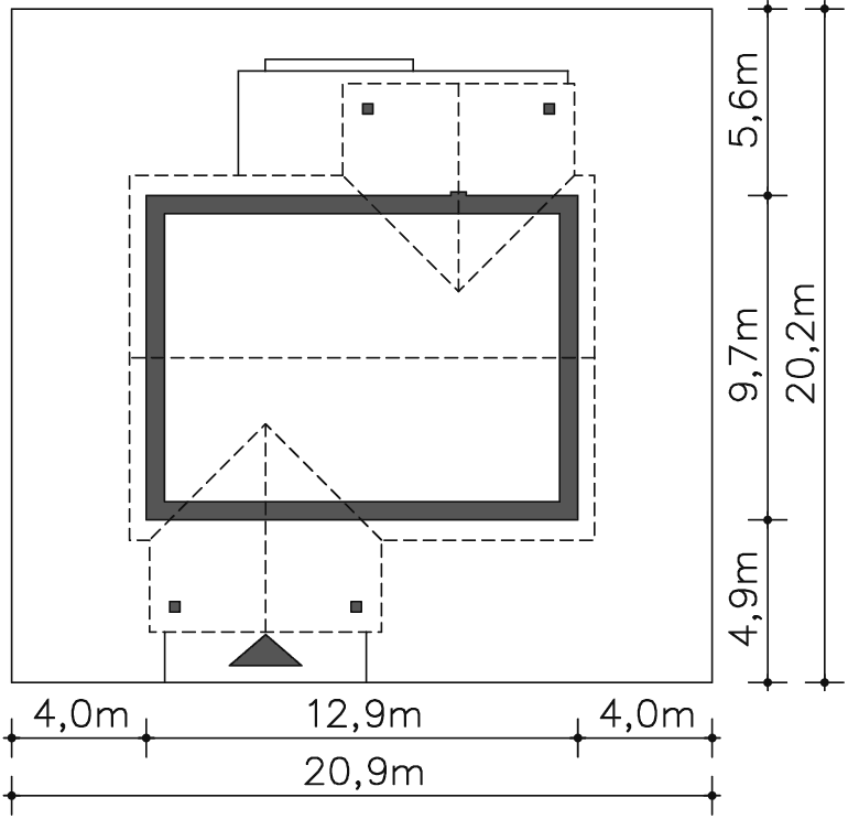 Grafika przedstawia minimalne wymiary działki. Aby sprawdzić, czy dom może być realizowany na konkretnej działce należy uzyskać Wypis i Wyrys z Miejscowego Planu Zagospodarowania Przestrzennego lub jeśli na danym terenie nie ma planu – Decyzję o warunkach zabudowy. Wszystkie projekty wymagają adaptacji do warunków miejscowych przez projektanta lokalnego.