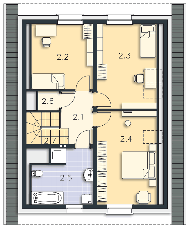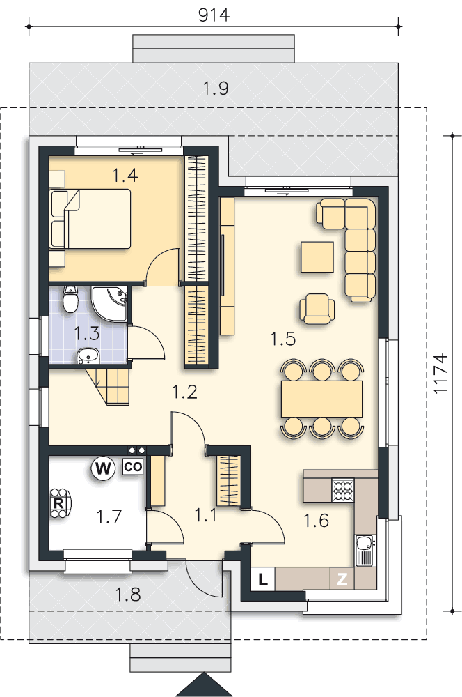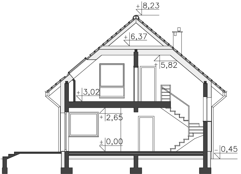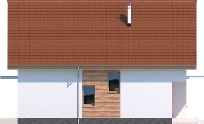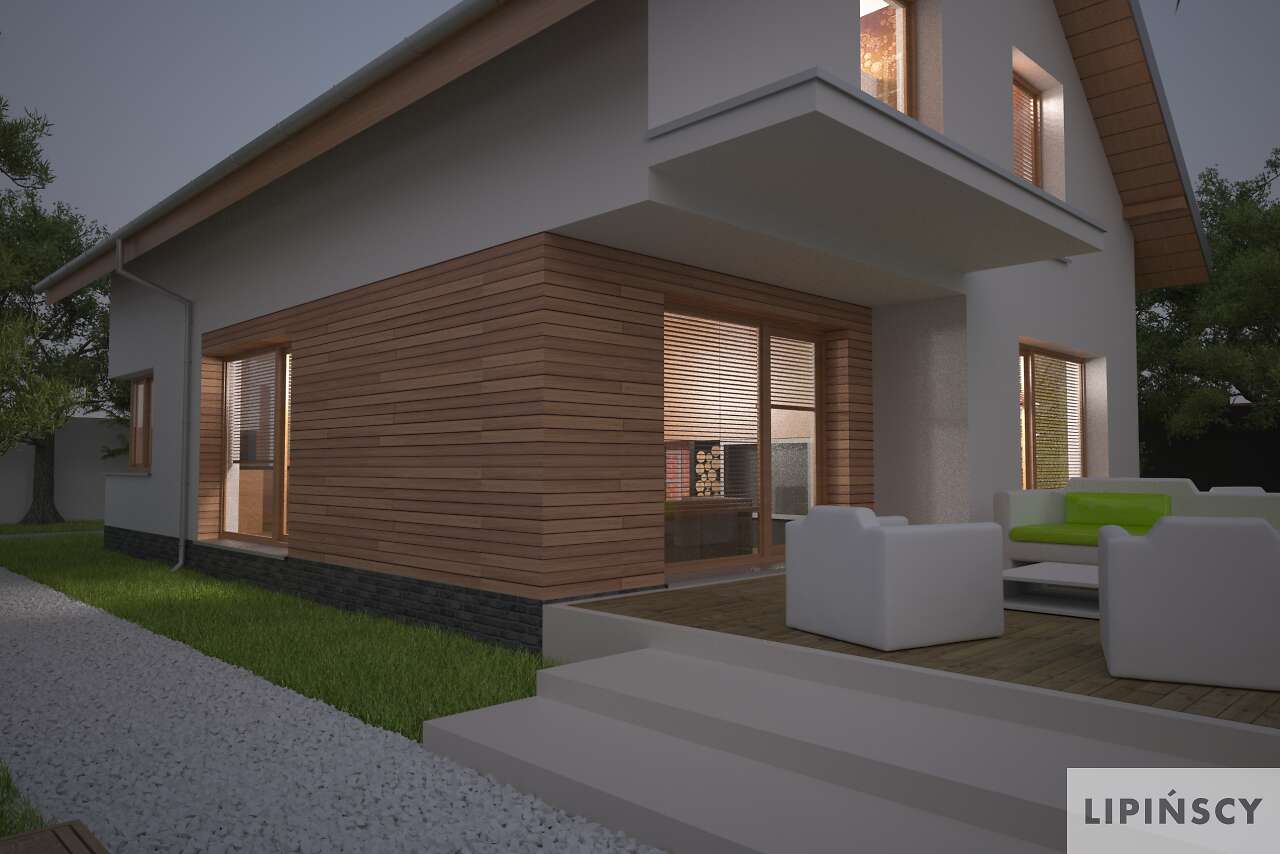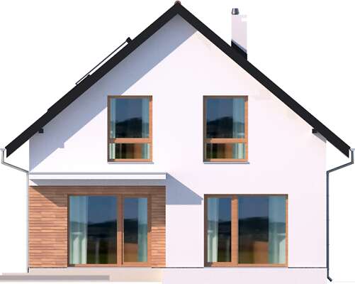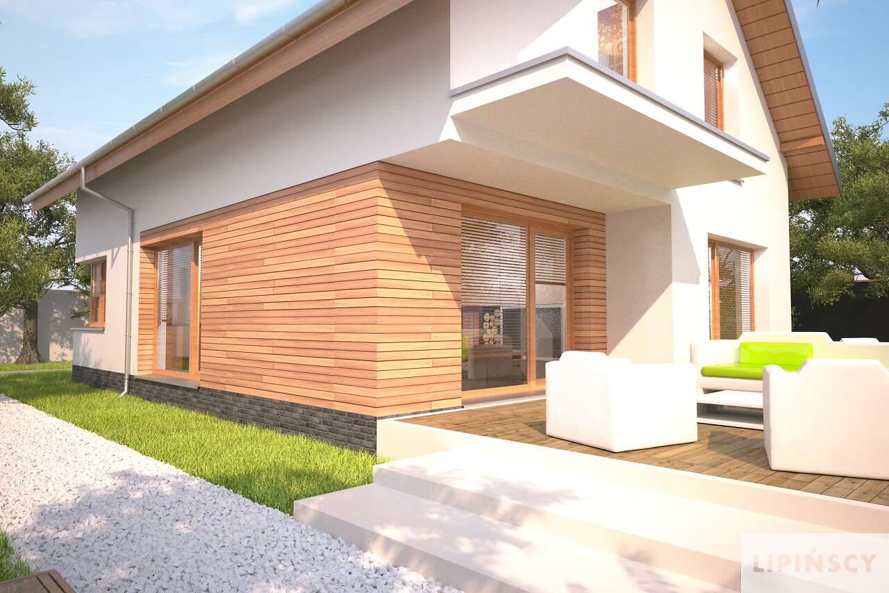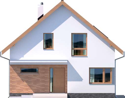 Energooszczędny dom z użytkowym poddaszem, którego cechą charakterystyczną jest wejście od szczytu, co pozwala na jego lokalizację nawet na niezbyt szerokiej działce. Dzięki prostej bryle i dwuspadowemu dachowi, jest niedrogi w budowie. Energooszczędna technologia pozawala na komfortową i niedrogą eksploatację. Na parterze znajdują się takie pomieszczenia jak otwarta na salon kuchnia, duży pokój dzienny z miejscem na wygodny, rodzinny stół, wygodna sypialnia, łazienka i kotłownia. Na poddaszu przewidziano trzy sypialnie, dużą łazienkę oraz podręczną garderobę.