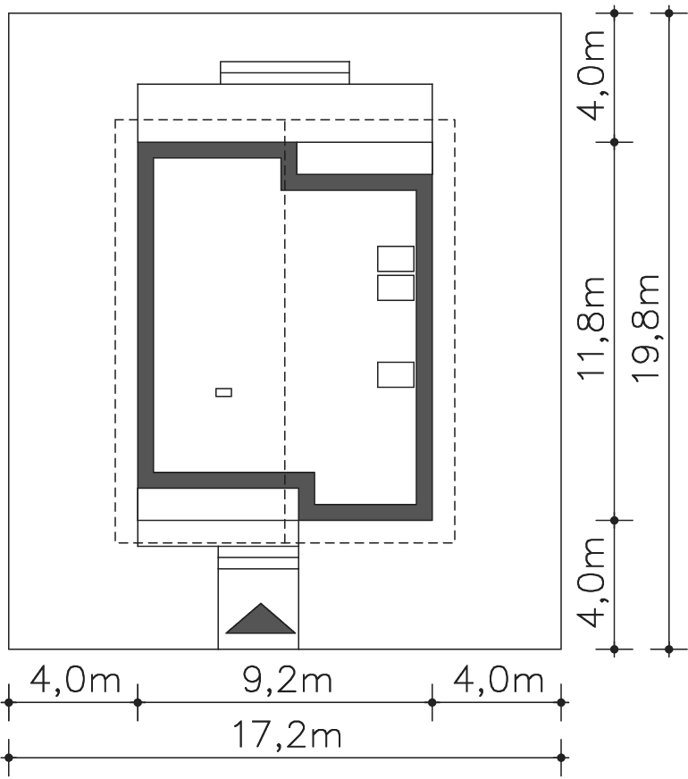 Grafika przedstawia minimalne wymiary działki. Aby sprawdzić, czy dom może być realizowany na konkretnej działce należy uzyskać Wypis i Wyrys z Miejscowego Planu Zagospodarowania Przestrzennego lub jeśli na danym terenie nie ma planu – Decyzję o warunkach zabudowy. Wszystkie projekty wymagają adaptacji do warunków miejscowych przez projektanta lokalnego.