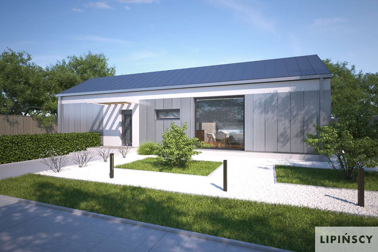 Niewielki, nowoczesny dom parterowy z dwuspadowym dachem, o zwartej bryle, przewidziany w standardzie energooszczędnym, dzięki czemu nie jest drogi w eksploatacji, a przy tym wygodny i funkcjonalny. Dzięki niewielkiej szerokości może być zlokalizowany nawet na bardzo wąskiej działce. Idealnie nadaje się dla pary lub niewielkiej rodziny. W domu zaplanowano wygodną sypialnię małżeńską, przytulny salon, doświetlony dużym oknem, aneks kuchenny z częścią jadalnianą, łazienkę oraz dodatkowy pokój, doskonale sprawdzający się jako gabinet lub pokój gościnny. Projekt zapewne zwróci uwagę Inwestorów, którzy szukają niewielkiego, wygodnego i nowoczesnego domu, który można wybudować na działce, gdzie płaski dach nie jest dopuszczony. W projekcie przewidziano ogrzewanie kotłem na gaz. Możliwa jest zmiana ogrzewania na pompę ciepła.