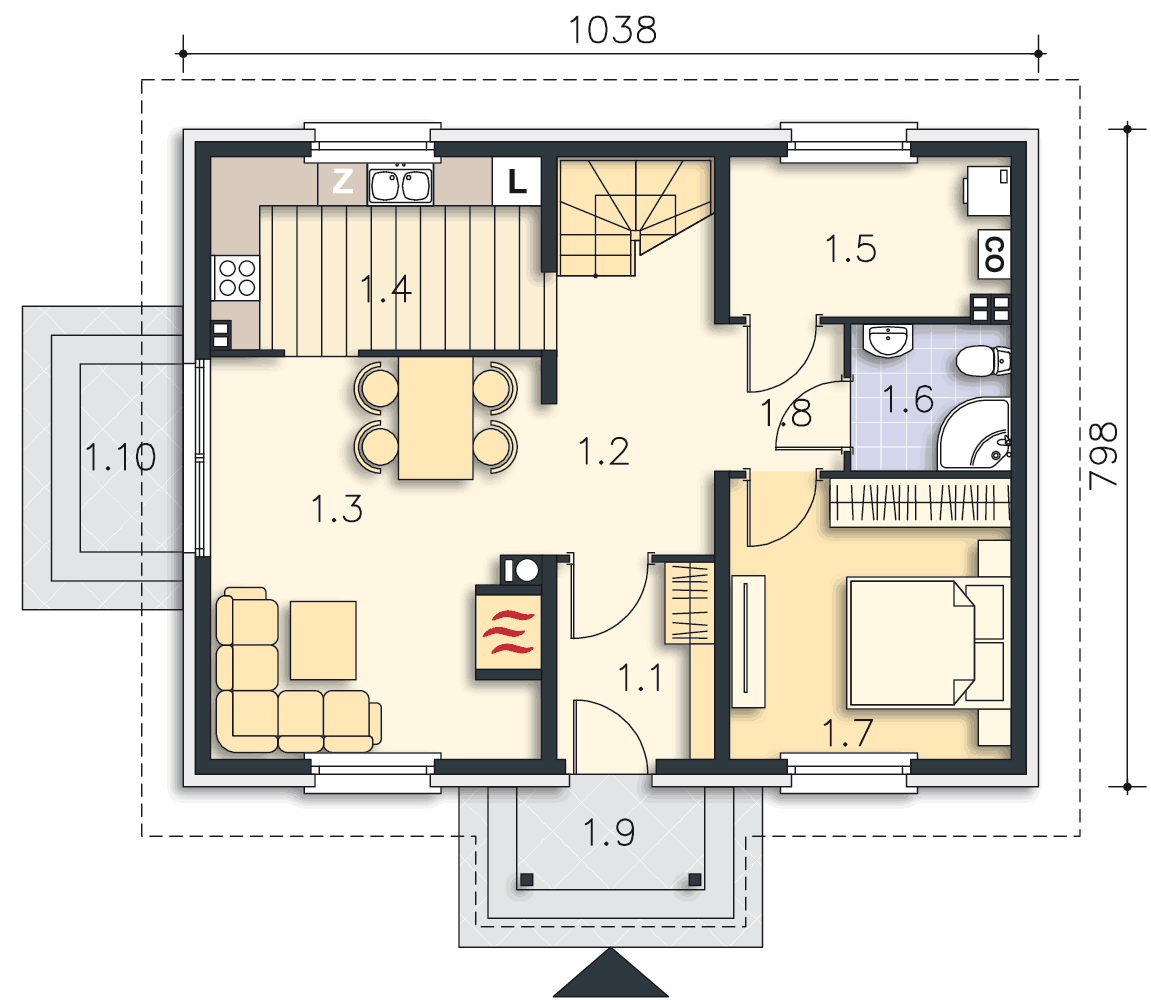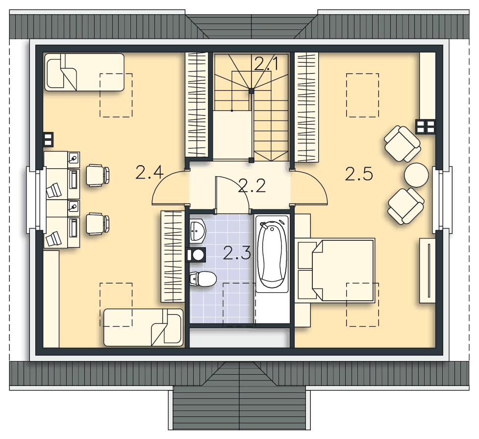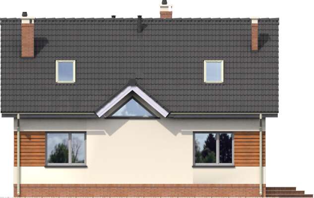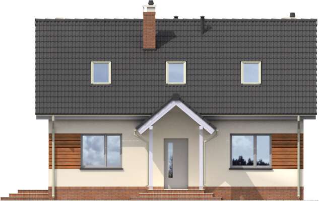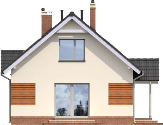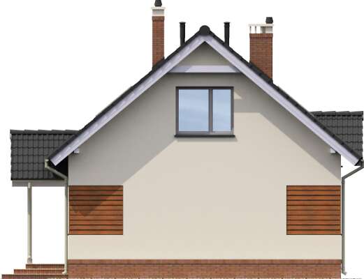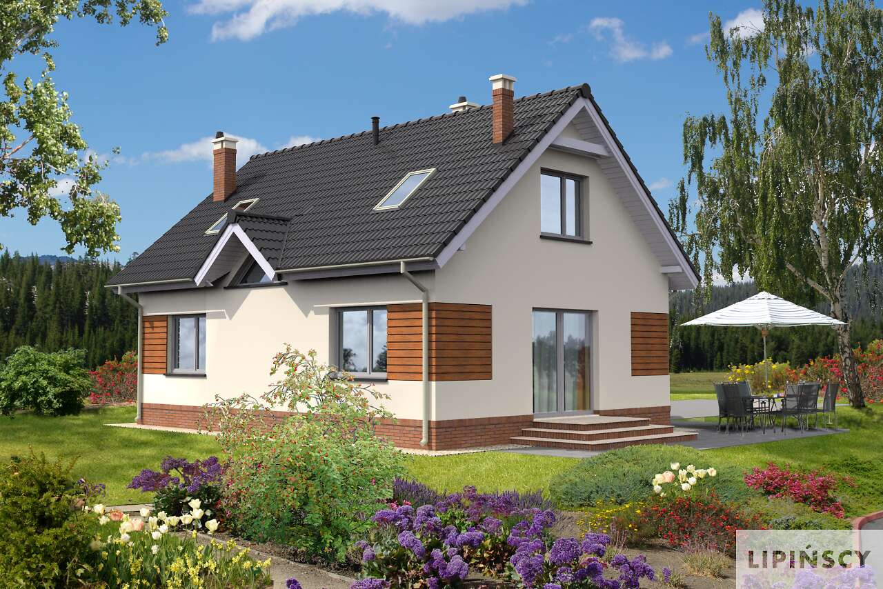 Zgrabny, niewielki dom z użytkowym poddaszem. Zadaszone wejście prowadzi do hallu, otwartego na salon oraz kuchnię z wydzieloną częścią jadalną. Takie rozwiązanie daje poczucie przestrzeni i gwarantuje wygodę mieszkańcom. Na parterze mieści się też sypialnia, łazienkę oraz pomieszczenie z kotłem c.o. Poddasze może stać się królestwem dzieci lub, w zależności od potrzeb, także zacisznym miejscem wypoczynku rodziców. Duża łazienka, przeznaczona dla tej prywatnej strefy, gwarantuje maksimum wygody. Prosta bryła budynku i dwuspadowy dach czyni ten dom tanim w budowie, a zastosowane drewniane elementy elewacji nadają mu ciekawego wyglądu.