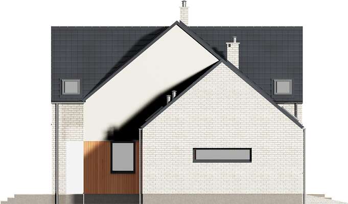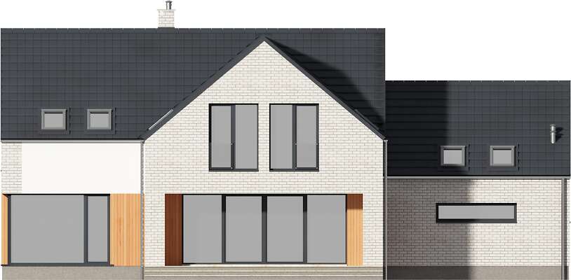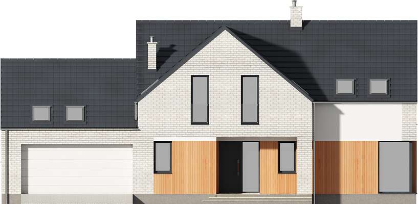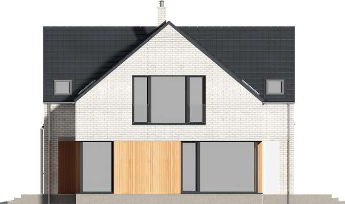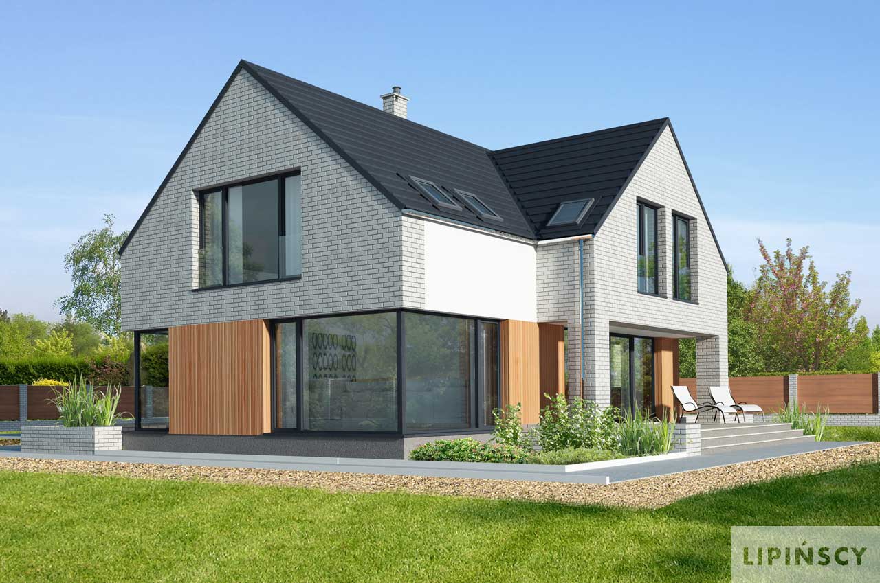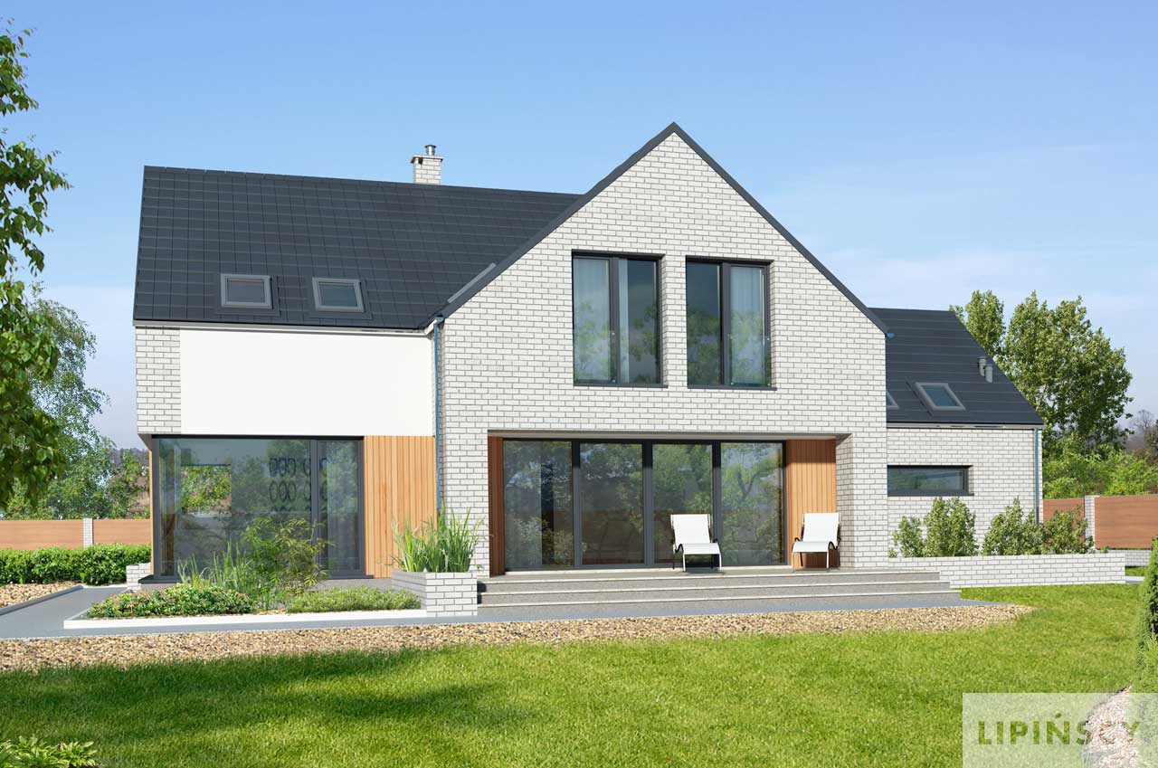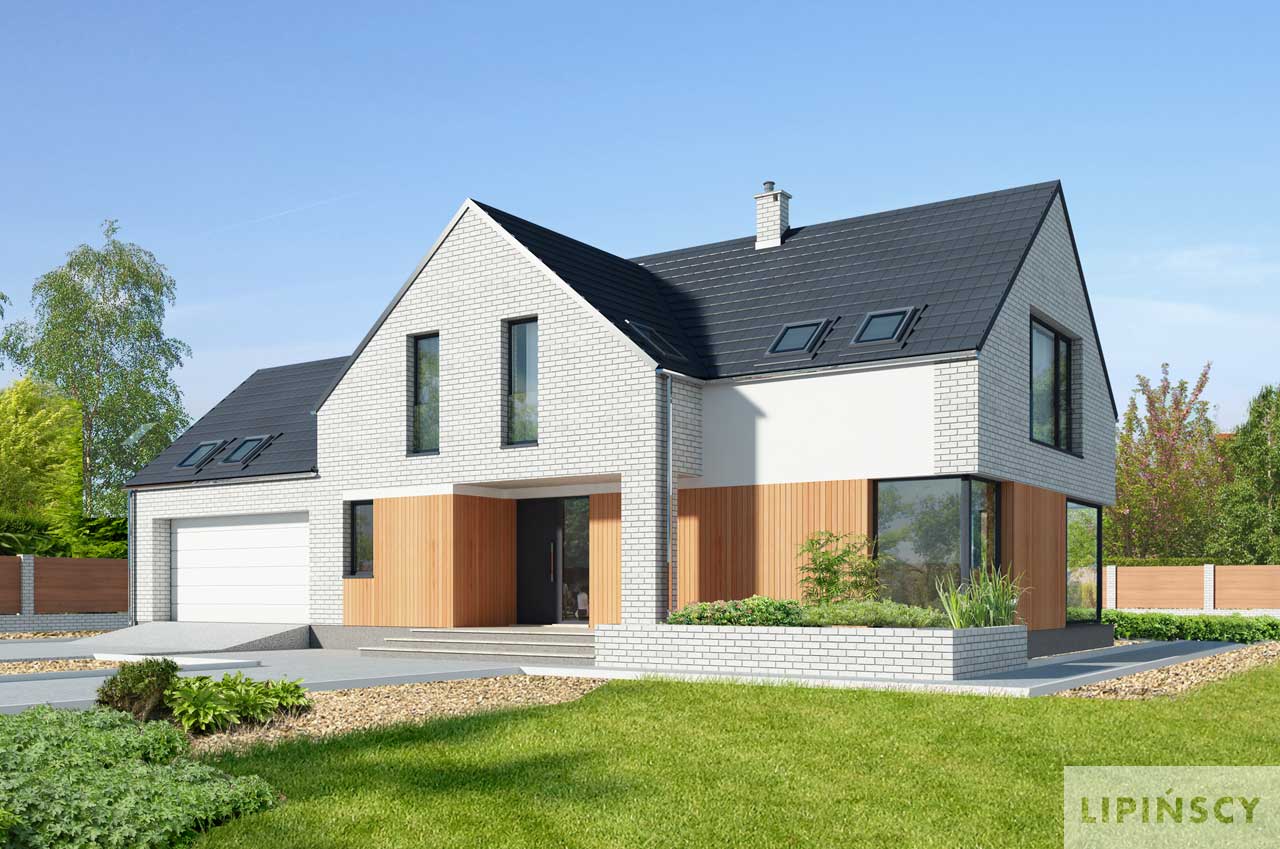 Piękny dom z użytkowym poddaszem, wyróżniający się elegancką bryłą o nowoczesnym rysie, w której uwagę zwracają duże, narożne okna, doskonale doświetlające wnętrze. Parter to część wspólna domu, w której domownicy mogą przyjemnie spędzić czas. Do ich dyspozycji jest obszerny, połączony z jadalnią salon i funkcjonalna kuchnia, a także wygodny gabinet, doskonała propozycja dla osób pracujących w domu. W razie potrzeby gabinet może stać się pokojem gościnnym. Na parterze znajduje się także toaleta oraz kotłownia z piecem gazowym. Z niej można przejść do dużego garażu. Poddasze to wyraźna część wspólna. Wyodrębniono tutaj dużą, wygodną sypialnię małżeńską, z własną łazienką oraz garderobą. Znajdują się tu także dwie inne sypialnie, wspólna łazienka oraz pralnia.