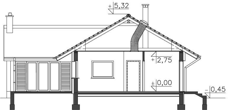 W projekcie został zastosowany komin systemowy Schiedel Rondo Plus o średnicy 18c. W przypadku wykonania kominów w wersji tradycyjnej, zaleca się wykonanie przewodów dymowych z wkładem ceramicznym szkliwionym, spalinowy od kotła grzewczego uzupełnić rurą ze stali nierdzewnej Ø110. Wysokość komina wynosi 5,5 m.