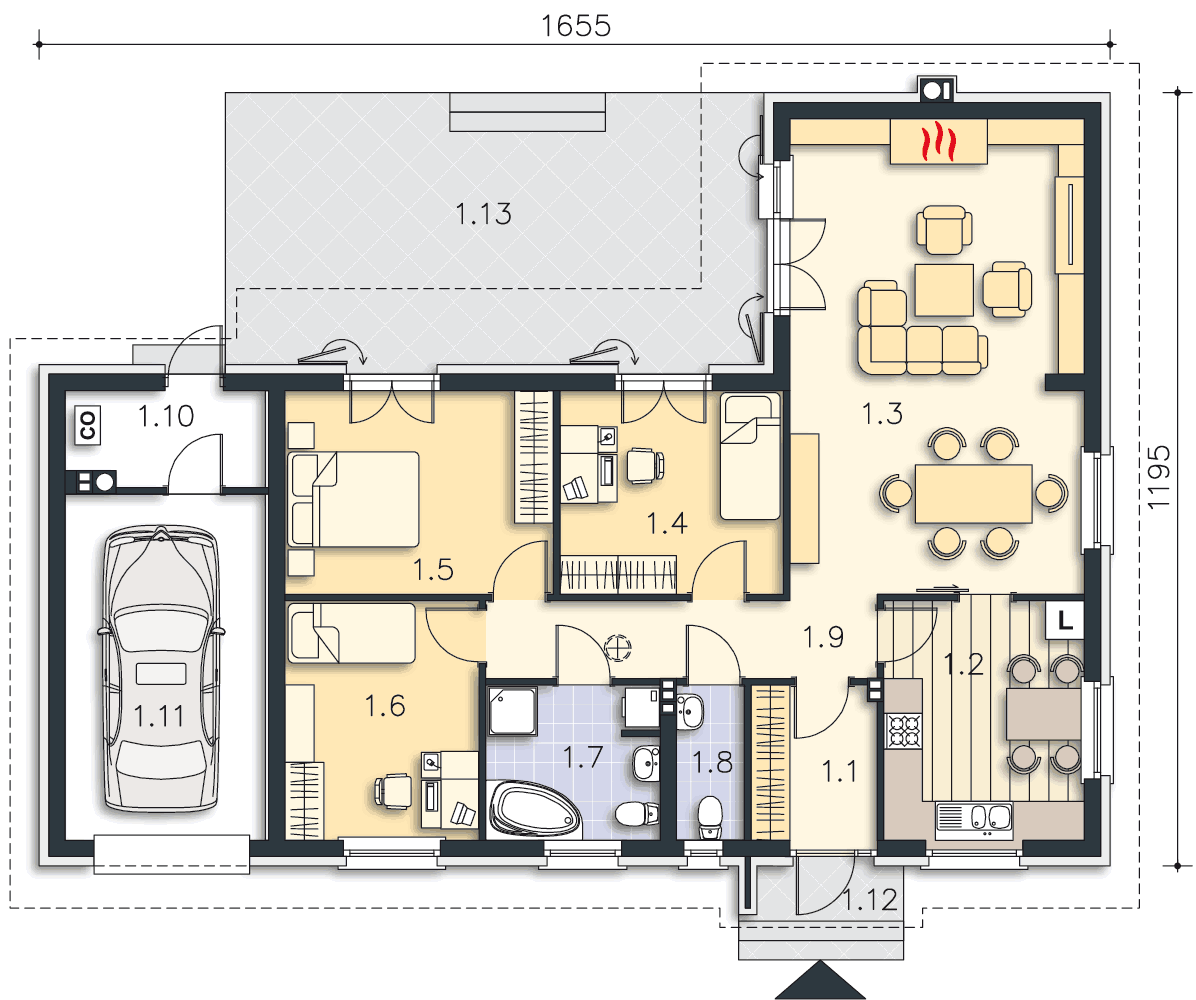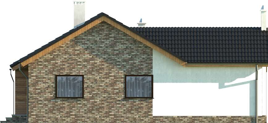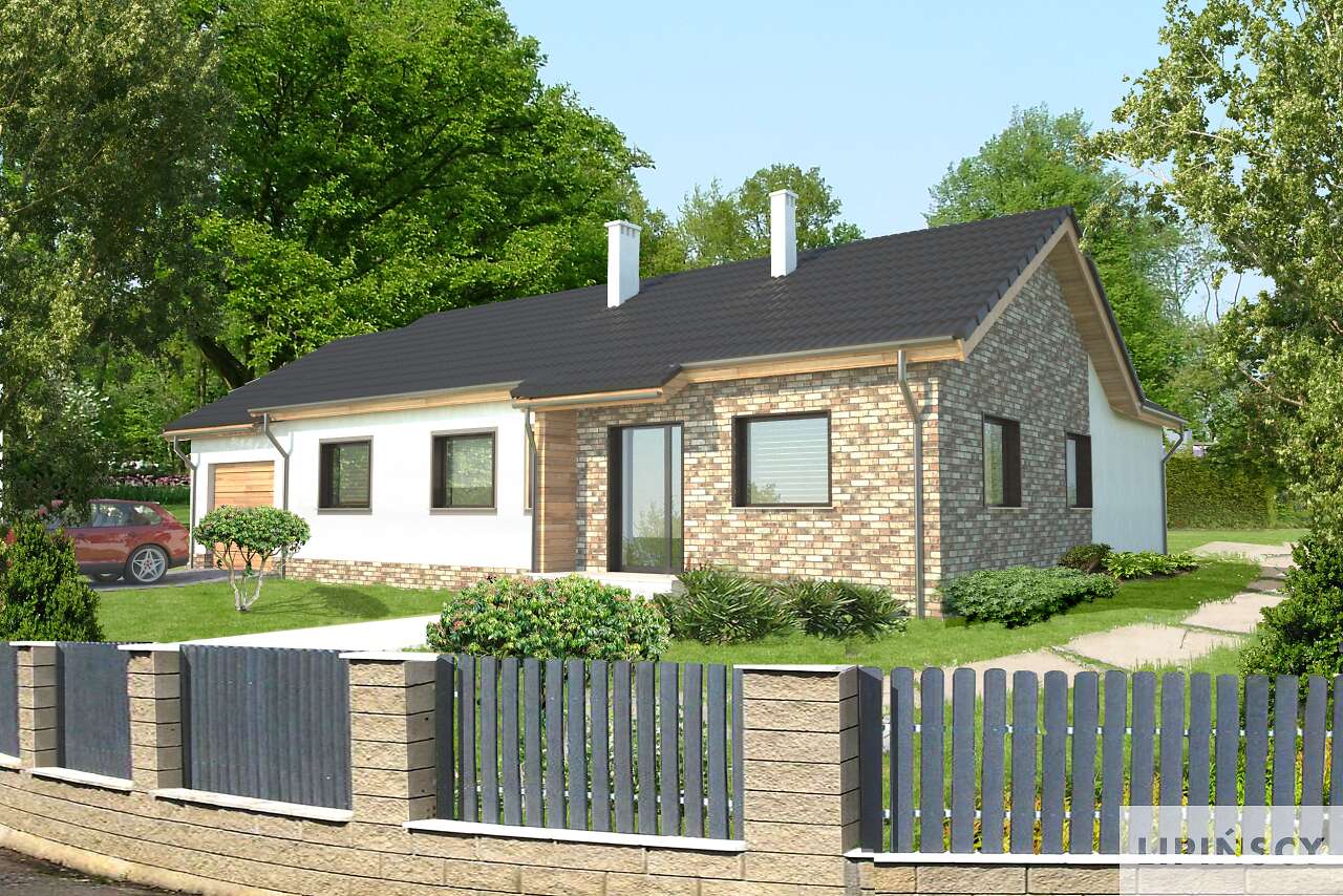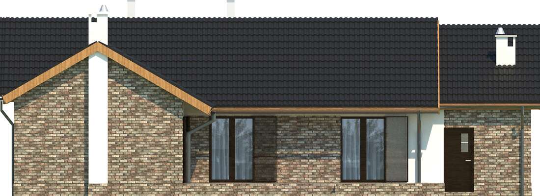 Niewielki dom parterowy, o ciekawym i funkcjonalnym układzie. Duży, jasny salon z wydzieloną jadalnią, trzy sypialnie, kuchnia, którą można zamknąć lub zostawić otwartą, łazienka oraz dodatkowa toaleta gwarantują wygodne użytkowanie. Ozdobą domu jest piękny taras, na który można wyjść zarówno z salonu, jak i z dwóch innych pokoi. W projekcie zaplanowano jednostanowiskowy garaż oraz pomieszczenie gospodarcze z kotłownią, do którego wejście zlokalizowano z tyłu budynku. Duże elementy elewacji, wykonane z cegły klinkierowej, pięknie podkreślają prostą, elegancką bryłę.