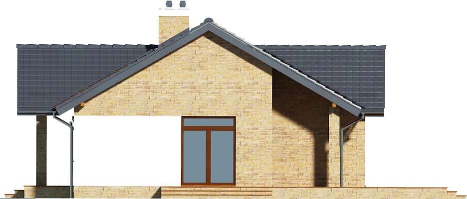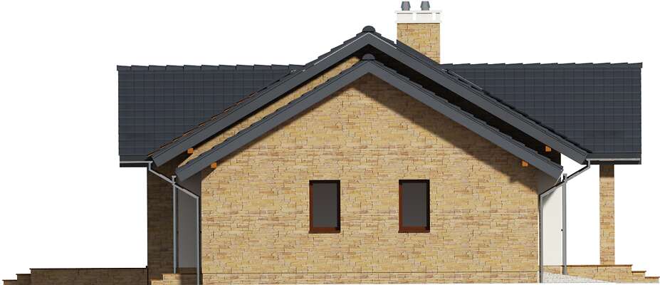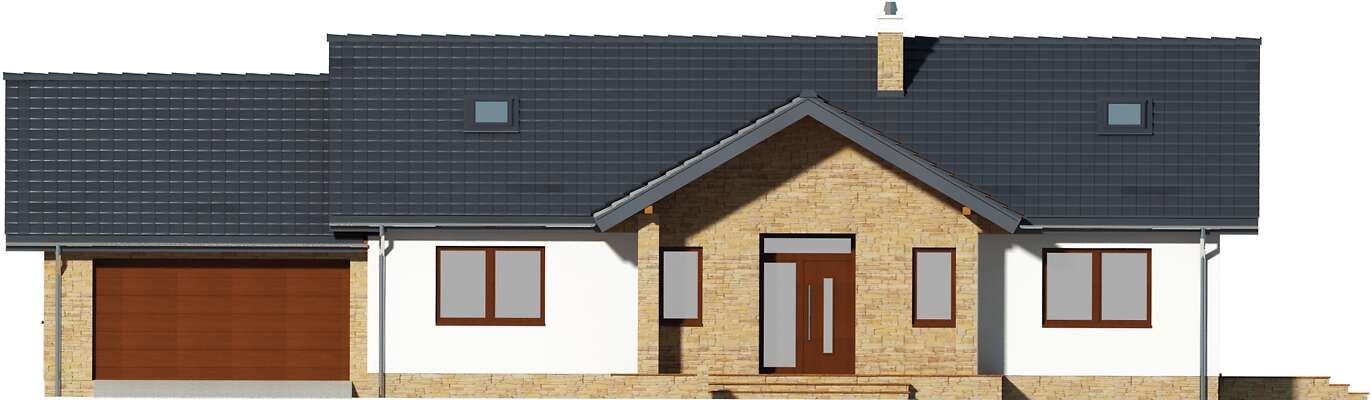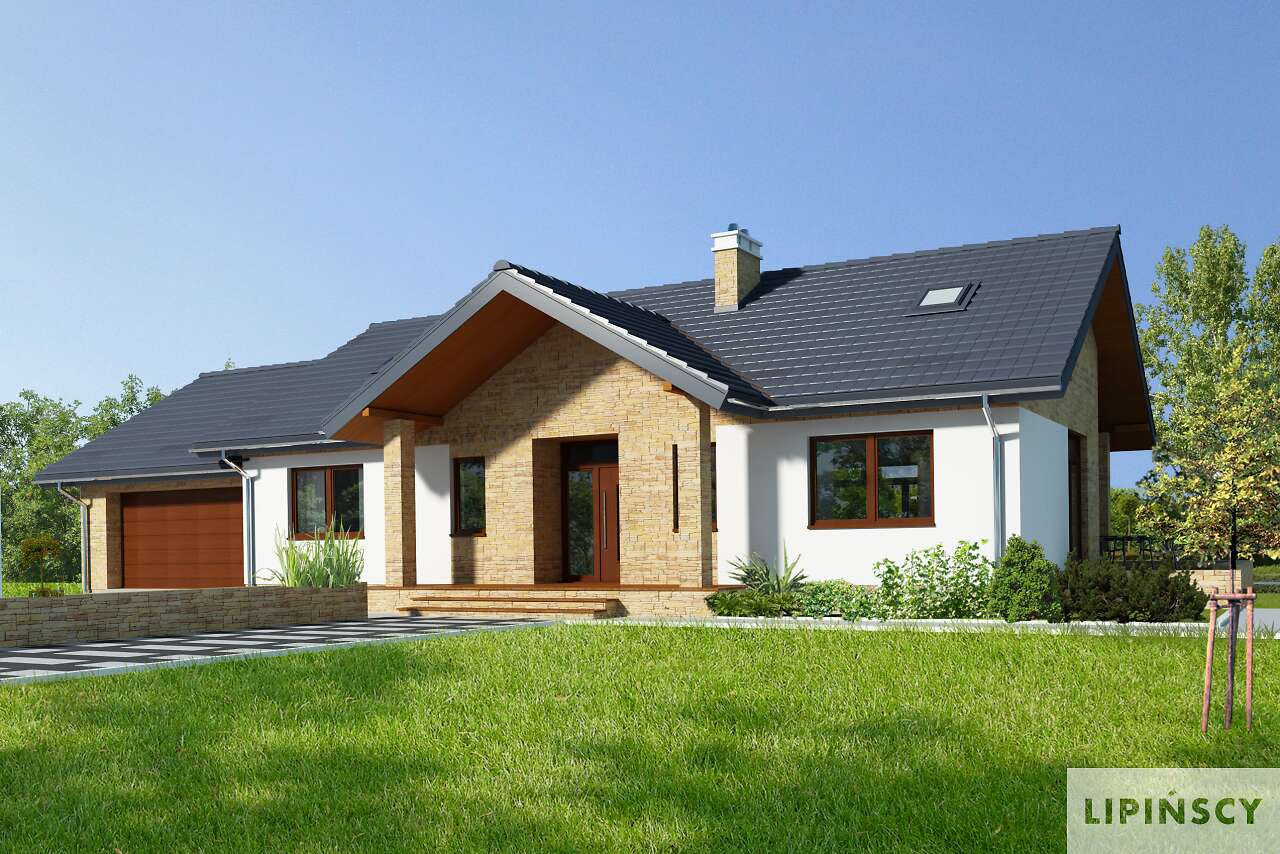 Wygodny dom parterowy, energooszczędny, o prostej bryle i dwuspadowym dachu, co czyni go niedrogim w budowie i eksploatacji. Uwagę zwraca z pewnością elegancka elewacja o nowoczesnym rysie i przepiękny taras, który dzięki dużym przeszkleniom stanowi przedłużenie domu. Domownicy, którzy lubią spędzać czas razem, docenią to, że strefę dzienną stanowi przestronny salon, połączony z wygodną jadalnią i funkcjonalną kuchnią. Strefa nocna została natomiast bardzo wyraźnie oddzielona, a w jej skład wchodzą trzy sypialnie, w tym jedna z własną łazienką i garderobą. Każda pani domu doceni zapewne również to, że obok kuchni zaprojektowano wygodną pralnię, która może być również podręczną spiżarnię. W bryłę budynku wkomponowano duży garaż, za którym znajduje się zaplecze gospodarcze.