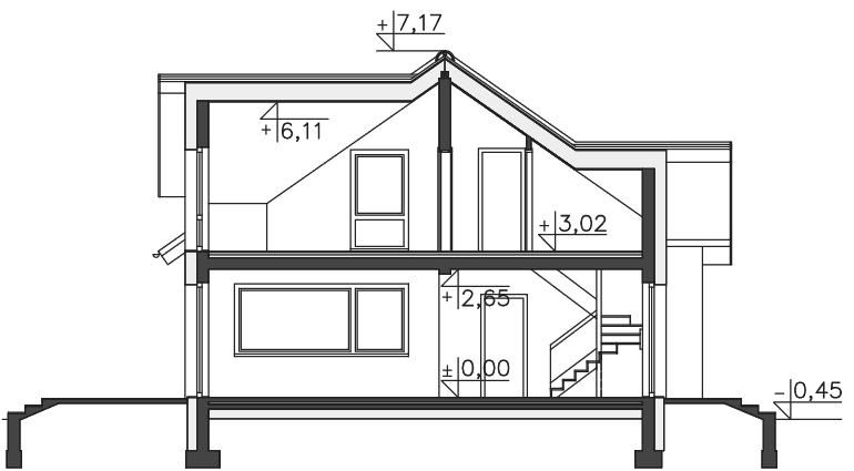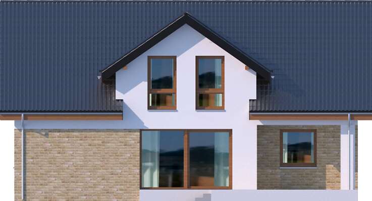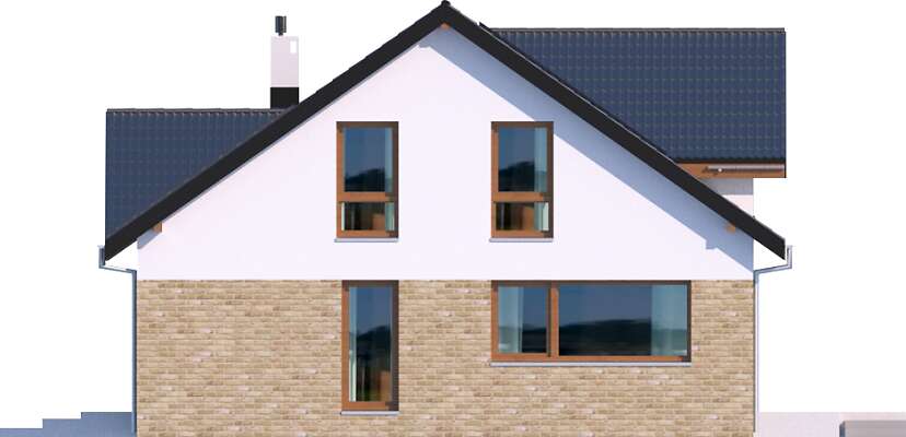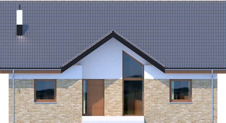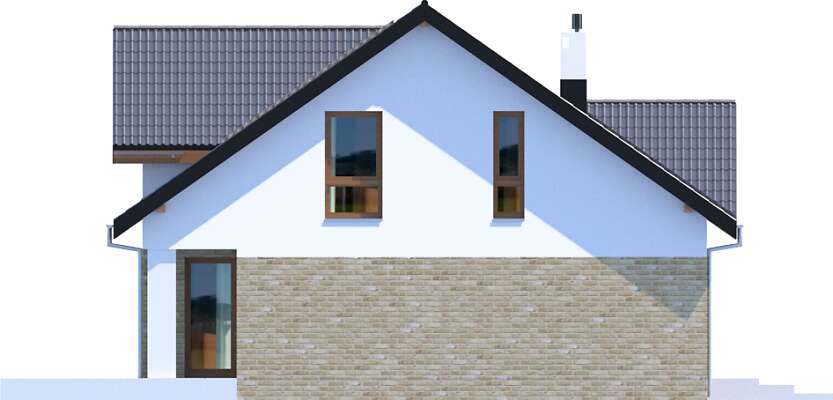 Przód domu można zobaczyć na elewacjach na karcie projektu poniżej działki i przekroju.