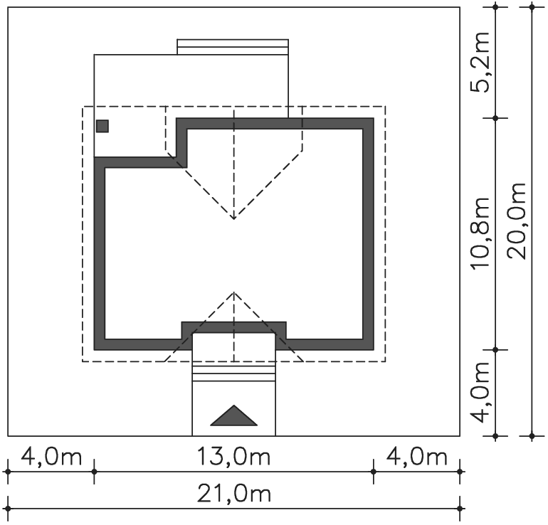 Grafika przedstawia minimalne wymiary działki. Aby sprawdzić, czy dom może być realizowany na konkretnej działce należy uzyskać Wypis i Wyrys z Miejscowego Planu Zagospodarowania Przestrzennego lub jeśli na danym terenie nie ma planu – Decyzję o warunkach zabudowy. Wszystkie projekty wymagają adaptacji do warunków miejscowych przez projektanta lokalnego.