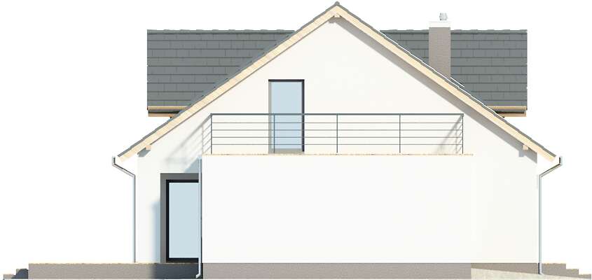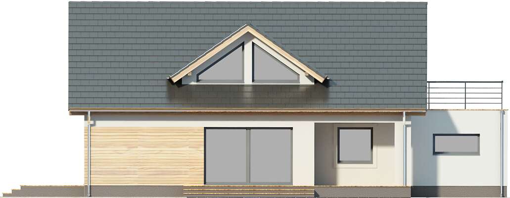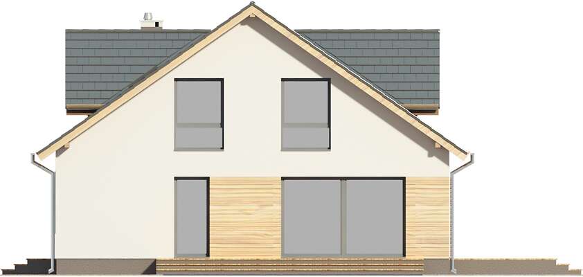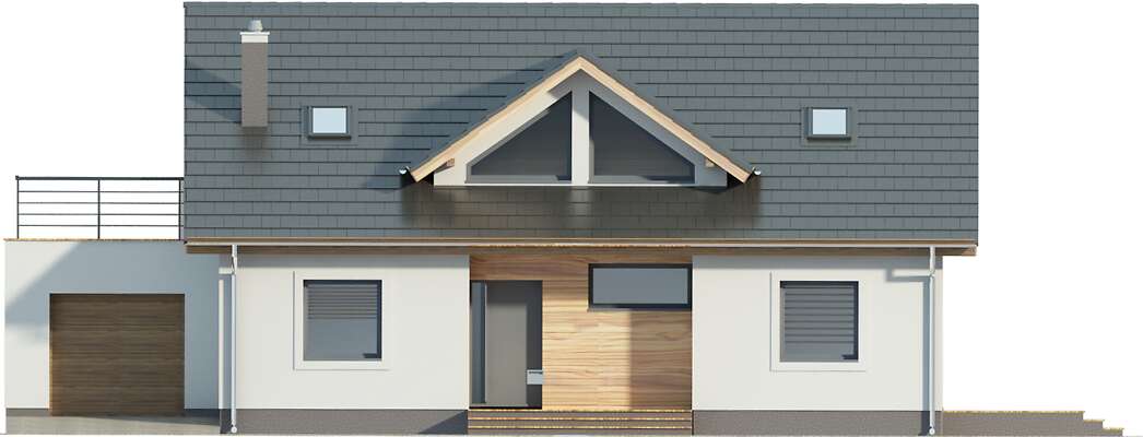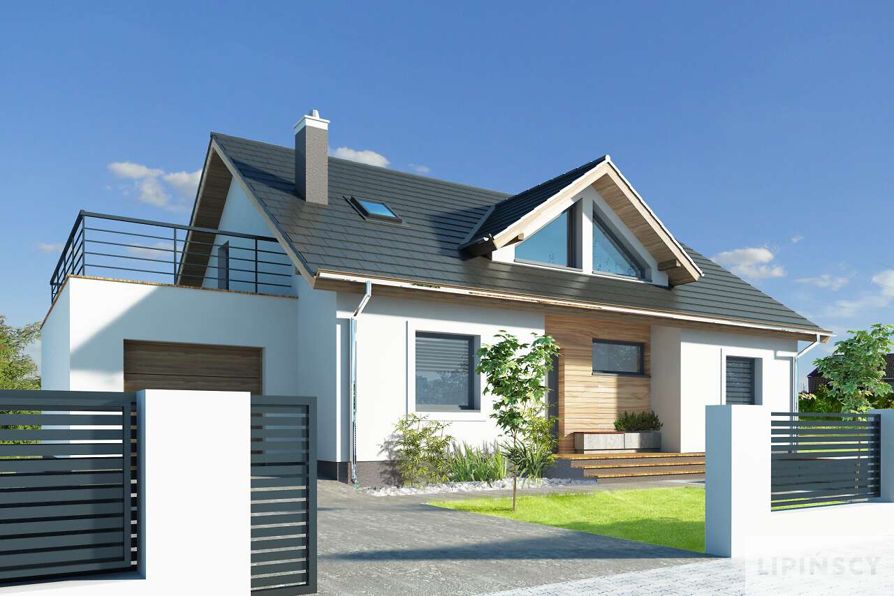 Wygodny dom energooszczędny z użytkowym poddaszem o nowoczesnej prostej bryle z dwuspadowym dachem, w której uwagę zwracają symetrycznie umieszczone, efektowne trójkątne lukarny oraz dwa tarasy, w tym jeden częściowo zadaszony. Wnętrze zostało zaprojektowane bardzo funkcjonalnie. Przewidziano przejście z garażu do domu przez duże pomieszczenie gospodarcze, połączone ze spiżarką i kuchnią, która z kolei wraz z salonem zwrócona jest w stronę ogrodu. Przy wejściu znajdują się wydzielone schody, a za nimi odosobniony pokój z wyjściem na taras boczny, idealny do pracy w domu. Na poddaszu mieszkańcy mają do dyspozycji trzy sypialnie, łazienkę oraz antresolę z kącikiem rekreacyjnym lub dodatkowym miejscem do pracy. Nad jednostanowiskowym garażem zaplanowano nowocześnie zaaranżowany taras.