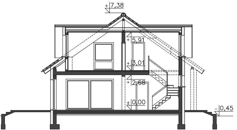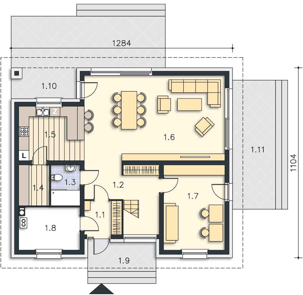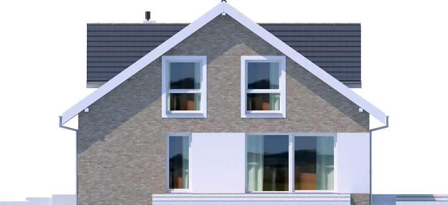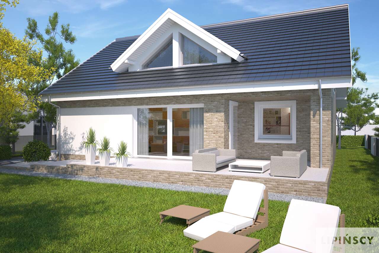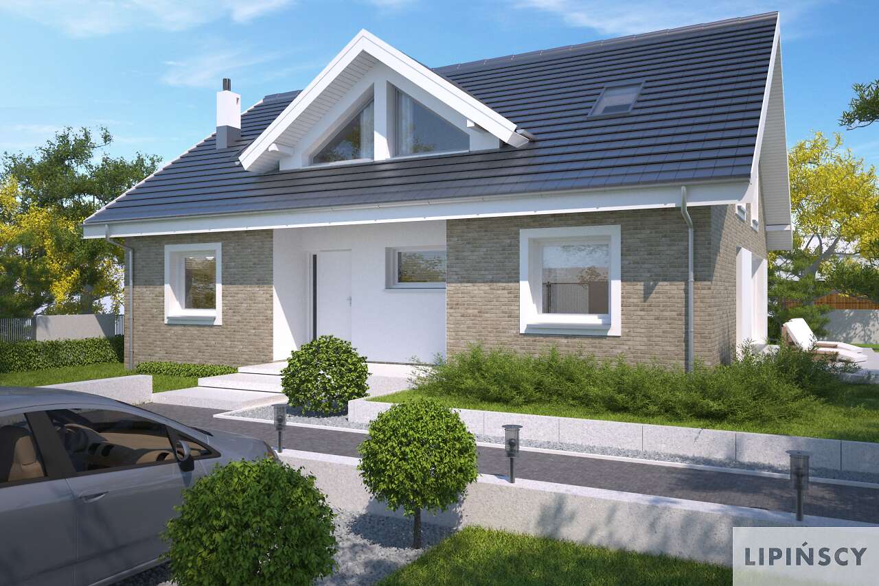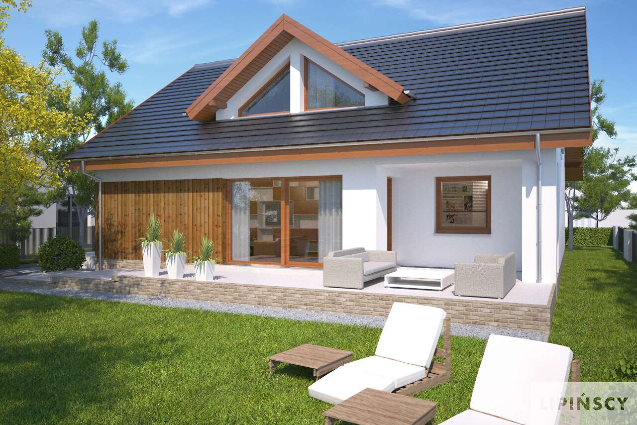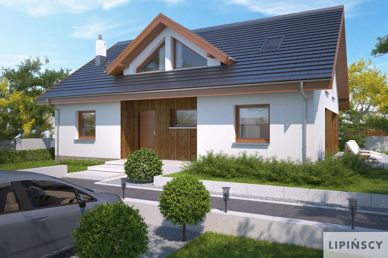 Nowoczesny dom energooszczędny, z częścią wspólną na parterze i wyraźnie wydzieloną częścią prywatną na poddaszu. W części dziennej mieszkańcy mają do dyspozycji duży, jasny salon z częścią jadalną i otwartą na niego kuchnią i podręczną spiżarnią, a także dodatkowy pokój, mogący służyć jako gabinet lub pokój gościnny. Jest tu też łazienka i pomieszczenie gospodarcze z kotłem gazowym. Poddasze podzielono na trzy ustawne sypialnie i dużą łazienkę. Znajduje się tu także antresola, gdzie można zlokalizować kącik wypoczynkowy.